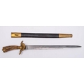 A German hunting hanger: with 40cm etched blade decorated with hunting scenes, brass cross guard with deer slot terminals and antler grip, contained in a leather and brass mounted scabbard.