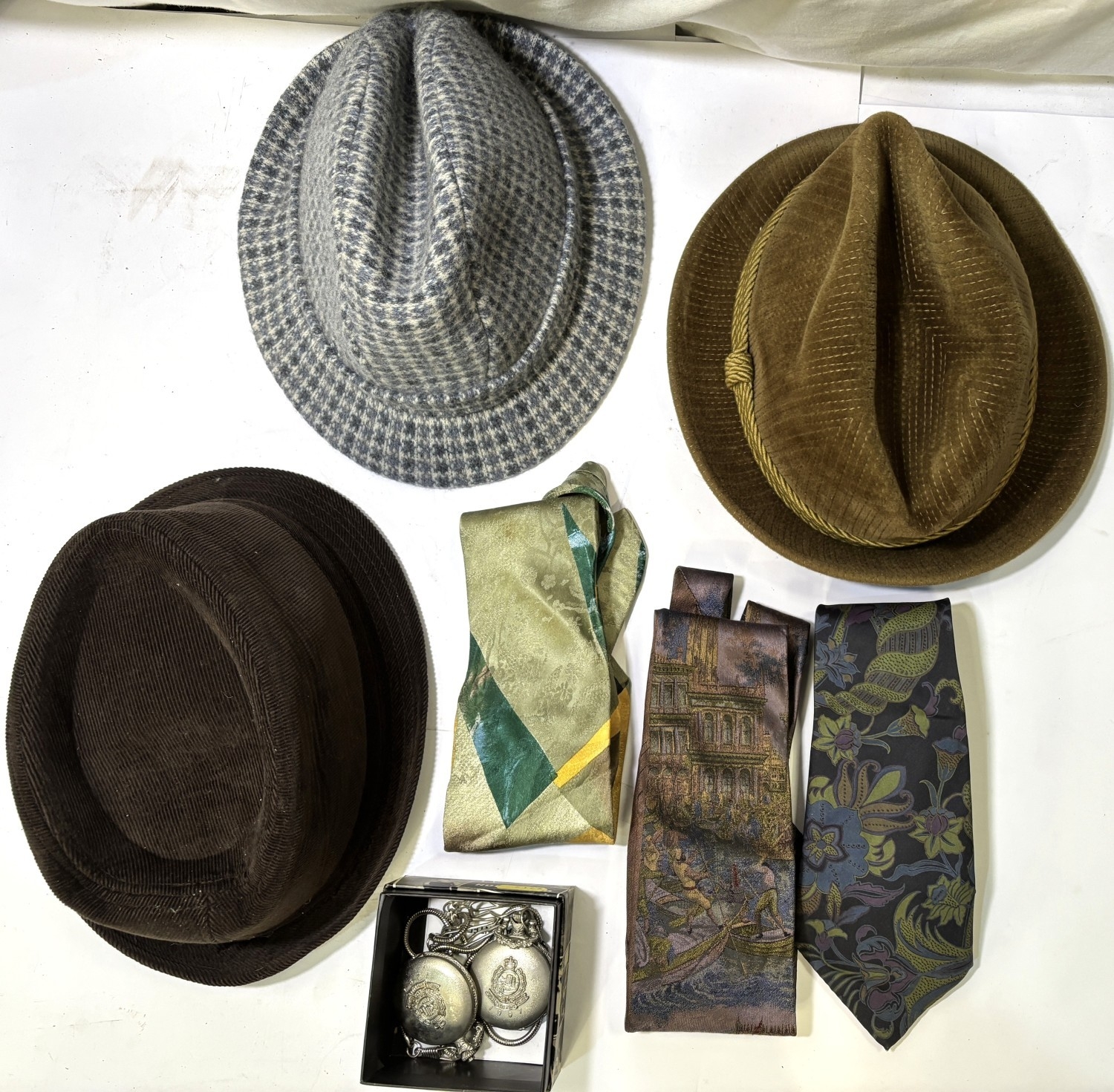 Three Trilby hats; 3 silk ties; 6 Teddy bears; a pendulum chiming clock.