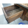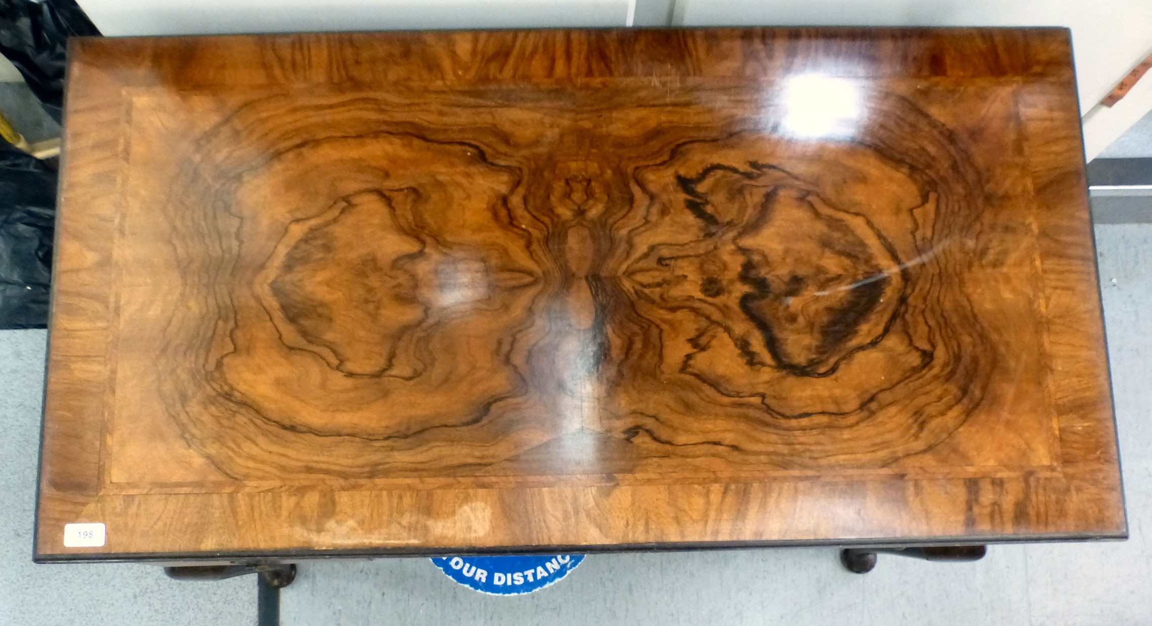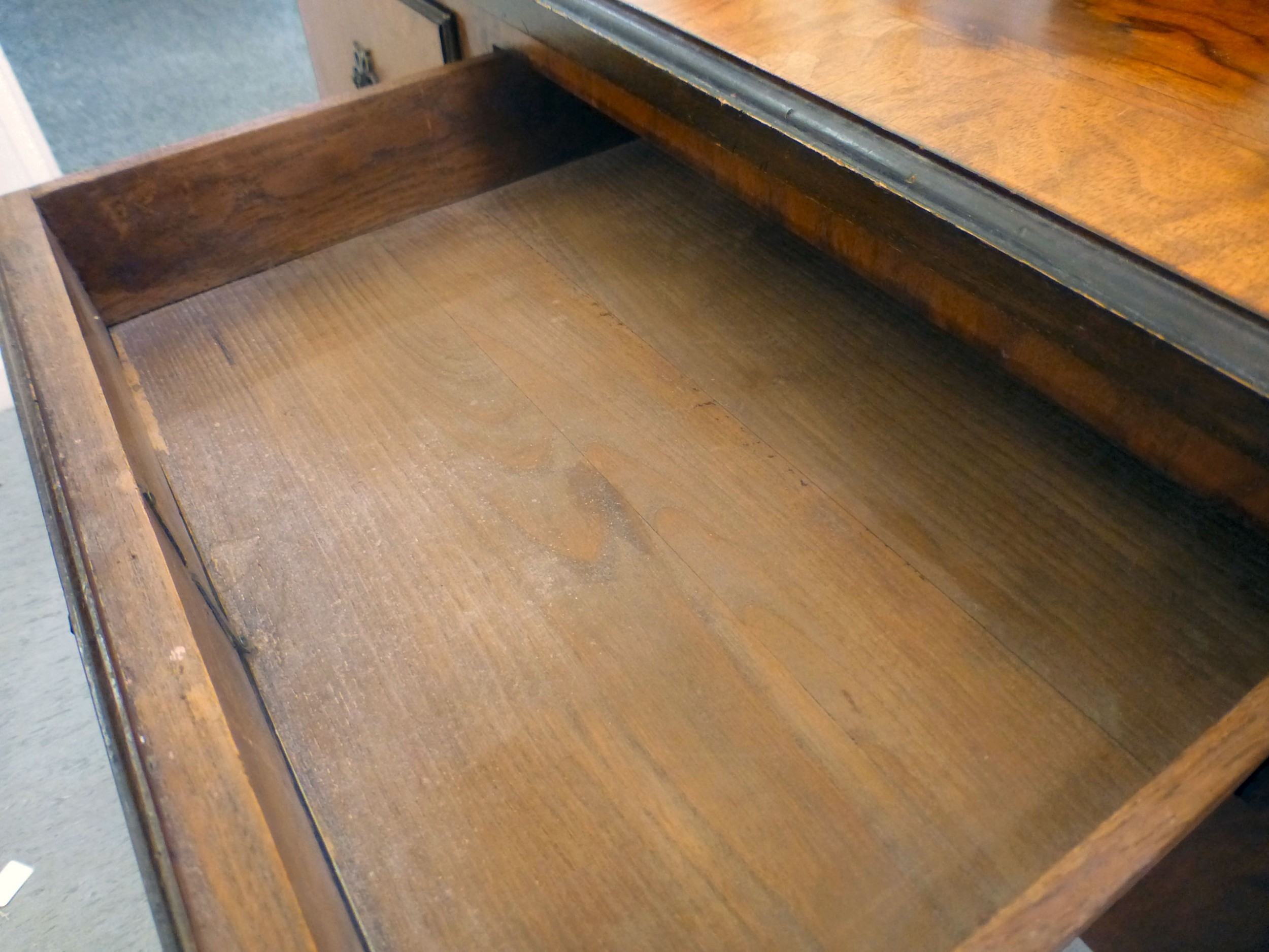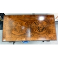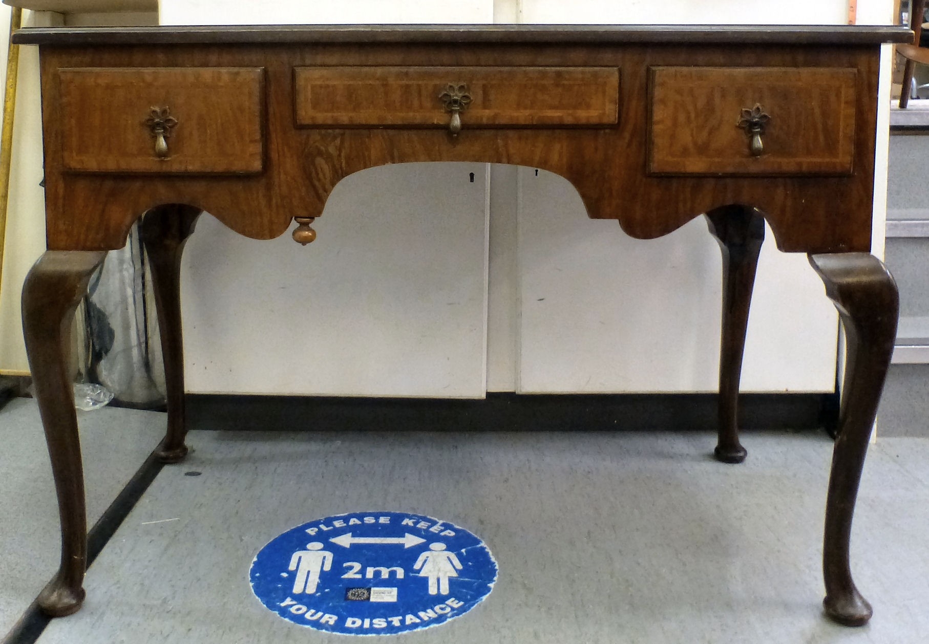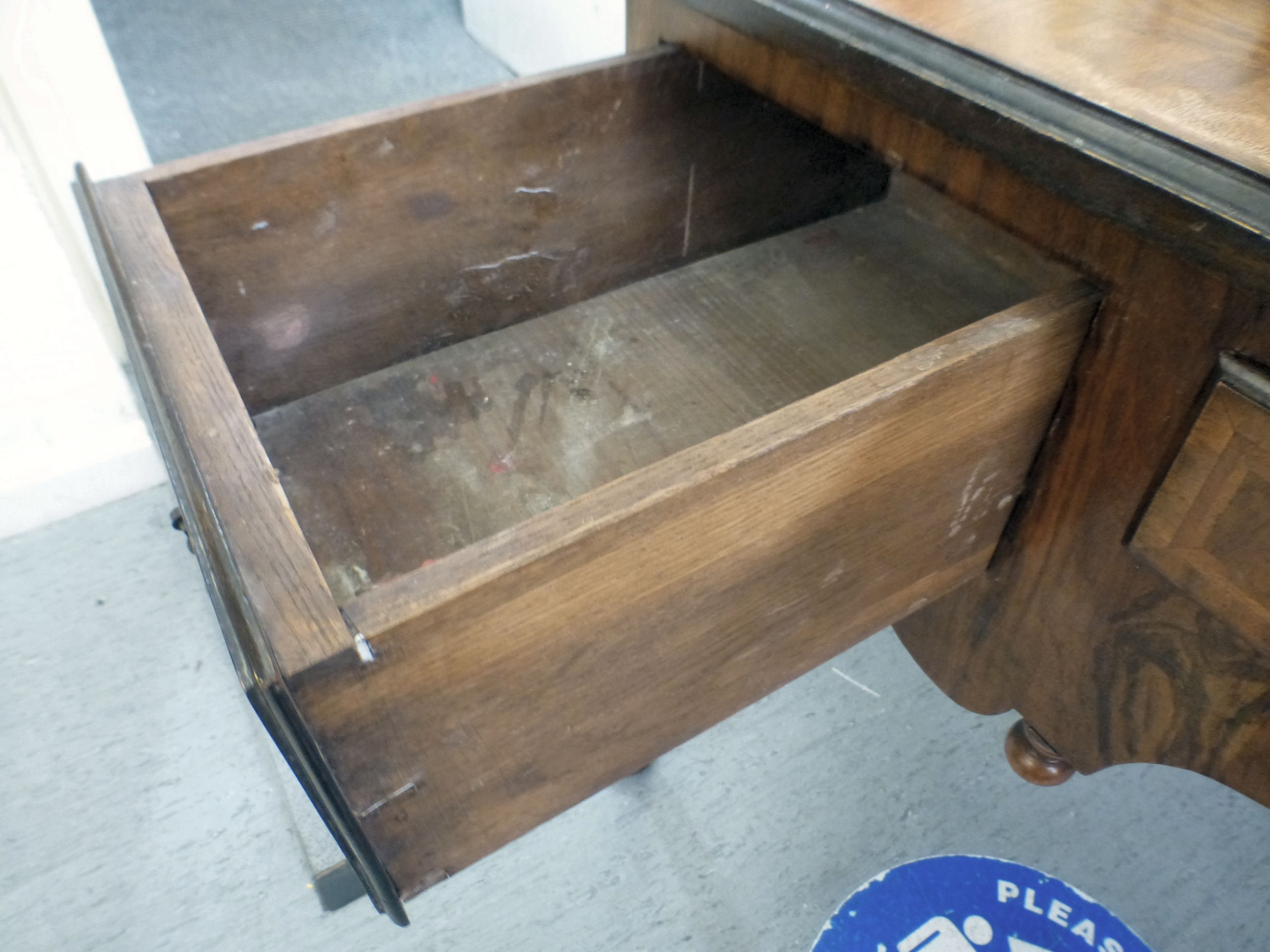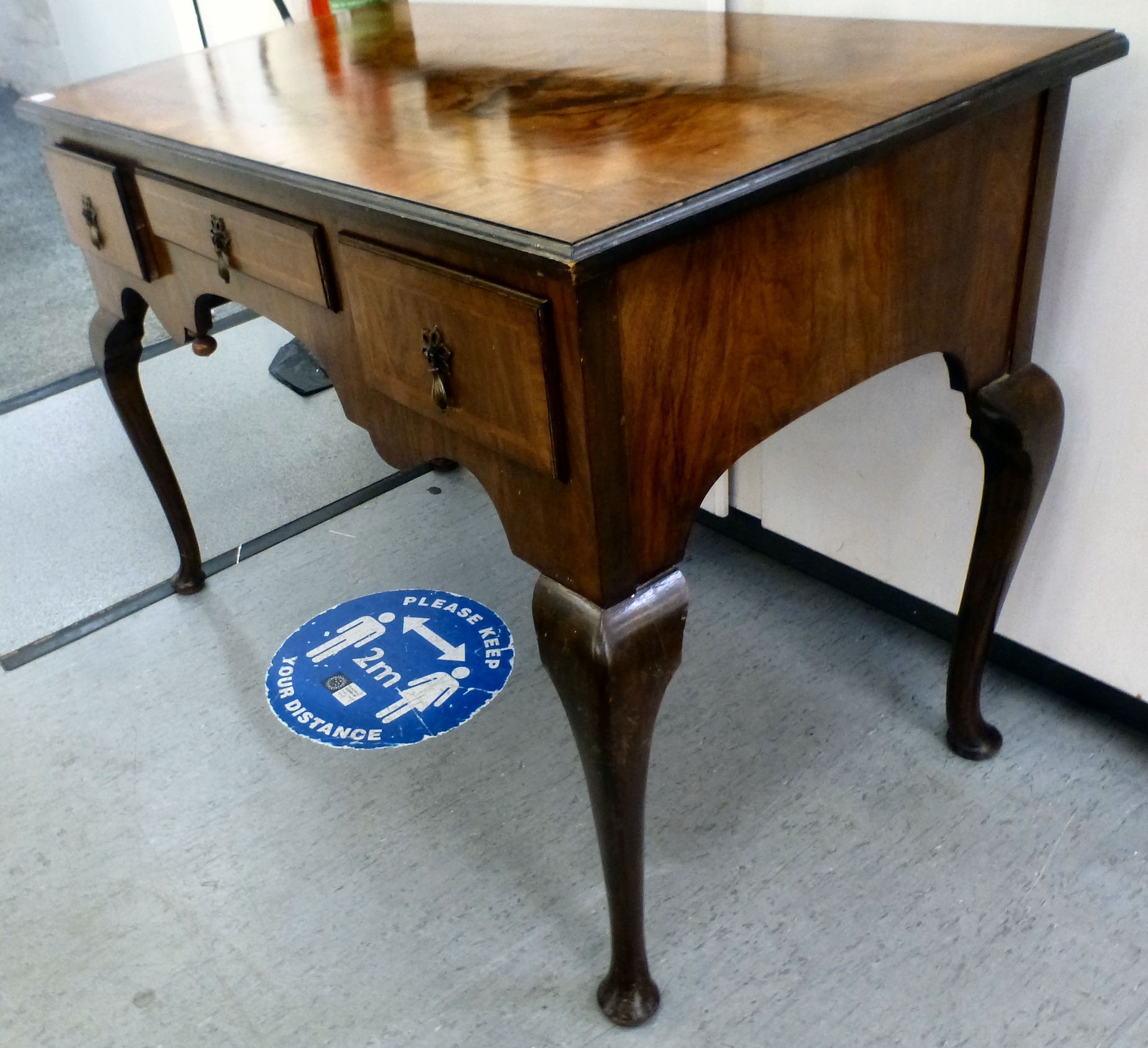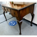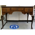 An early 20thC walnut veneered side table with three drawers, raised on cabriole legs and pad feet 29.5"h 42.5"w