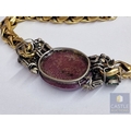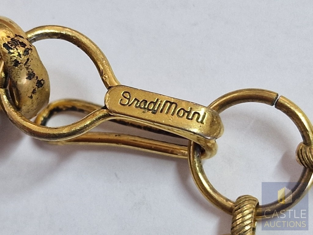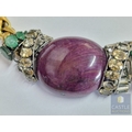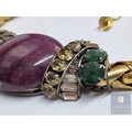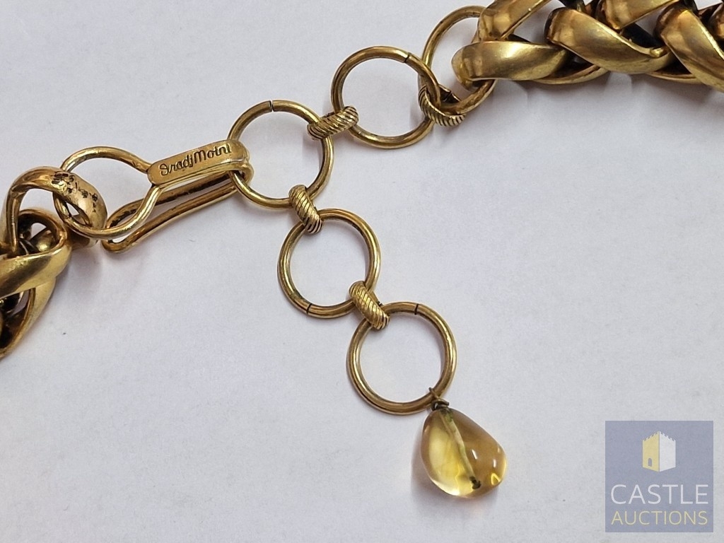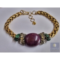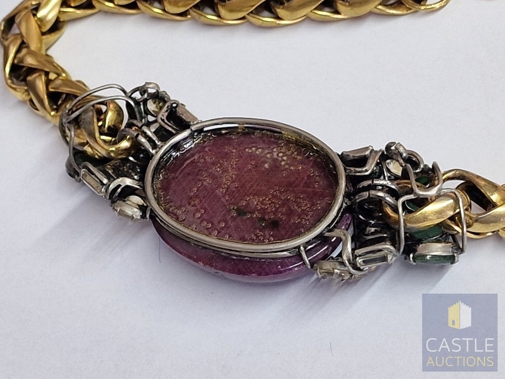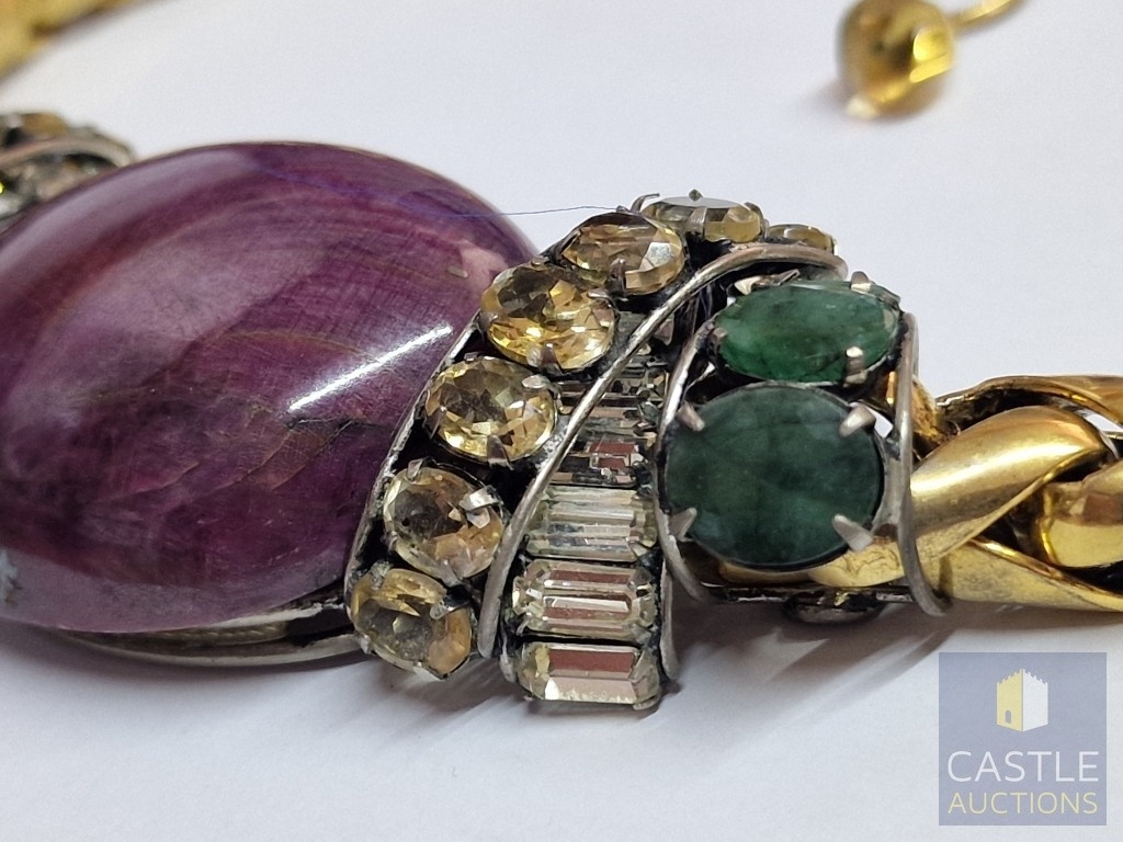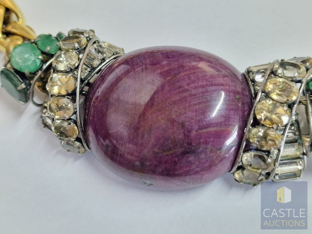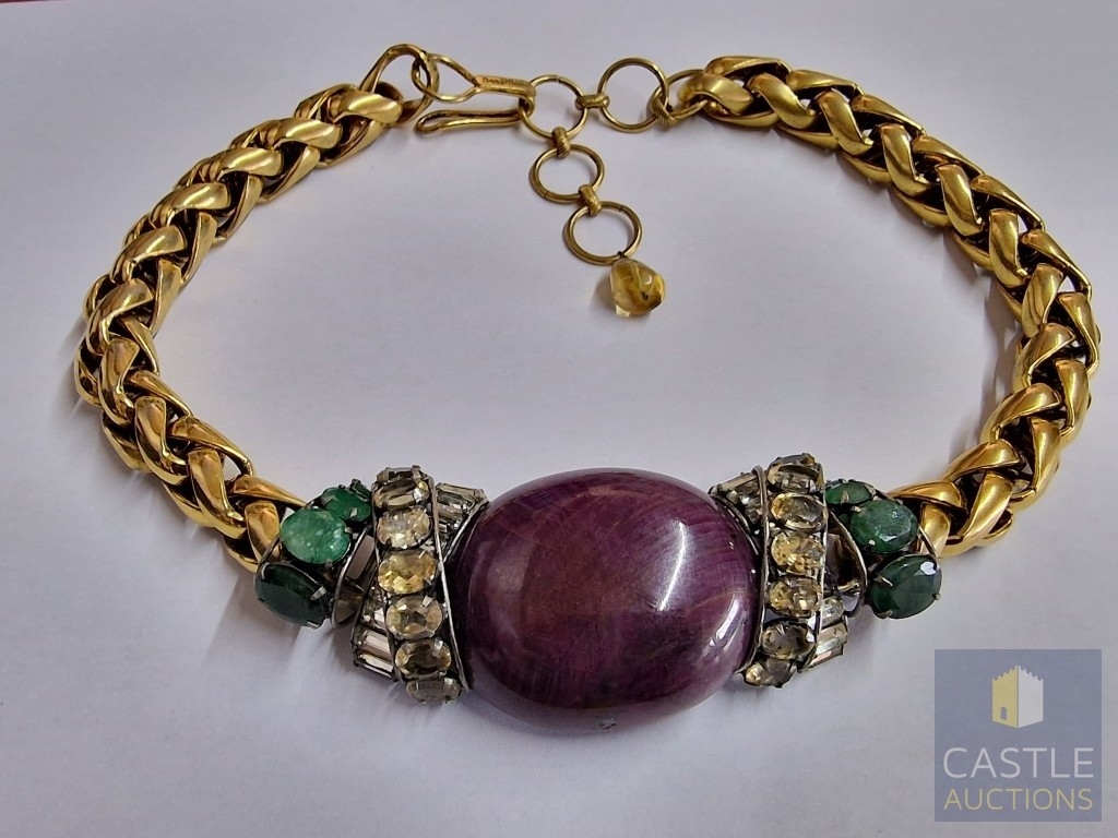 'Iradj Mioni' Statement Necklace, from New York Based Iranian Designer, with Large Cabochon Centre Stone, Flanked by Green and Clear Stones on Substantial Gilt Metal Necklace, (Approx. Total Weight 280g, L: 43-50cm, Main Stone 48 x 38 x 13mm Overall)