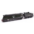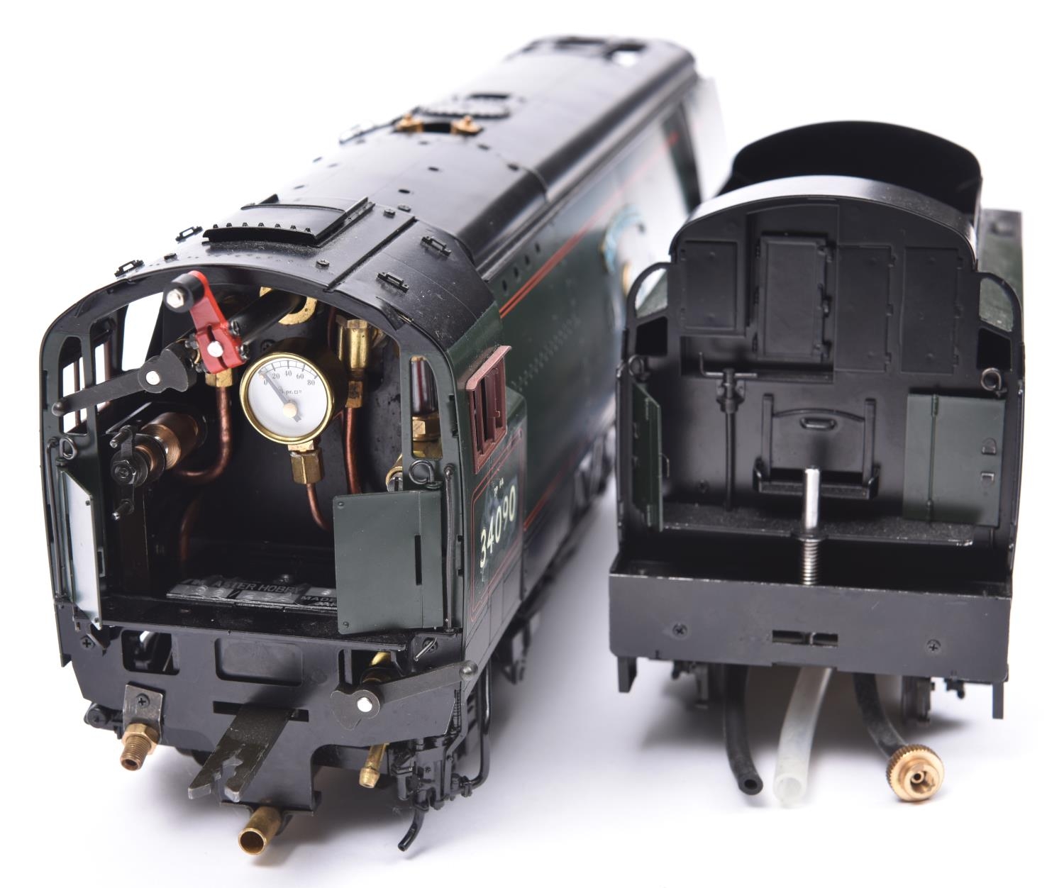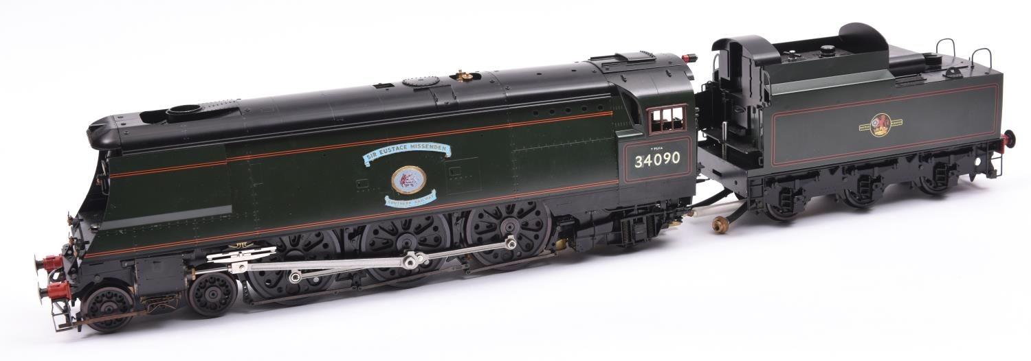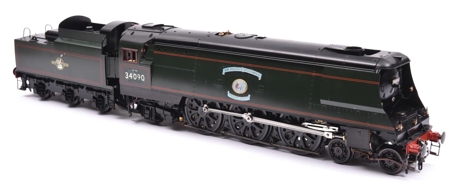This kit has been finished as Sir Eustace Missenden 34090, in lined Brunswick Green. Model features 3 working cylinders with modified Walschaerts valve gear, twin safety valves, pressure gauge, water gauge, hand water pump, etc. With accessories, assembly instructions and original box and packaging. Some wear to box. Locomotive appears GC-VGC. It is sold without a boiler certificate etc. and is therefore sold as a collector's item only. £2800-3000