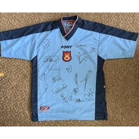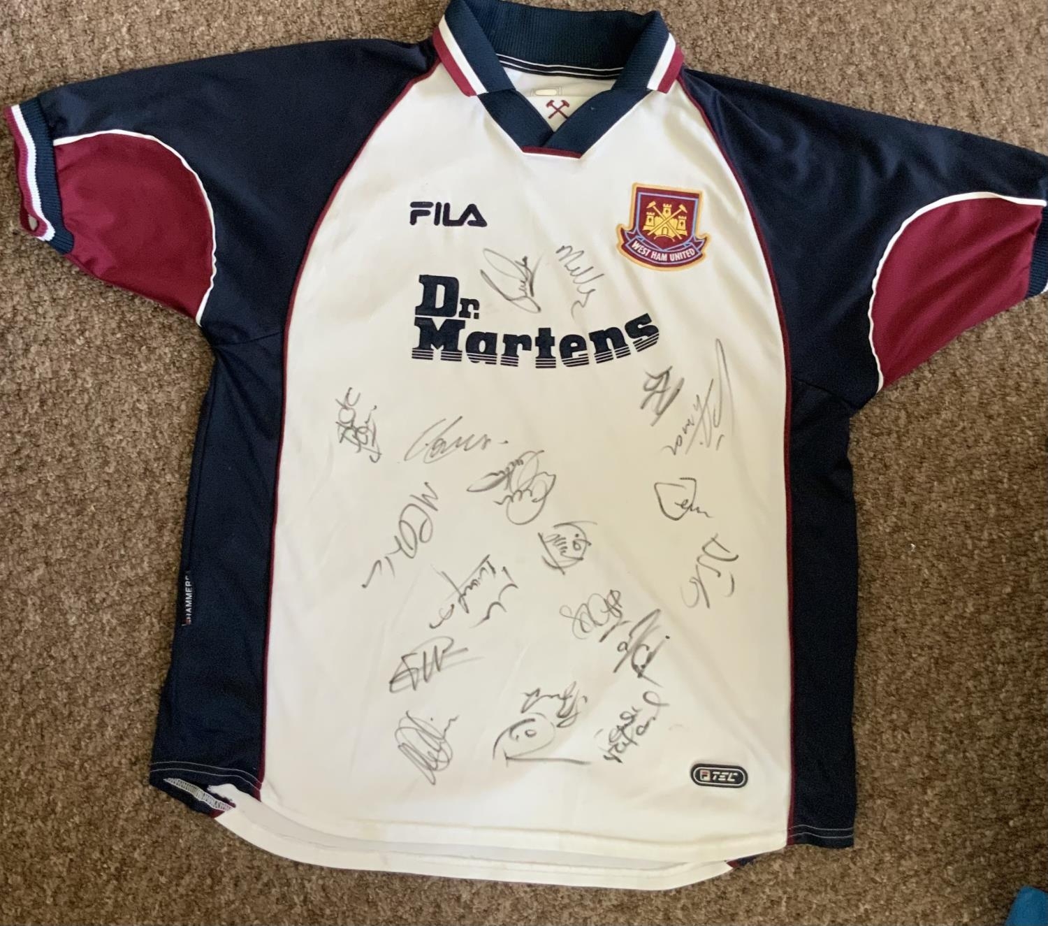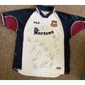 1999 - 2001 West Ham Signed Football Shirt: White Dr Martens shirt clearly signed by 18 including Lampard Mean Hislop Ferdinand Bywater Di Canio Carrick and others.