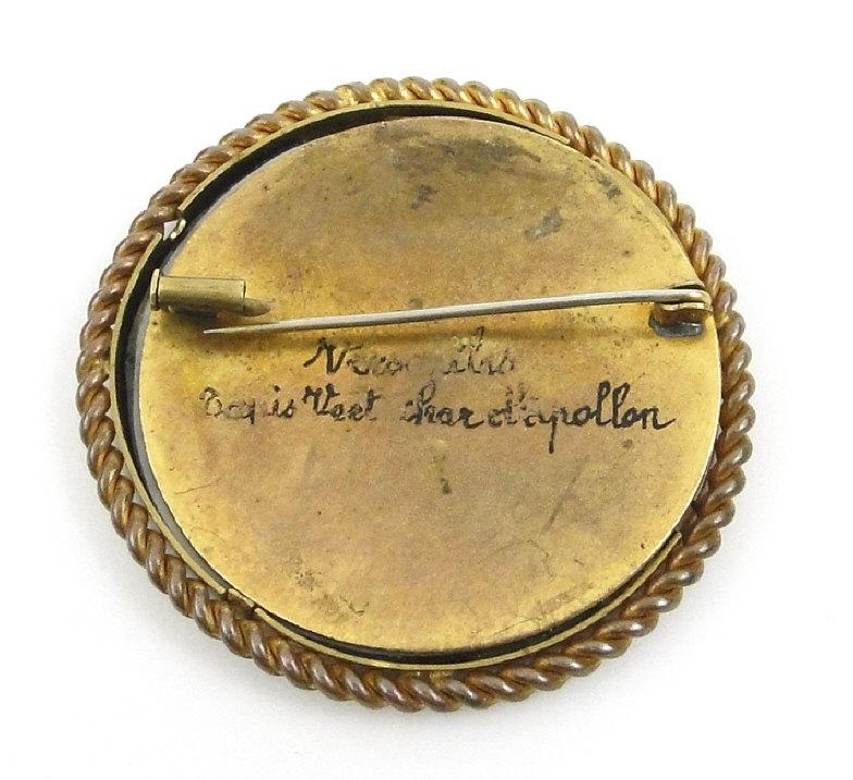 Circular landscape miniature painting of a palace, signed and inscribed to the reverse in a brass ropetwist frame, overall 5cm diameter