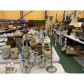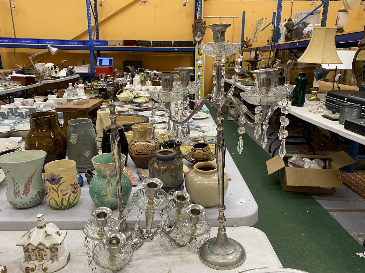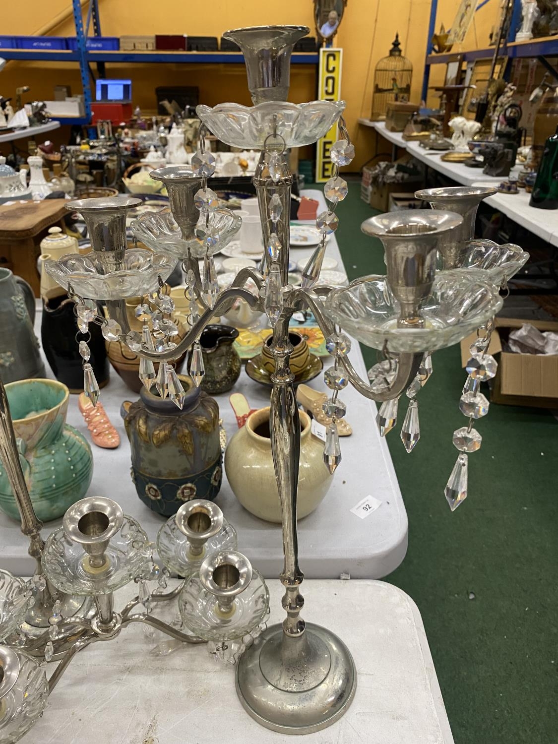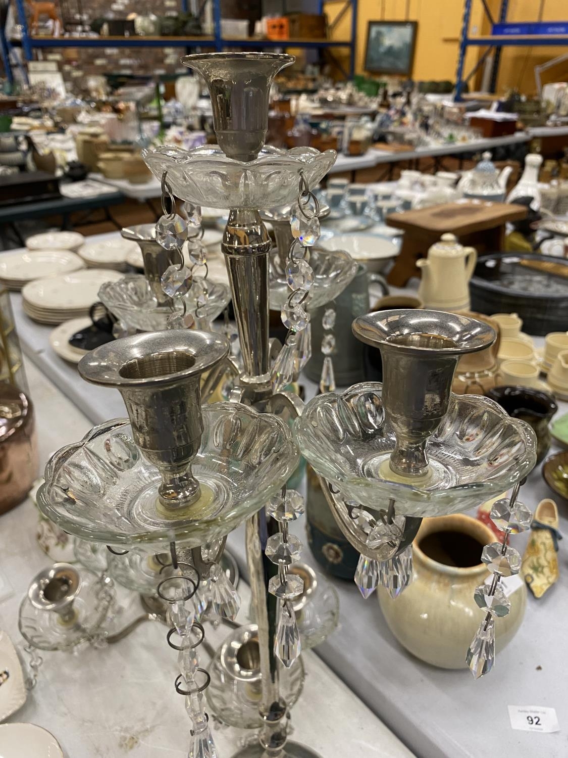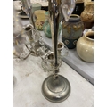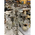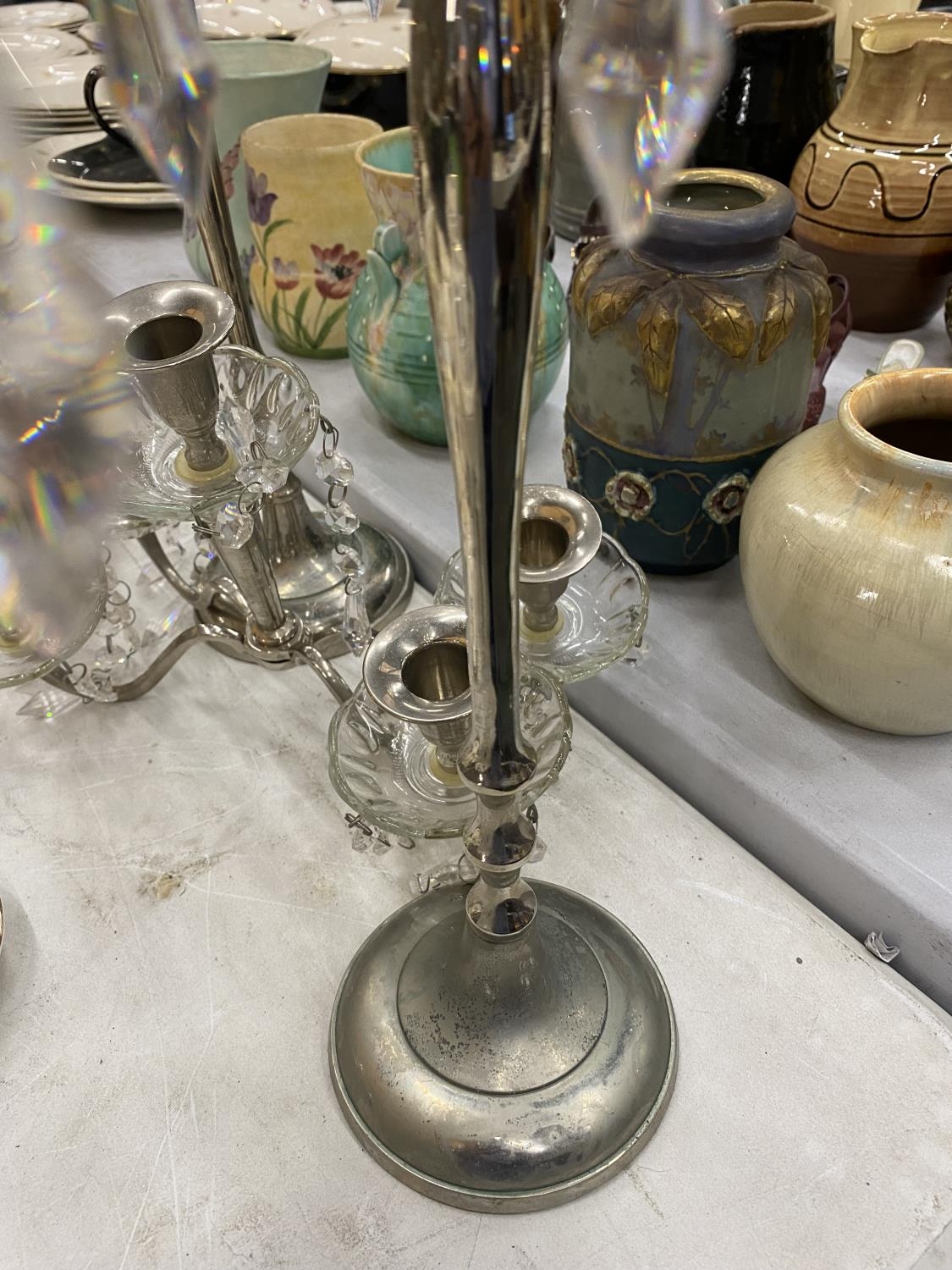 A PAIR OF SILVER PLATED FOUR BRANCHED CANDLEABRAS WITH CRYSTAL DROPLETS - 1 A/F