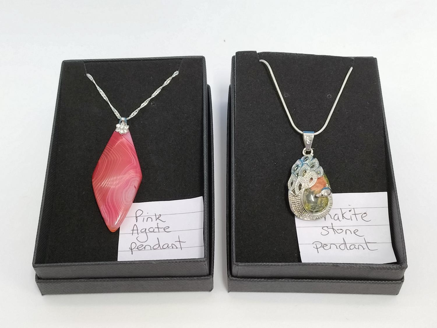 2 x Boxed 18" Chain with Pendants, Pink Agate and Peacock Unakite Stones.
