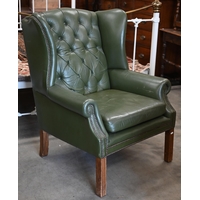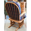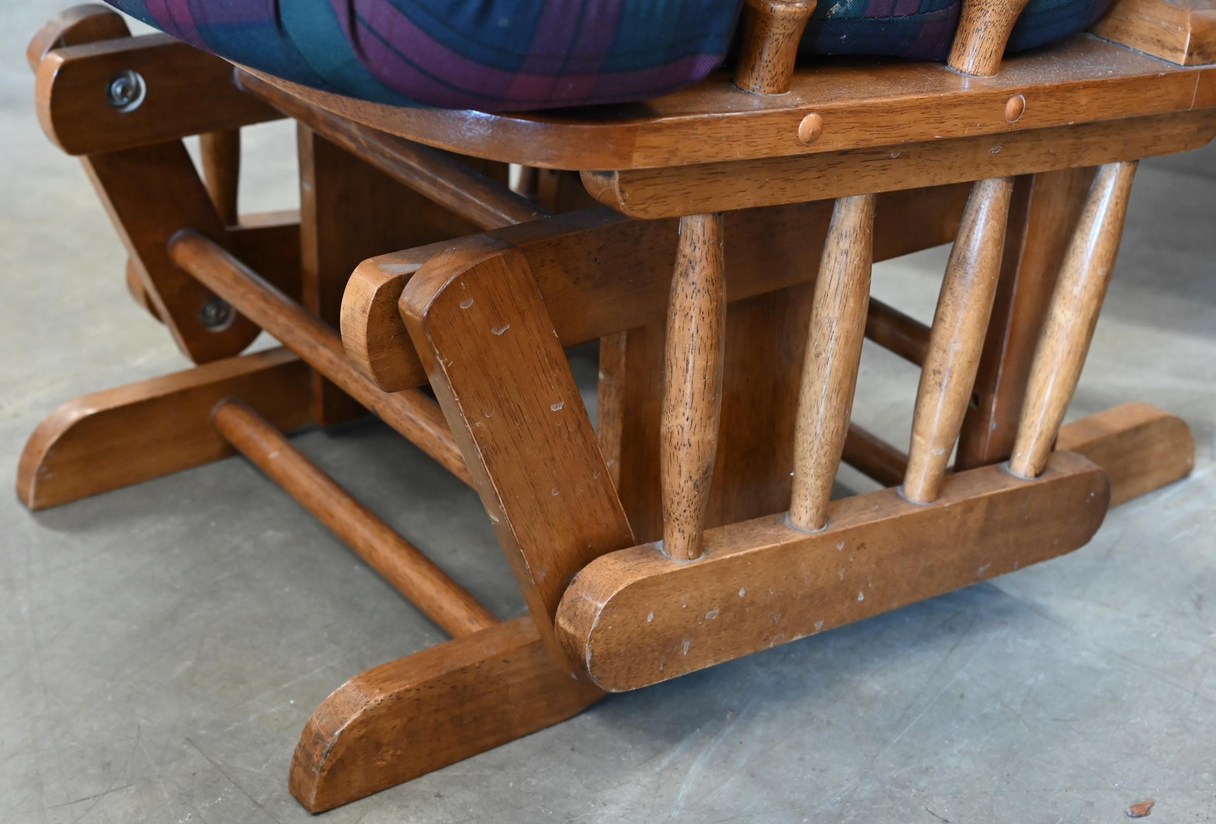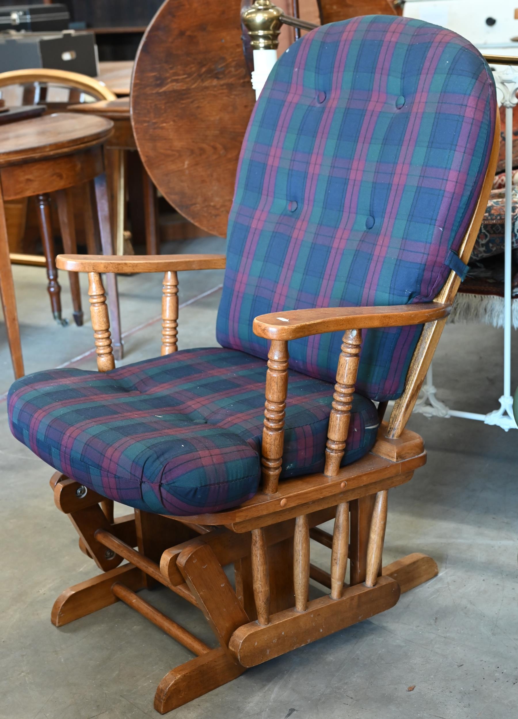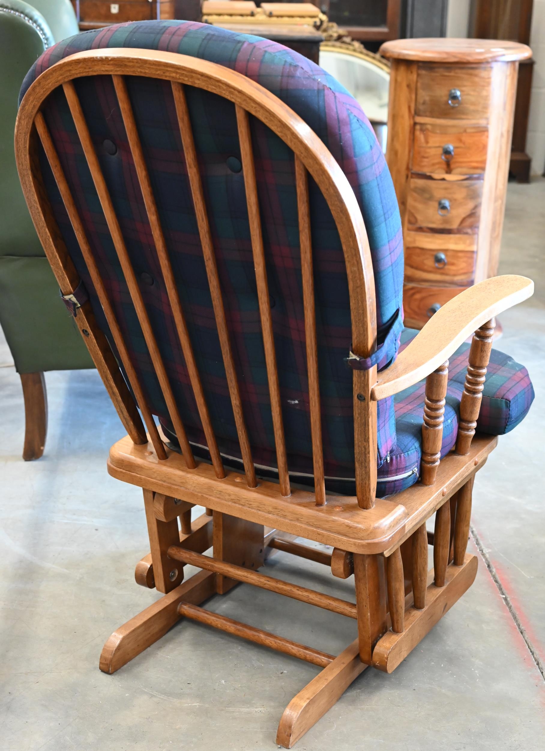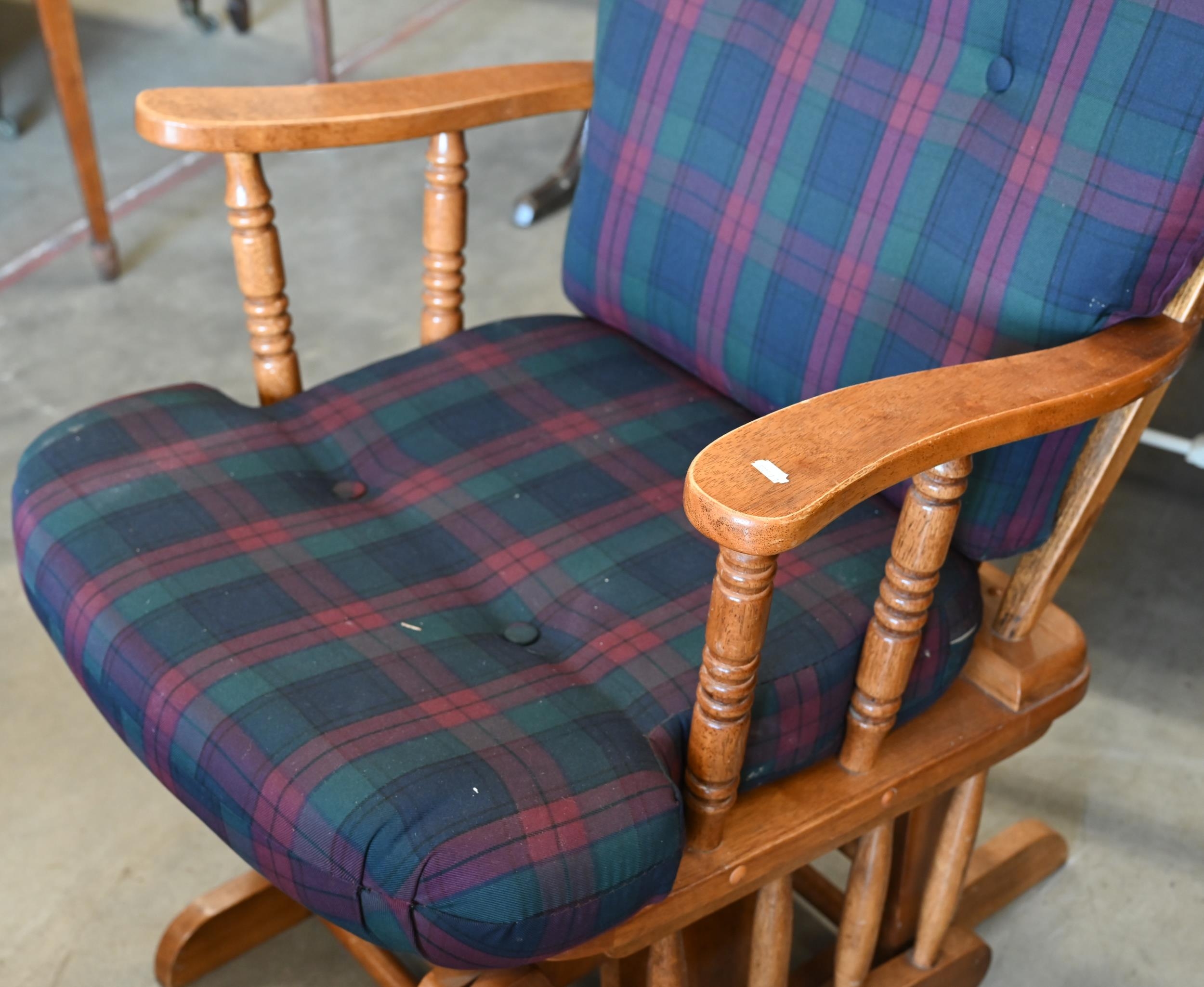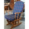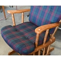 #A stained hardwood spindle back rocking chair with buttoned tartan back and seat cushions