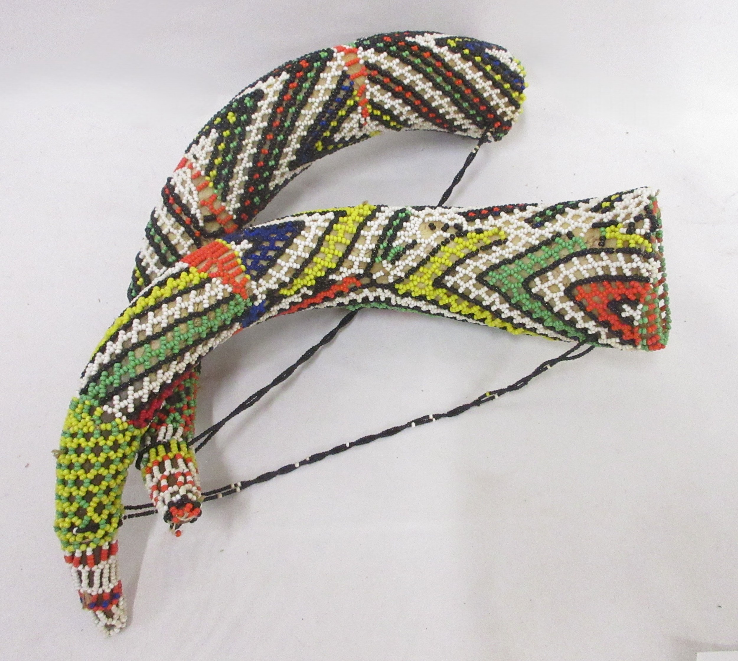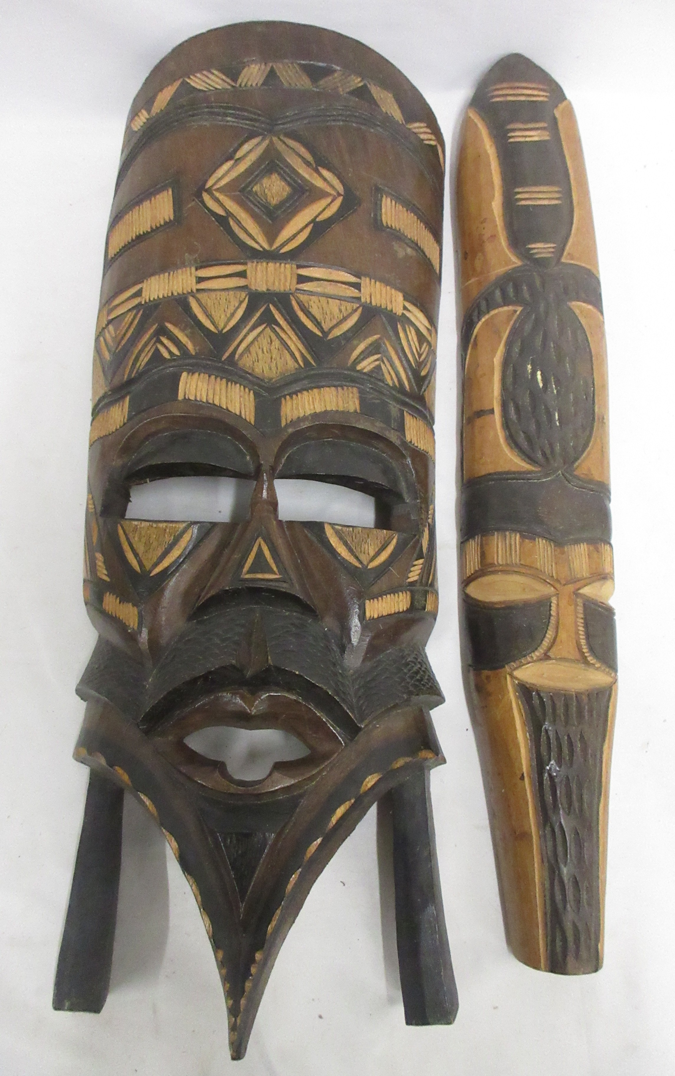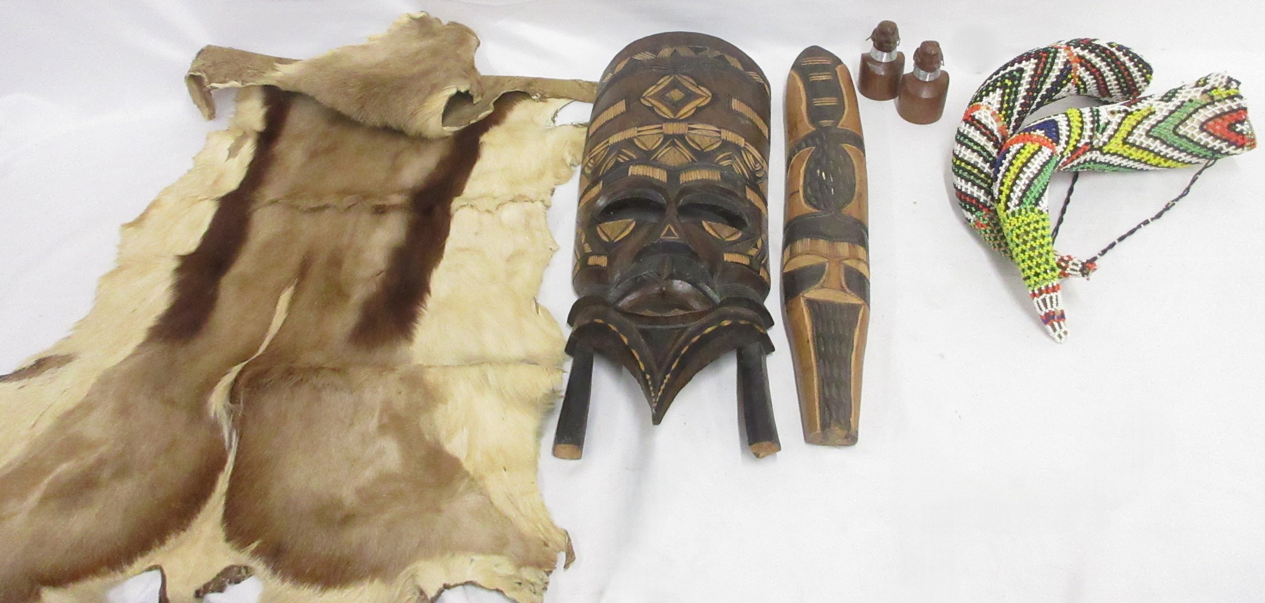 African mask, beaded horns, springbok hide, flag, and salt and pepper shakers Bradleys shipping £48.00 plus vat (UK Only)