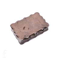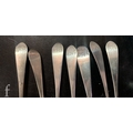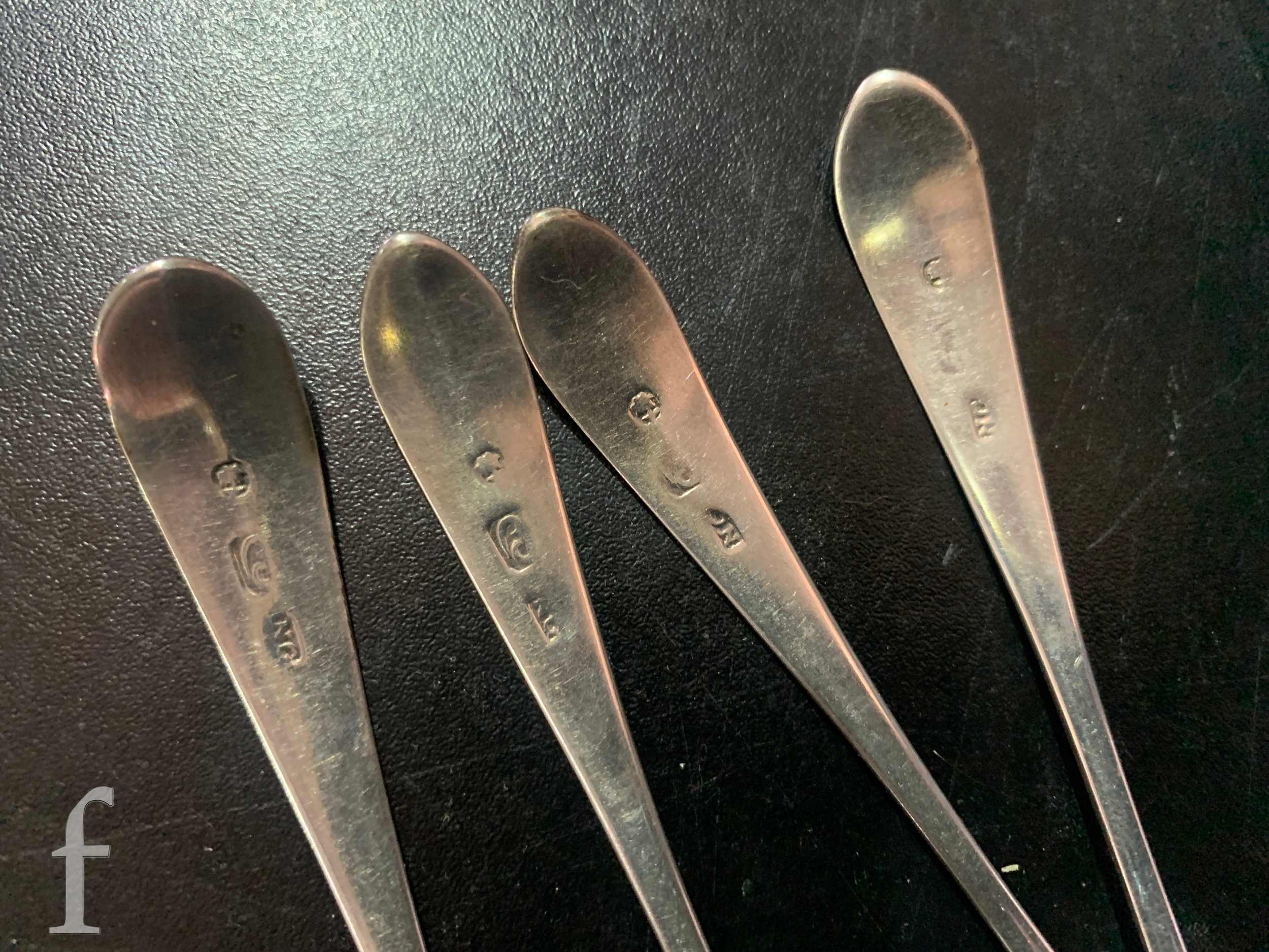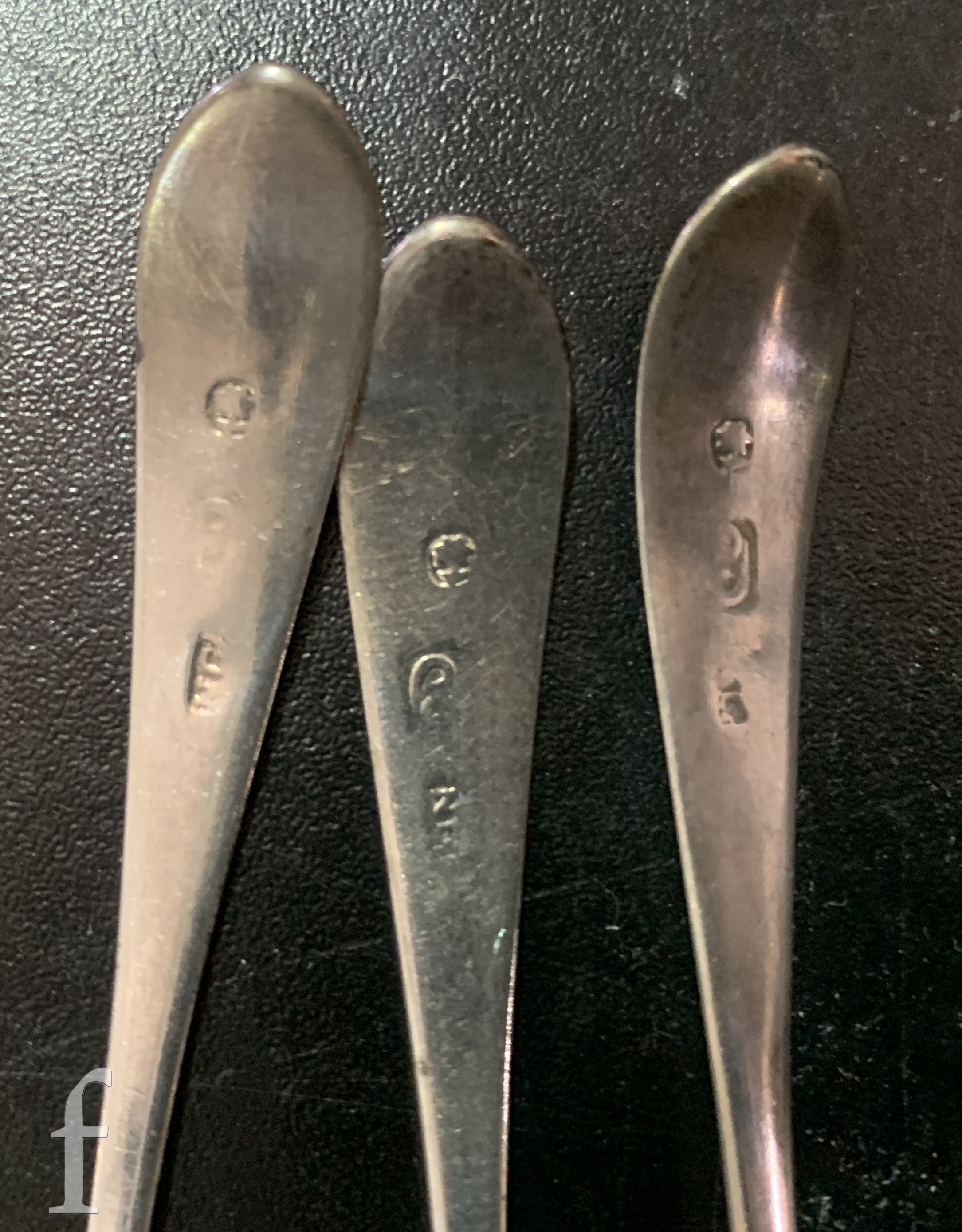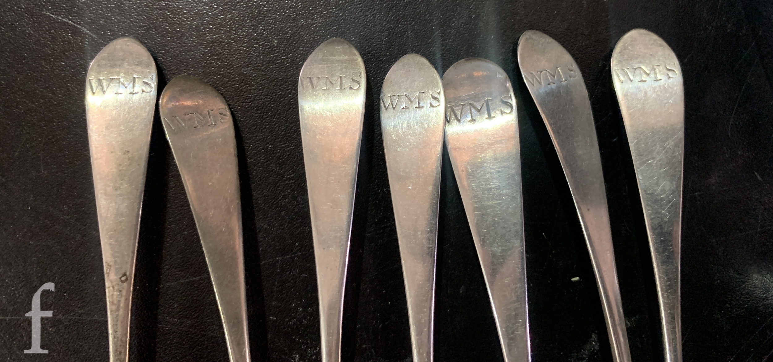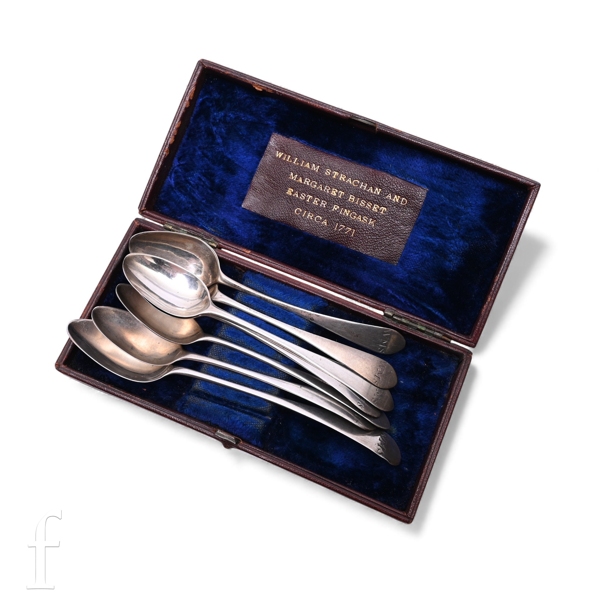 A set of seven 18th Century white metal teaspoons, possibly Scottish Provincial but marks rubbed, the box labelled 'William Strachan and Margaret Bisset, Easter Fingask Crica 1771', total weight 2.54ozt. (7)