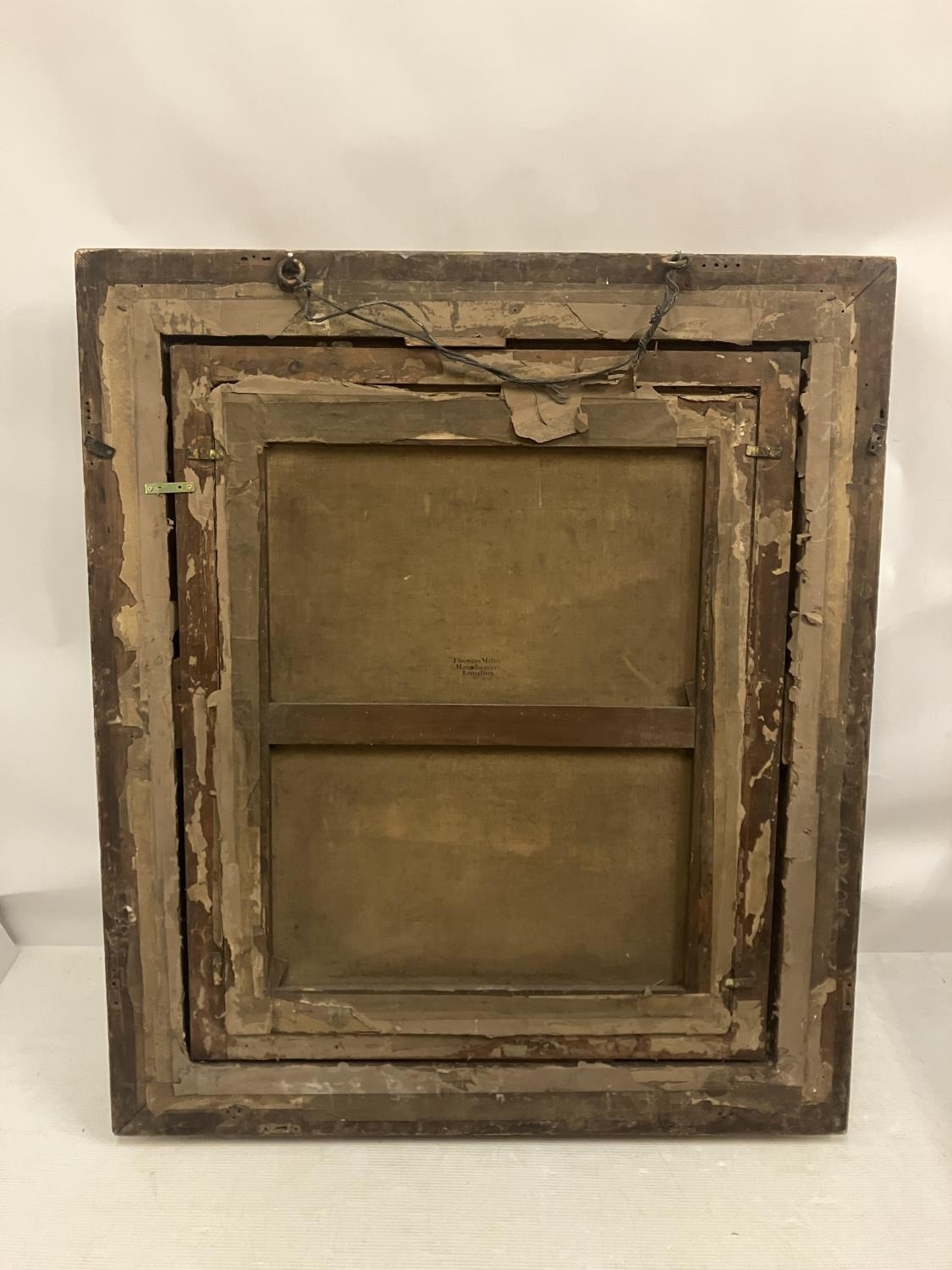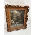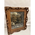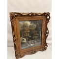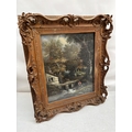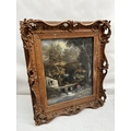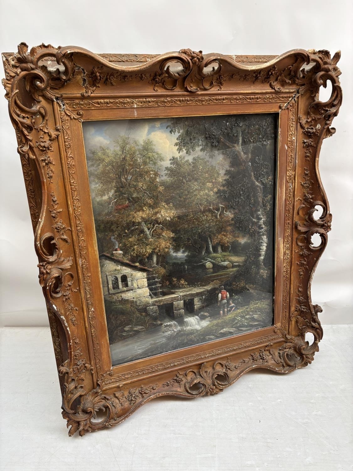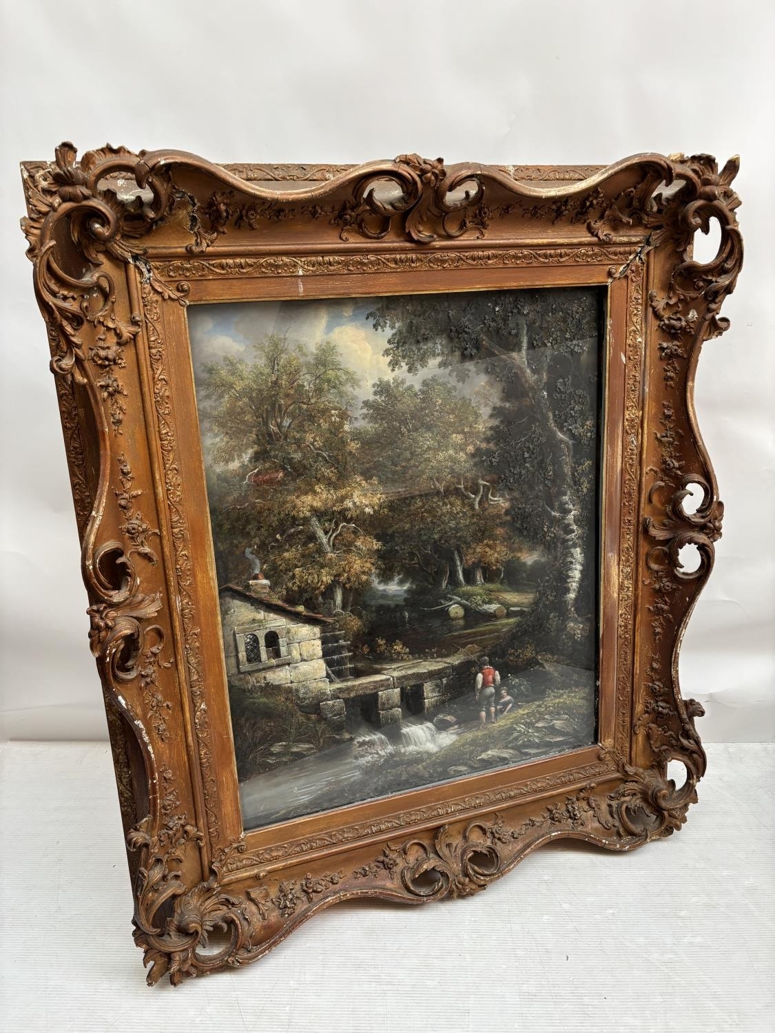 A large painting in decorative frame, Children fishing in a stream by a house. Overall size - 145cm x 125cm x 16cm.