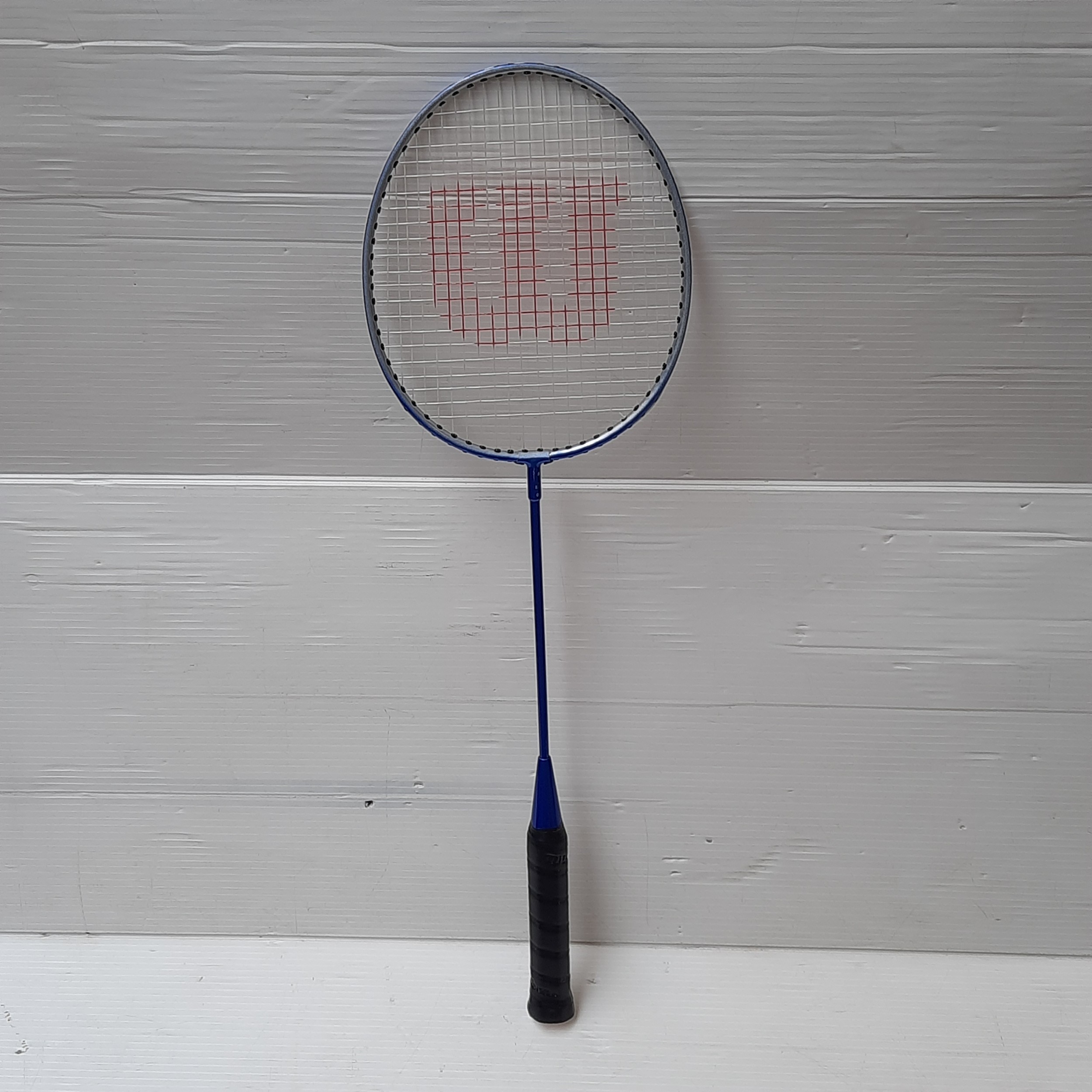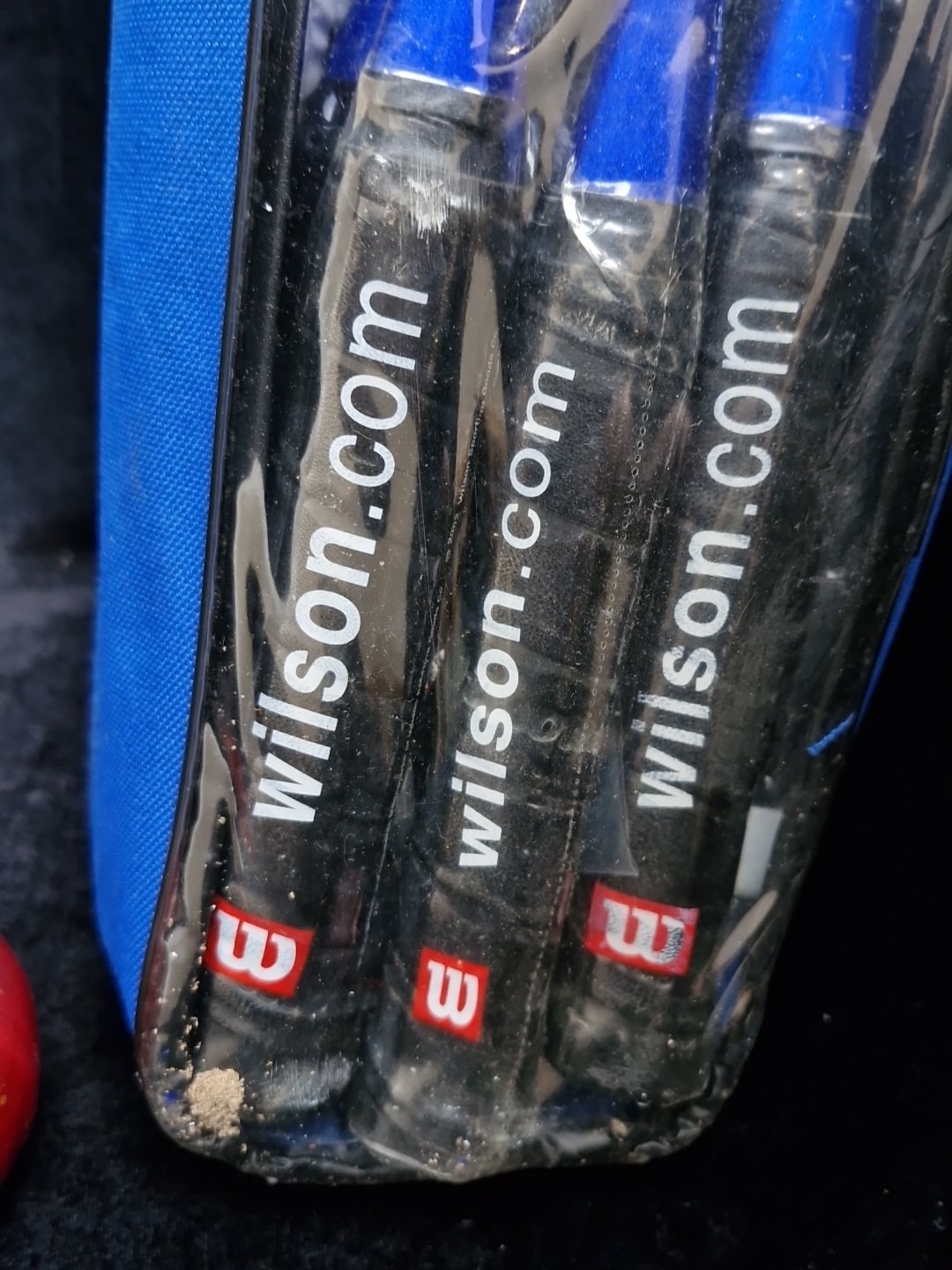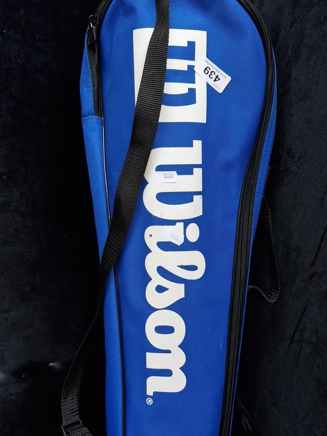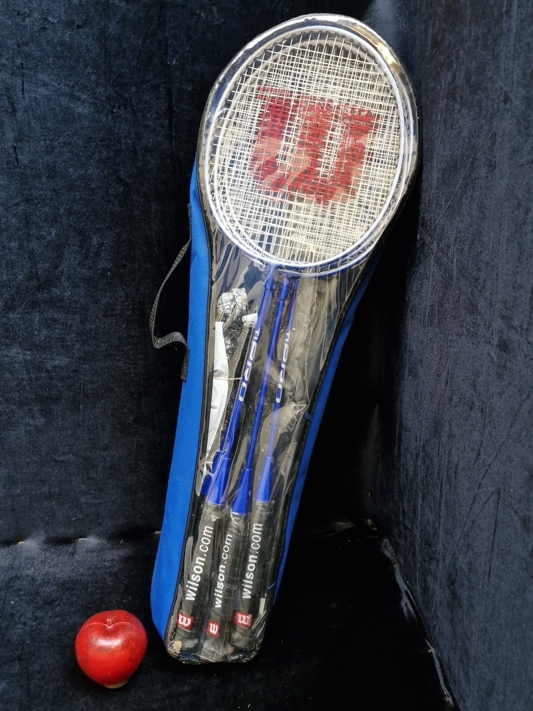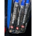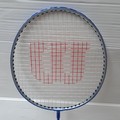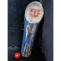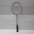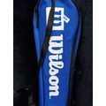 Wilson Badmington equipment comprising 3 Wilson rackets and a blue Wilson zip carry case, with 2 Wilson-branded shuttlecocks within a clear-front accessory pouch.