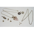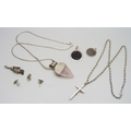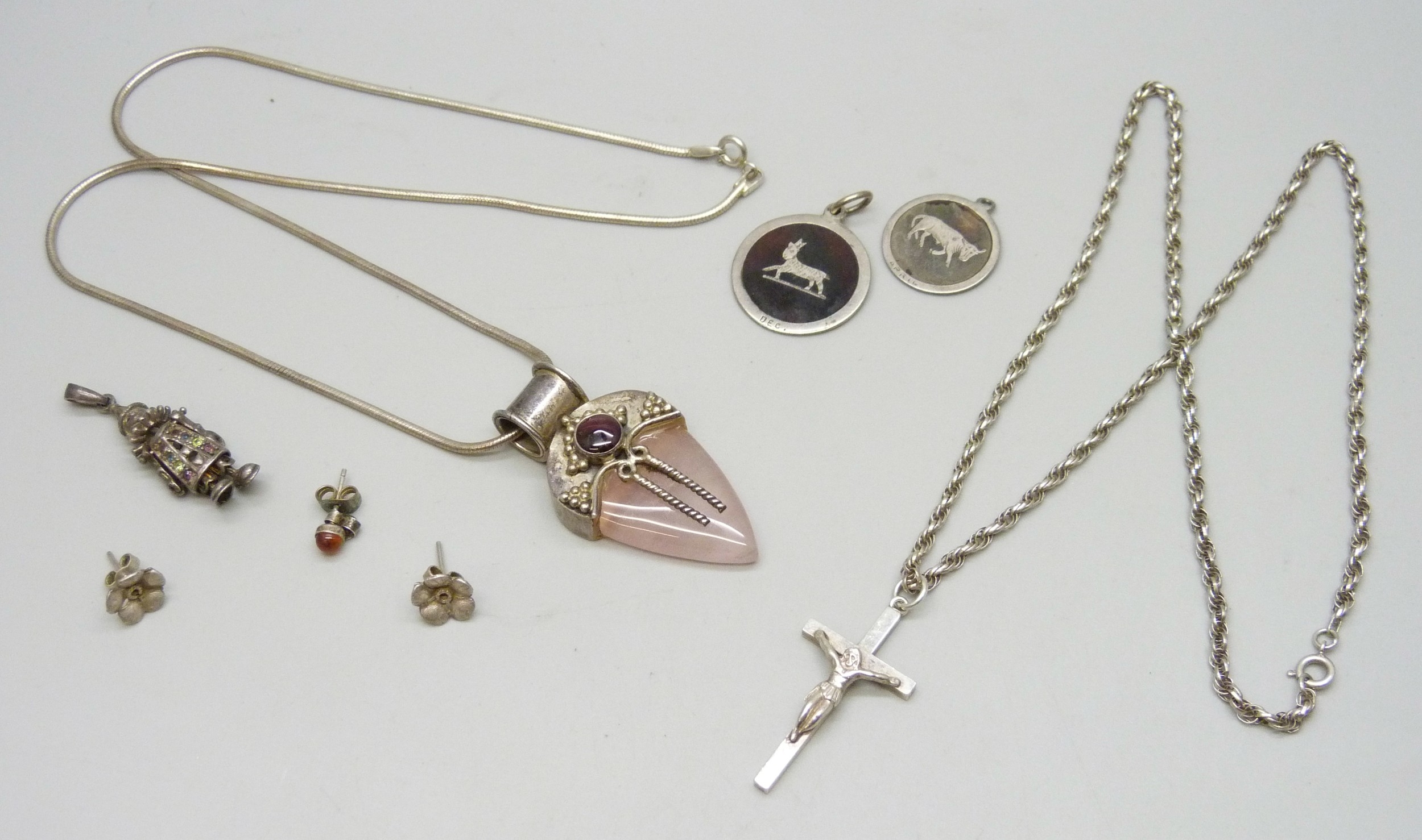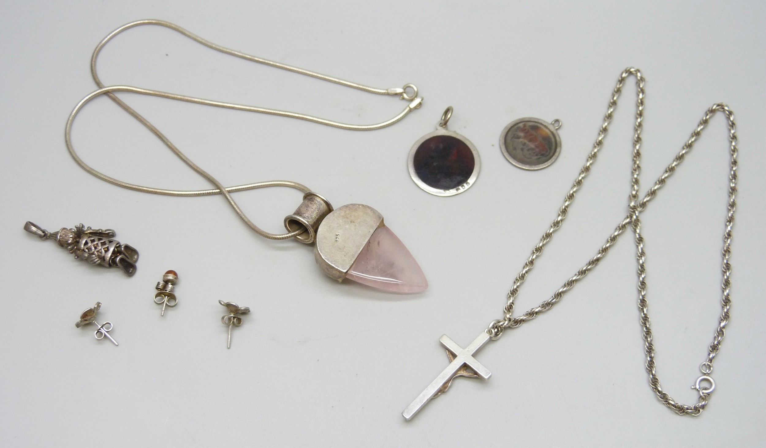 A silver rope chain necklace with a white metal cross pendant, and other silver and white metal jewellery, 41g total
