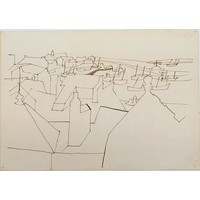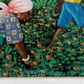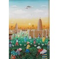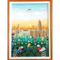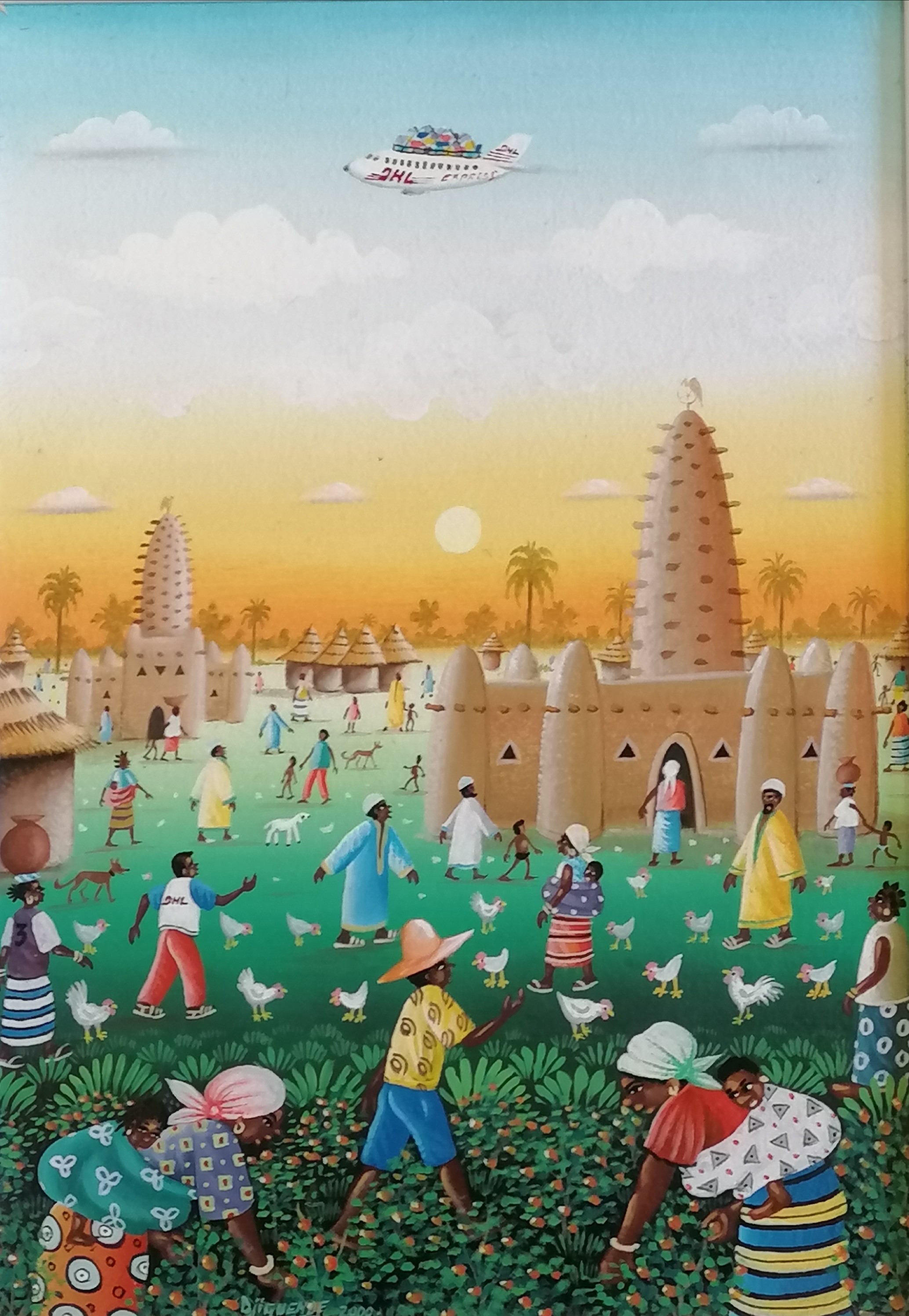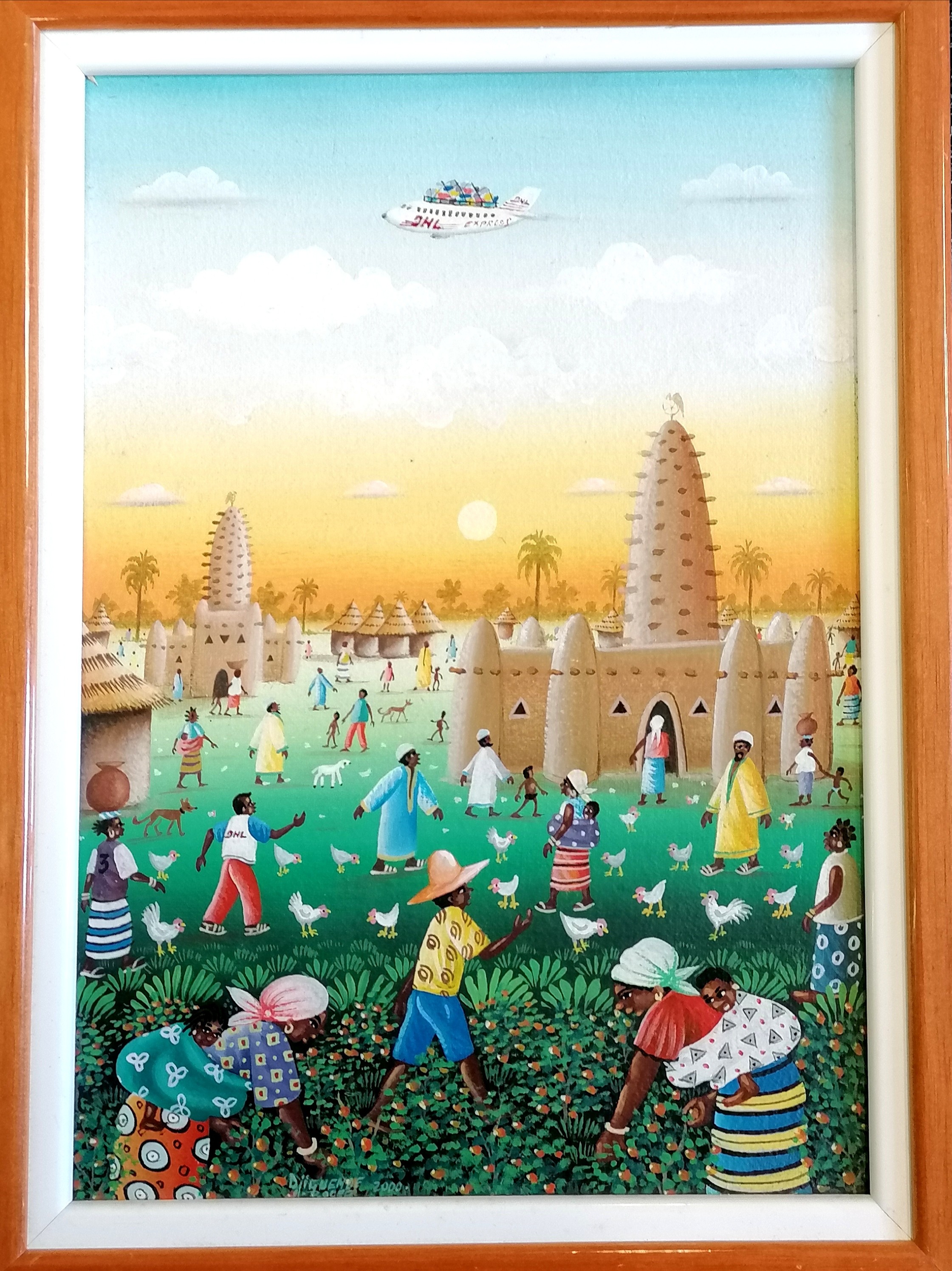 Roger Djiguemdé (1966-2023) original painting signed & dated 2000 of busy village with DHL plane - frame 34.5cm x 25cm