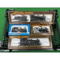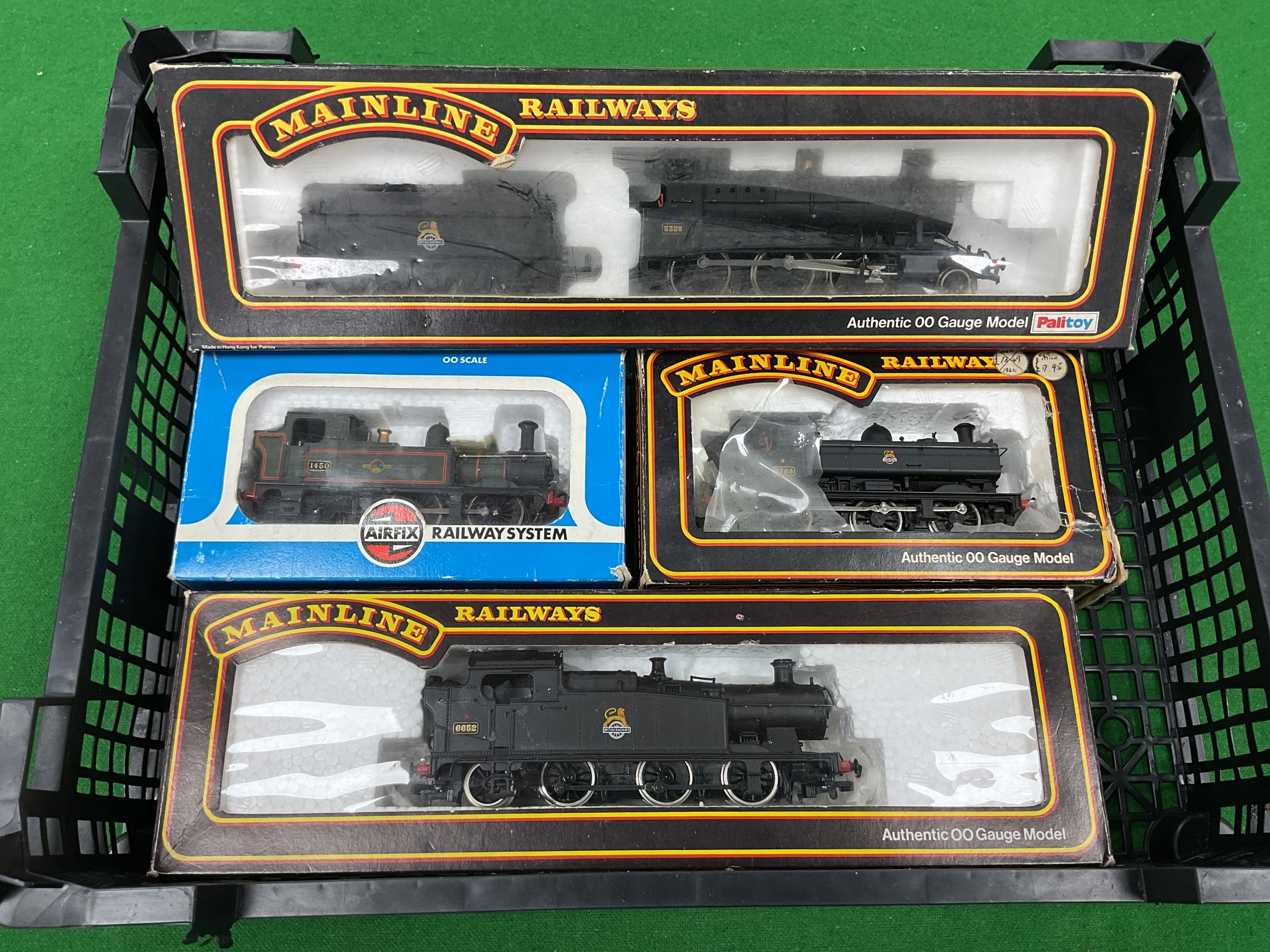 Four boxed 00 gauge ex-GWR locomotives: a Mainline 43xx 2-6-0, a Mainline 56xx 0-6-2T, and a Mainline 57xx 0-6-0PT all in BR Early Emblem Black and an Airfix 14xx 0-4-2T in BR Late Emblem Green, all untested.
