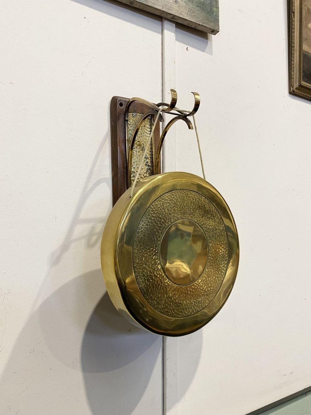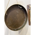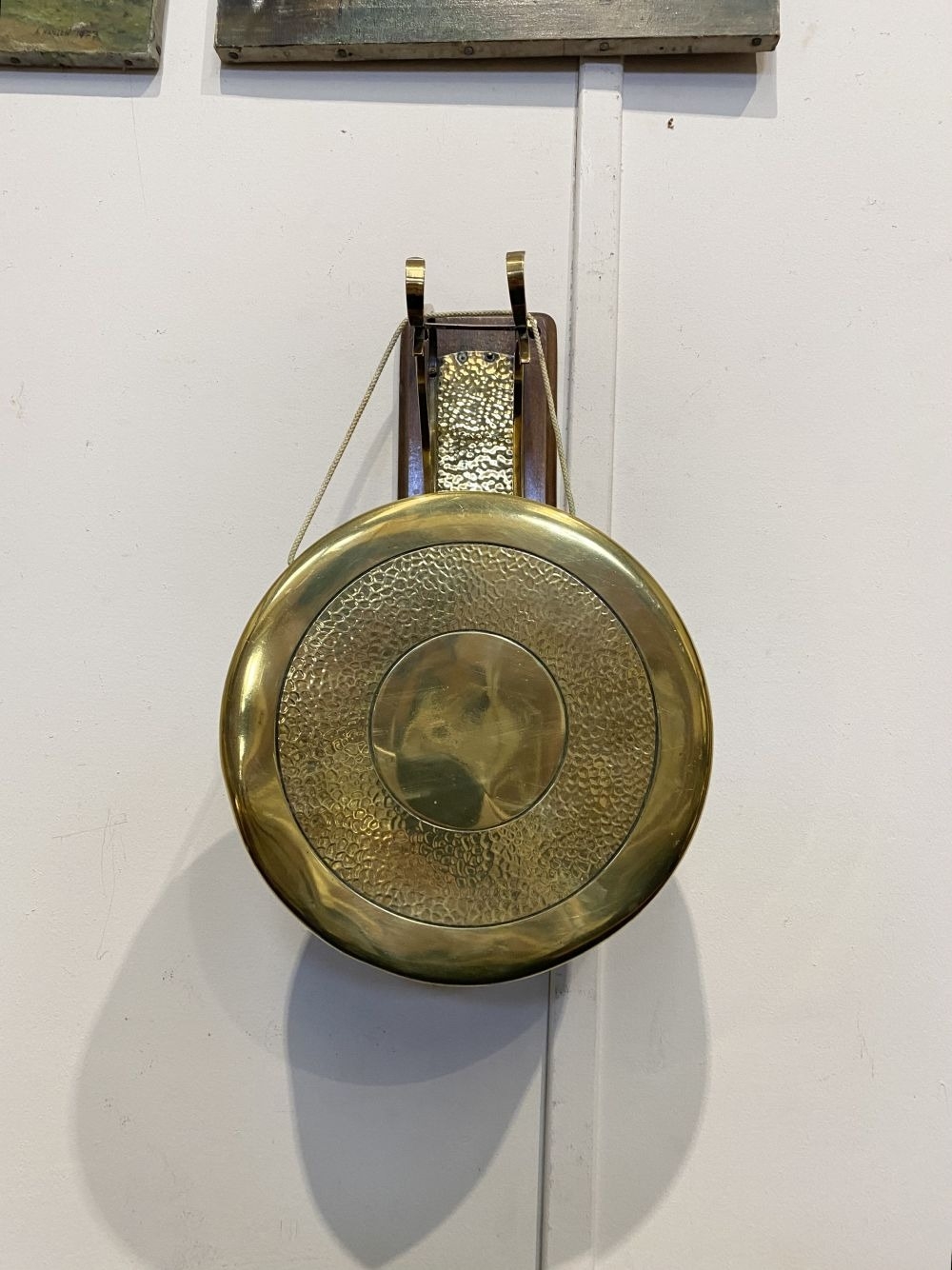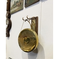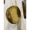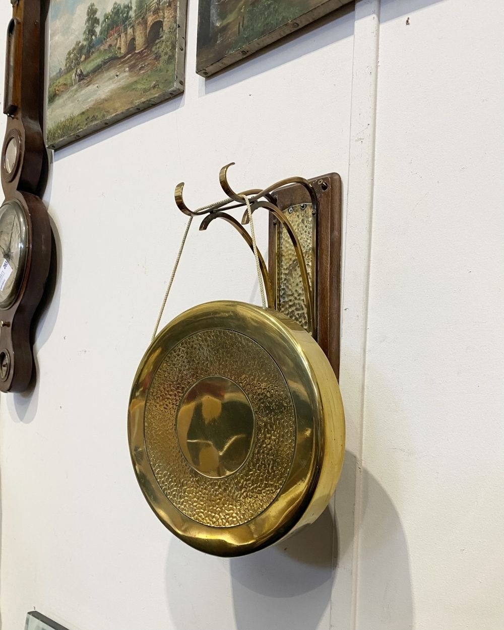 A BRASS WALL HANGING DINNER GONG, wall mountable hardwood stand, with brass hanging hooks and hammered brass rectangular panel. The gong with matching hammered panel. Dimensions: stand: 30cm long; gong: 26cm diameter approx.