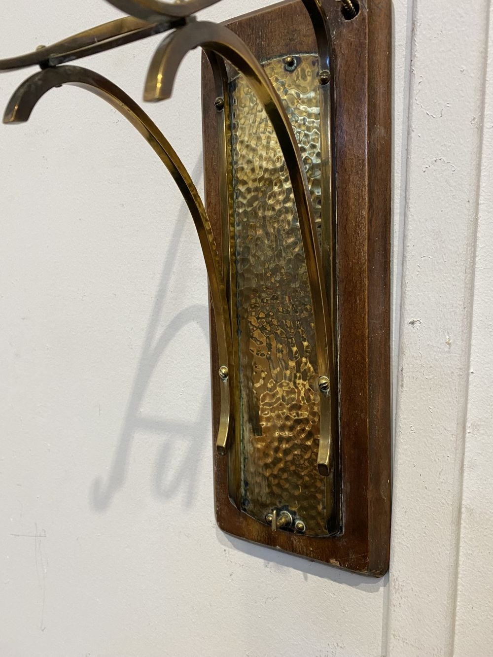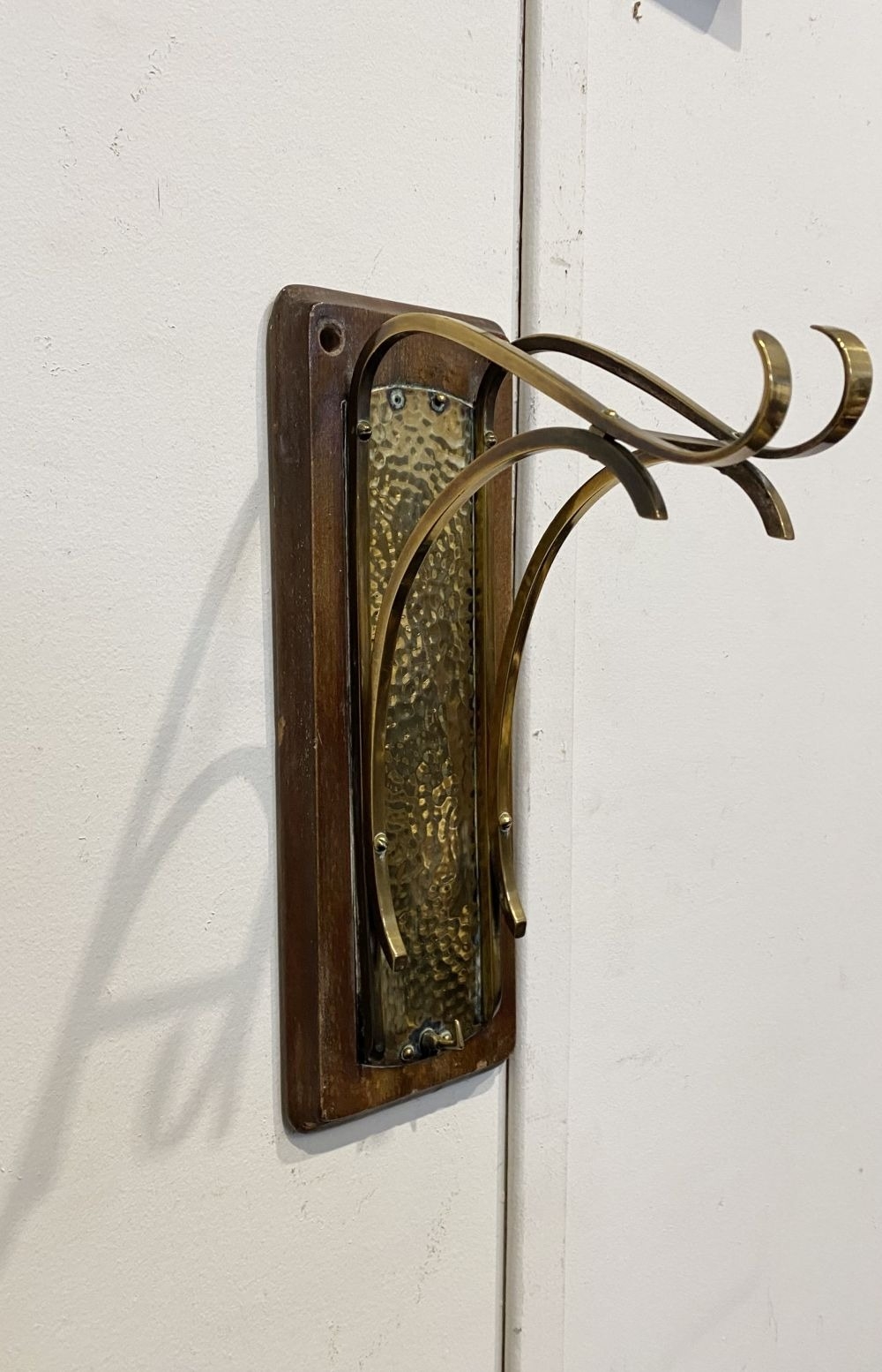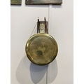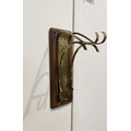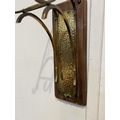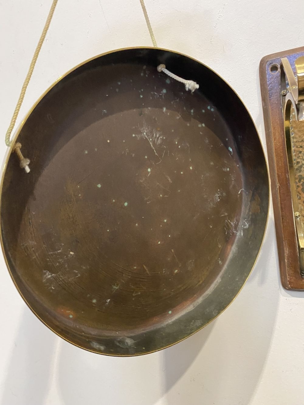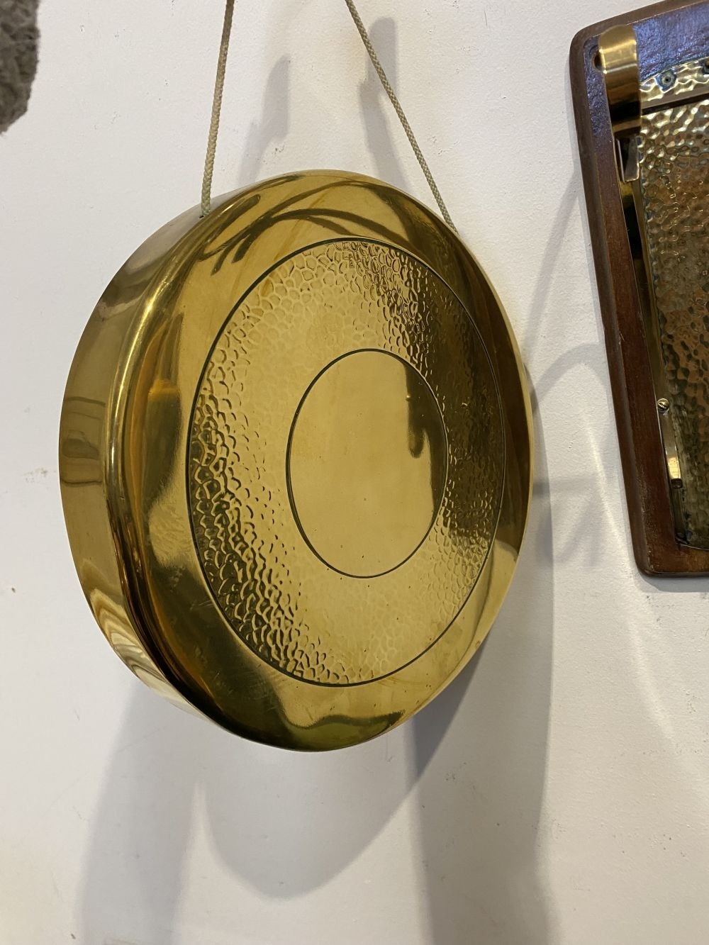A BRASS WALL HANGING DINNER GONG, wall mountable hardwood stand, with brass hanging hooks and hammered brass rectangular panel. The gong with matching hammered panel. Dimensions: stand: 30cm long; gong: 26cm diameter approx.