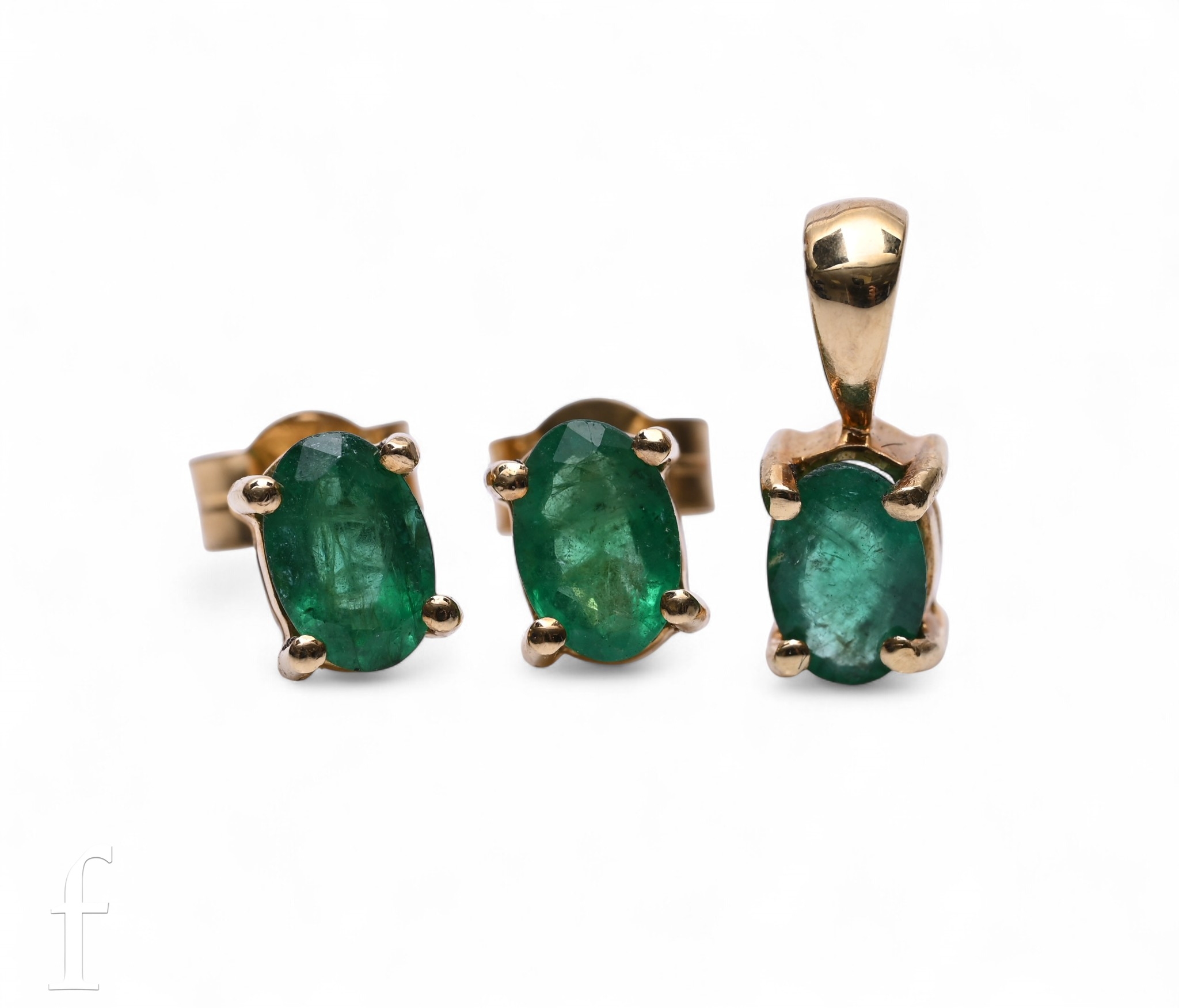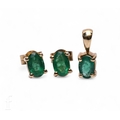 A pair of emerald earrings, each oval mixed-cut emerald four claw set, on post and butterfly fittings, hallmarked for 18 carat gold, total weight 1.4g, and an emerald pendant, four claw set with plain bail, hallmarked for 18 carat gold, total weight 0.7g, 1.2cm long.