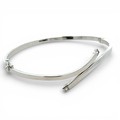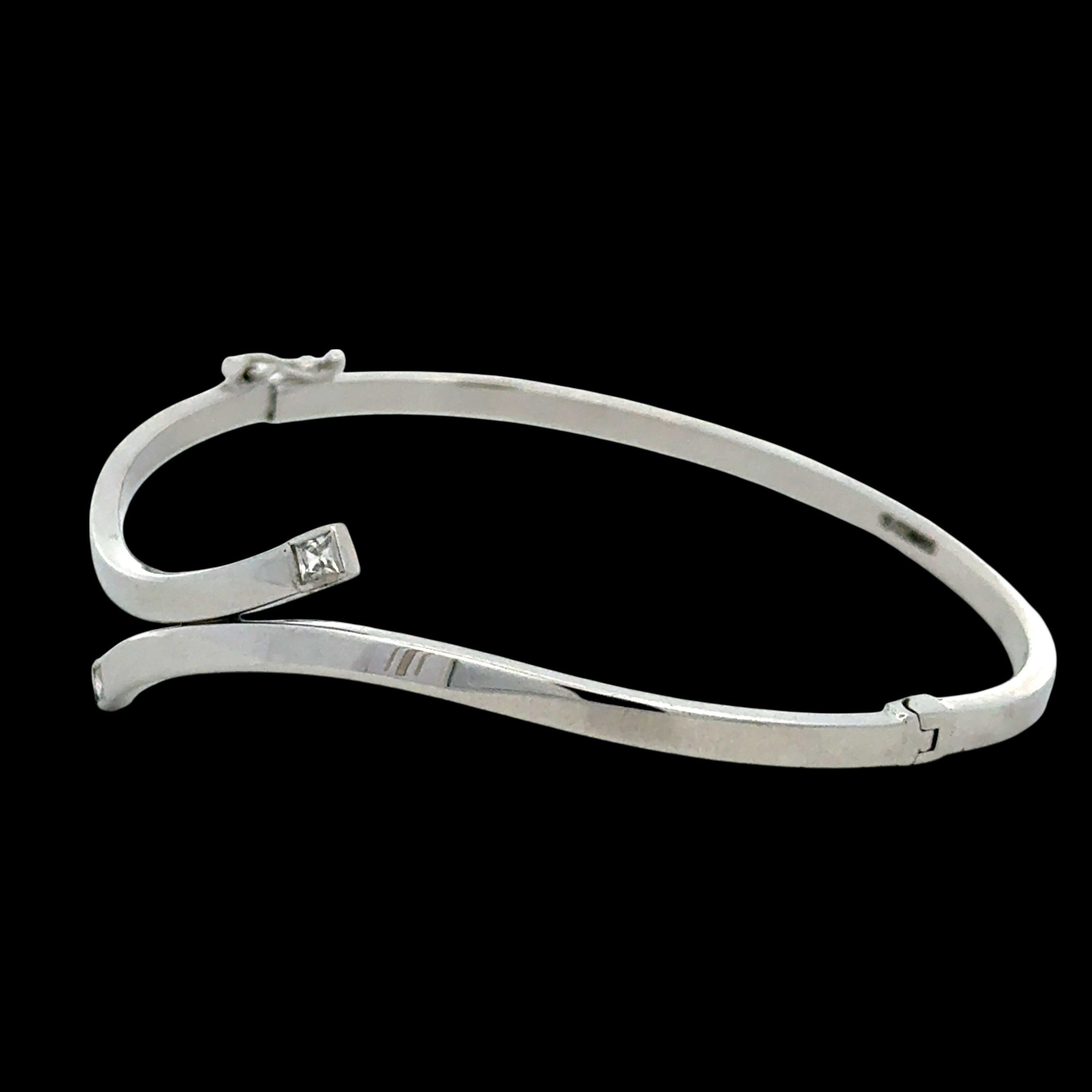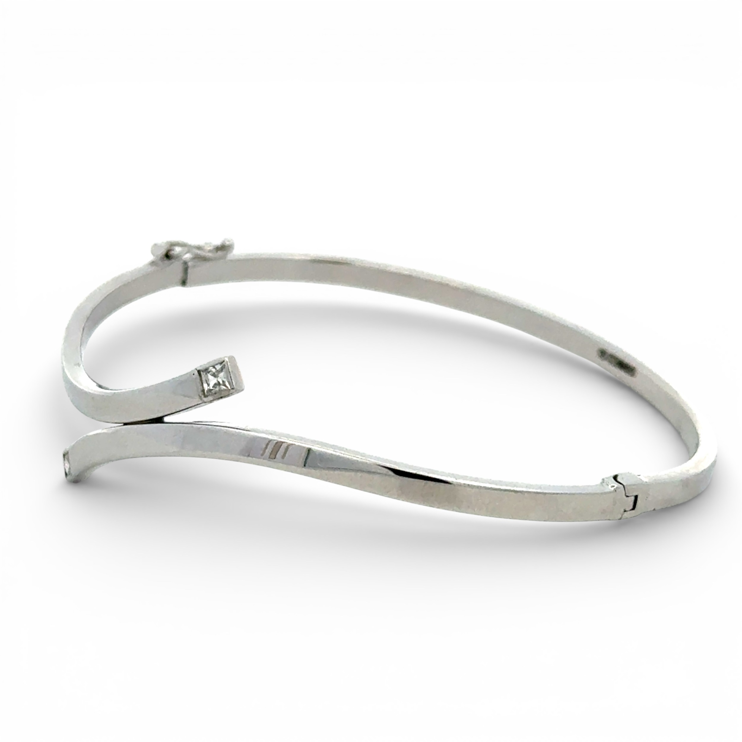 9ct white gold twist bangle, both ends set with a princess cut white stone, width 65mm