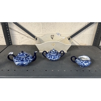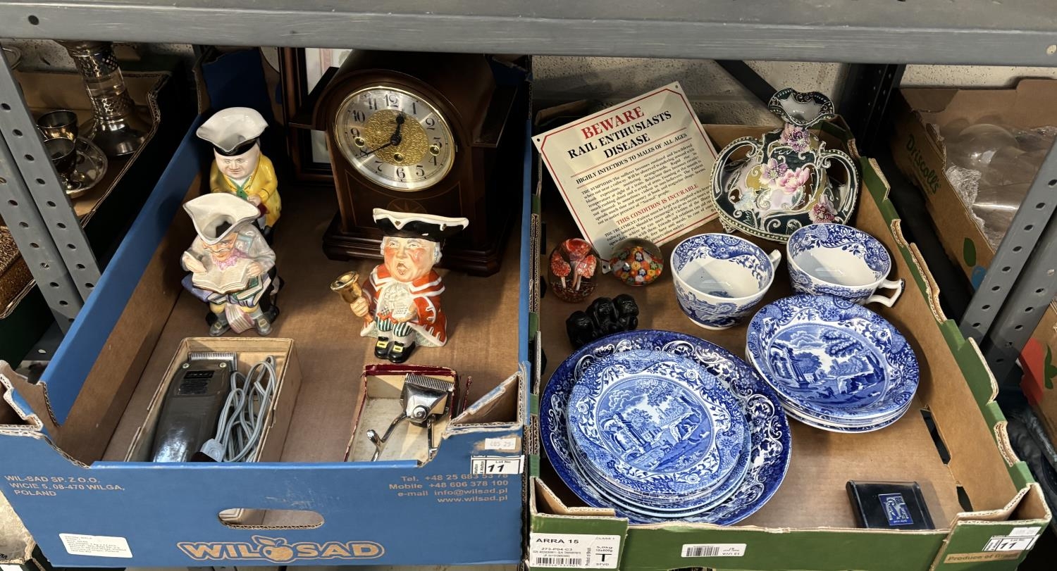 2 Boxes containing art glass paperweights, character jugs and a mantle clock