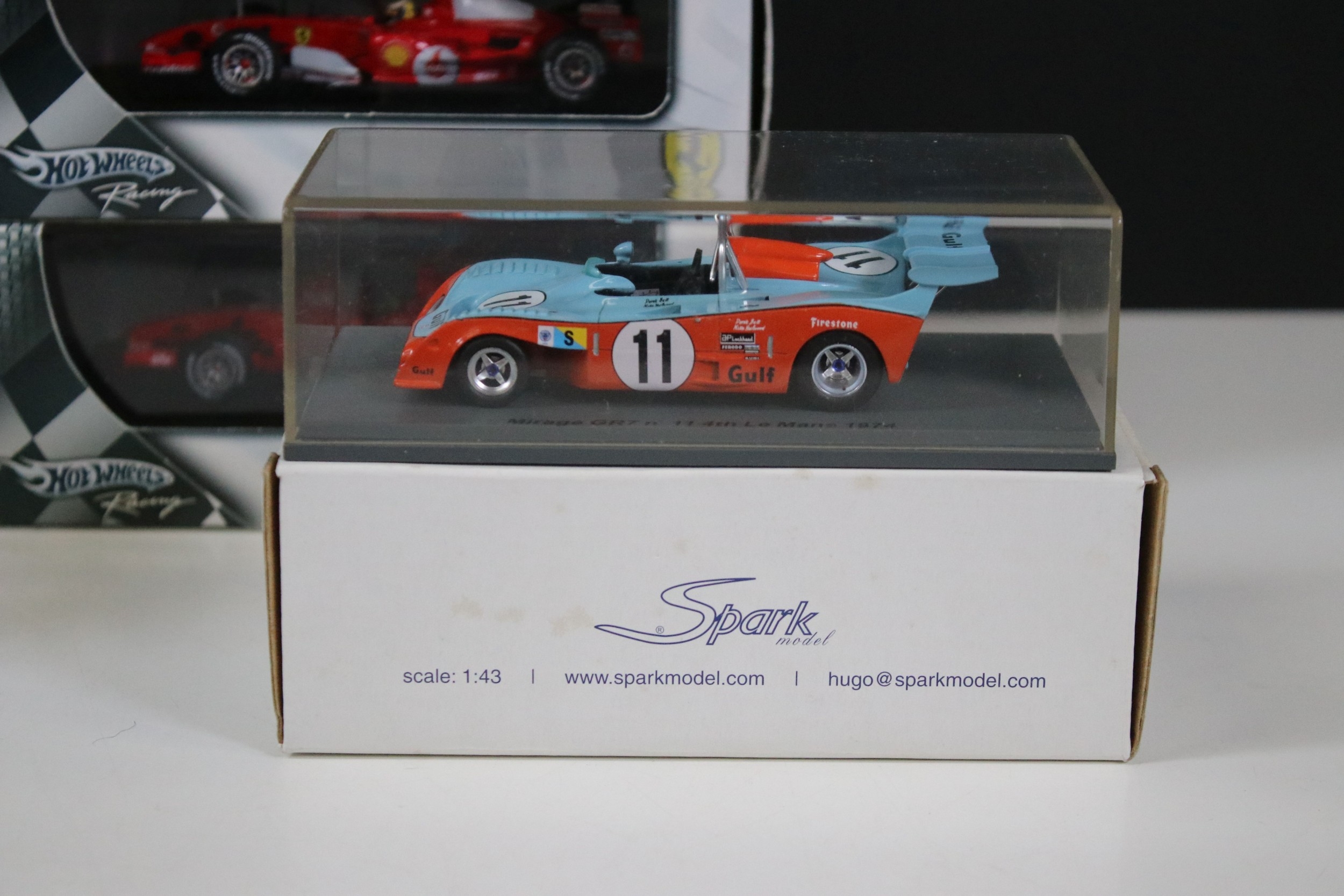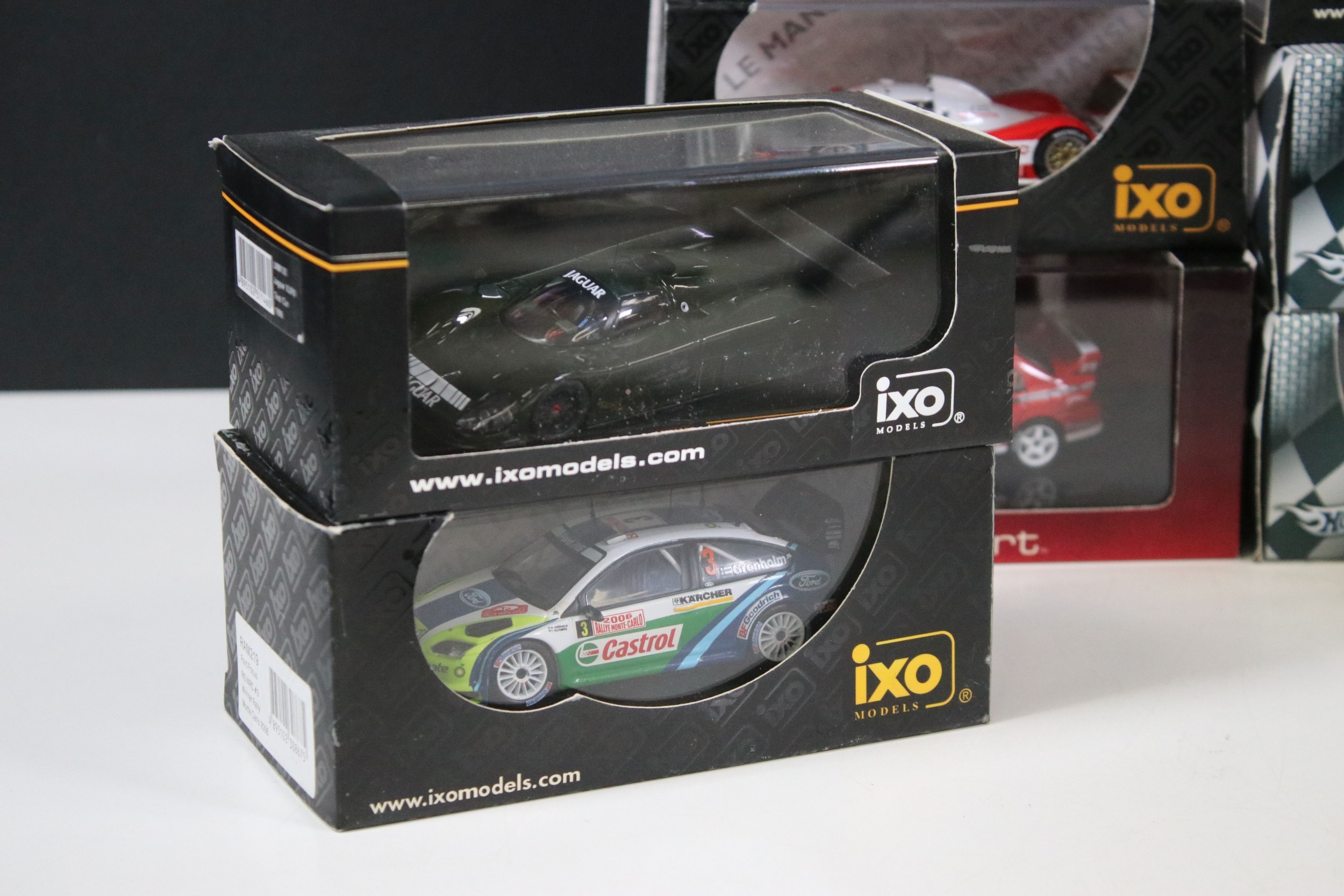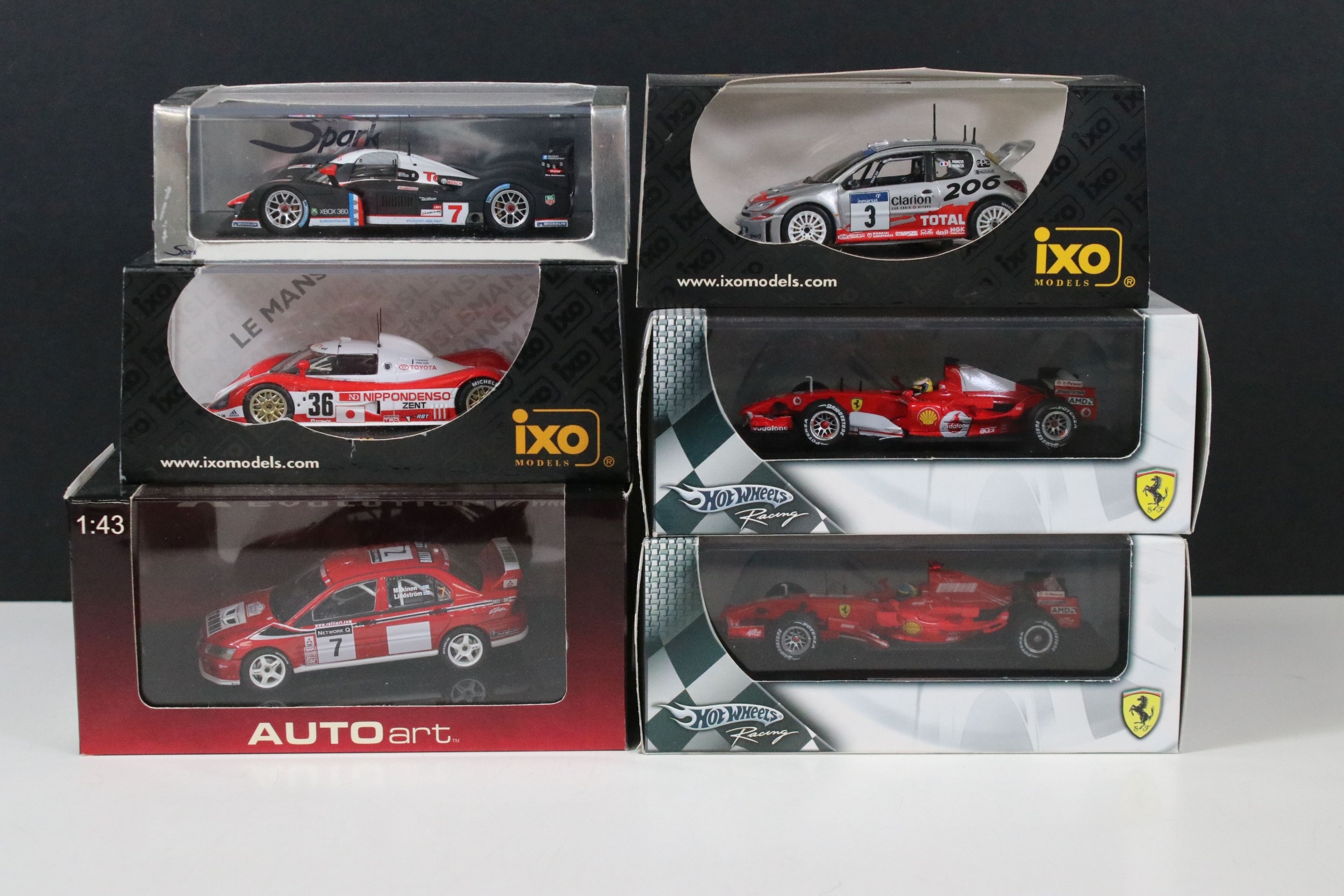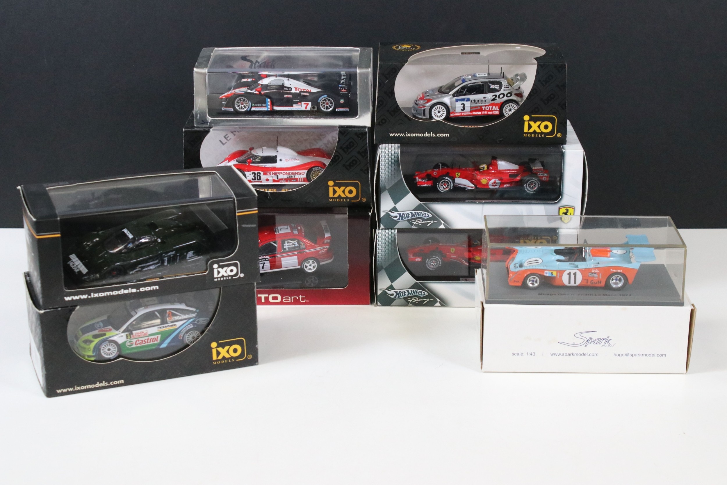 Nine boxed / cased racing diecast models to include 4 x Ixo Models (LMC054 Toyota TS010 #36 LM 1993, RAM083 Peugeot 206 WRC #3 Winner Tour De Corse 2002, LMM135 Jaguar XJR9 Test Car 1990 and RAM219 Ford Focus RS WRC #3 Winner Rally Monte Carlo 2006), 2 x Spark Models (STME05 Mirage GR7 #11 4th LM 1974 and S1272 Peugeot 908 HDi FAP No. 7 LM 2007), Autoart Mitsubishi Lancer Evolution WRC and 2 x Mattel Hot Wheels Racing Felipe Massa models including F2007 and 248 F1, all ex
