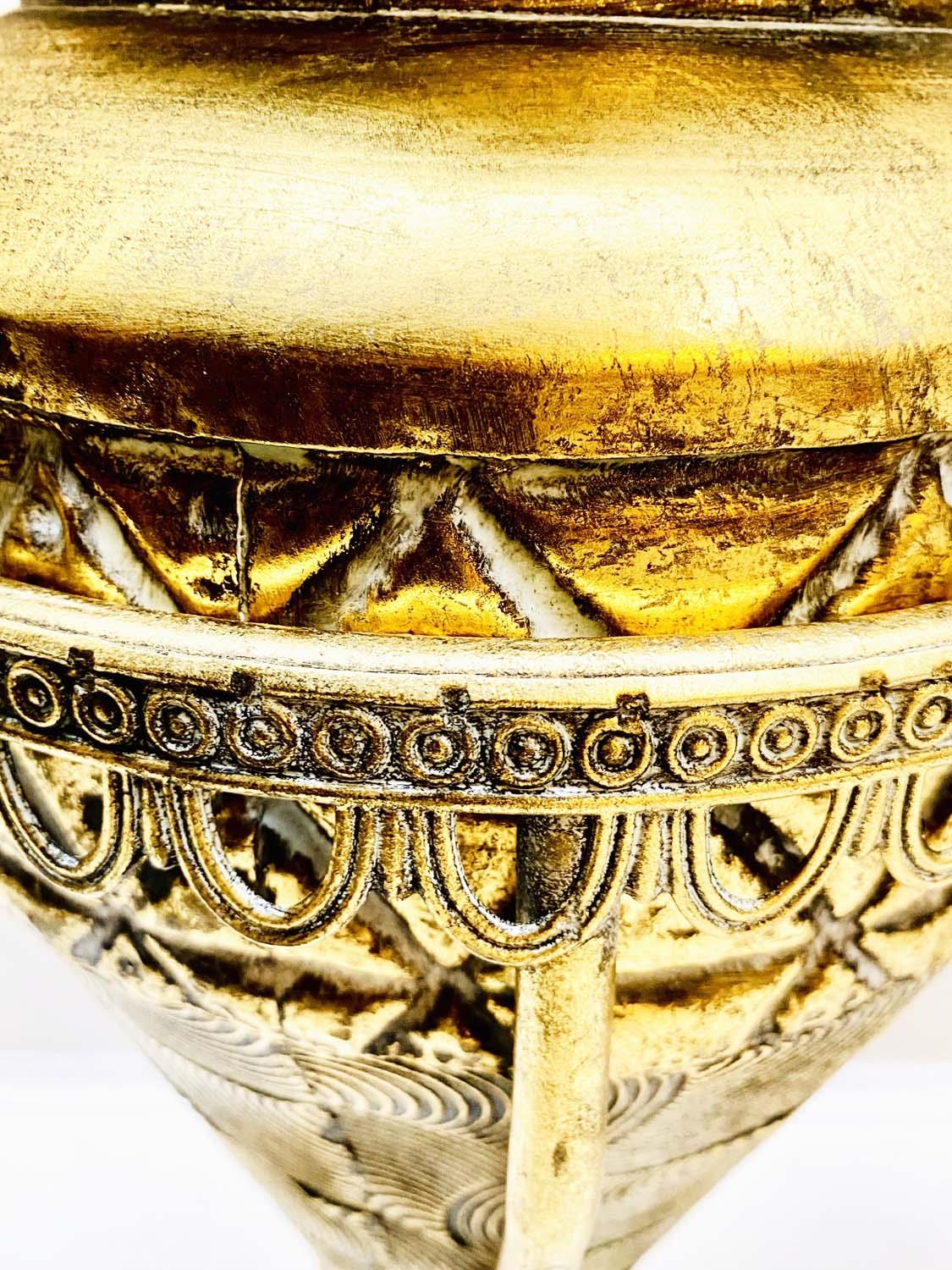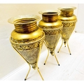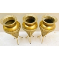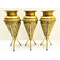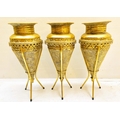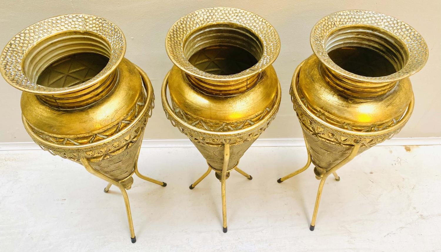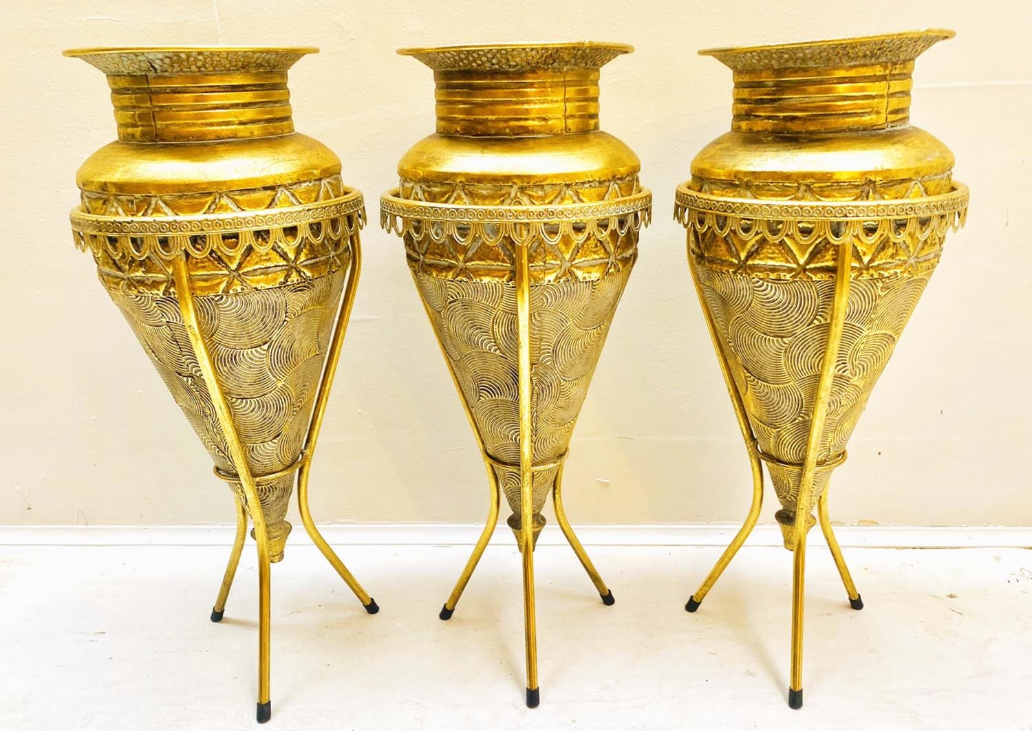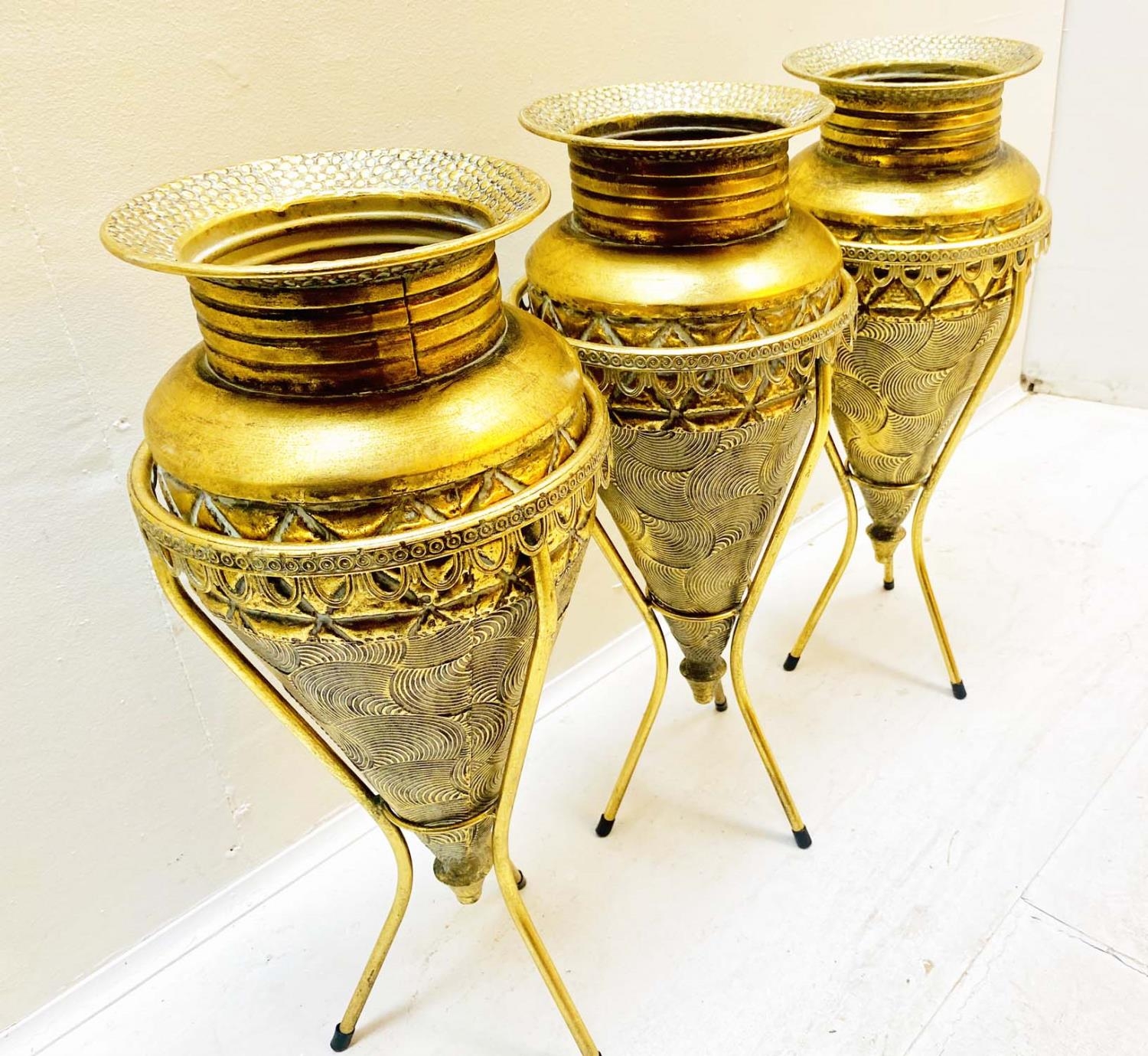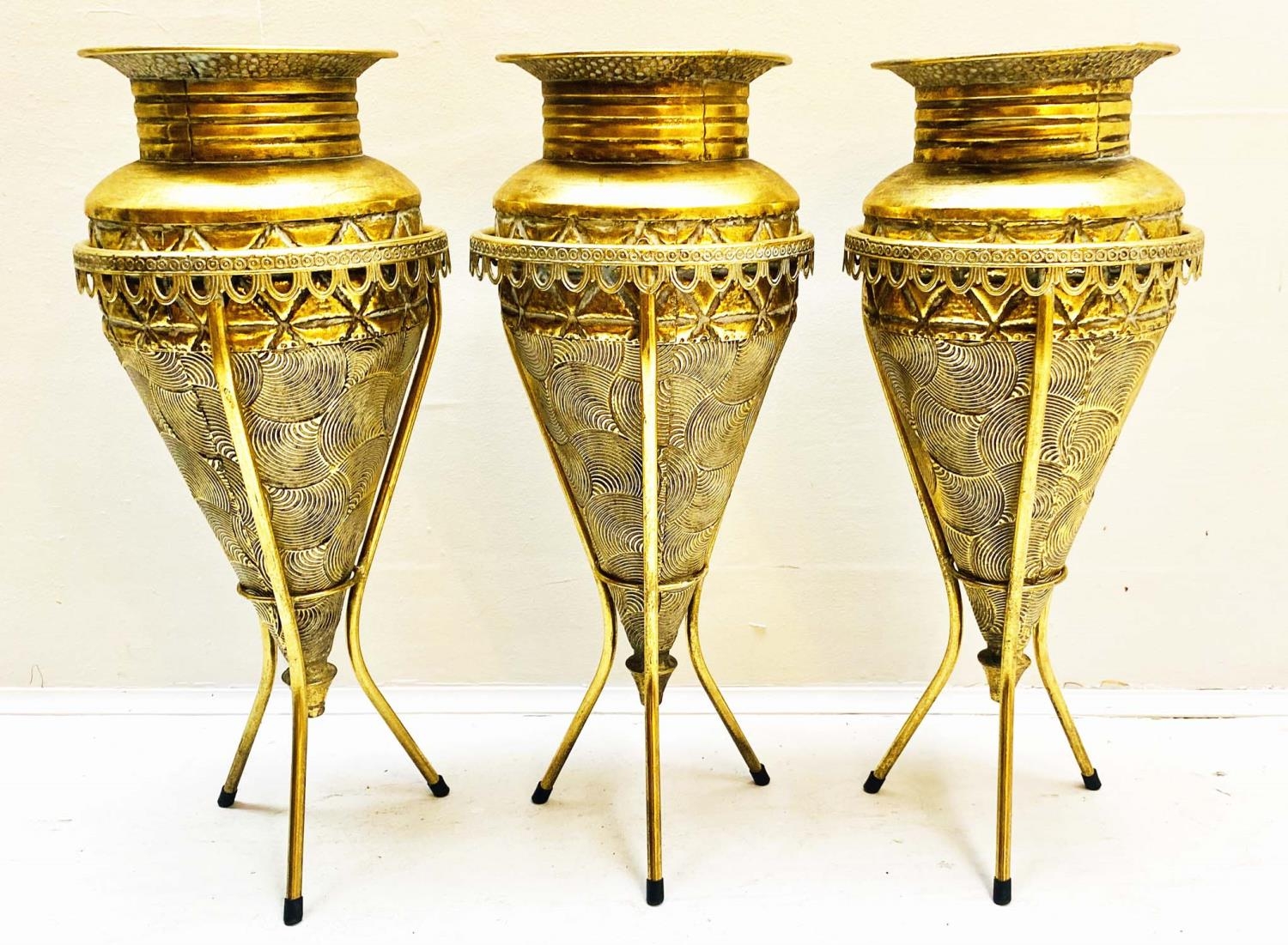 VASES ON STANDS, set of three, tapered form, textured gilt metal, 58cm H x 22cm diam. (3)