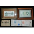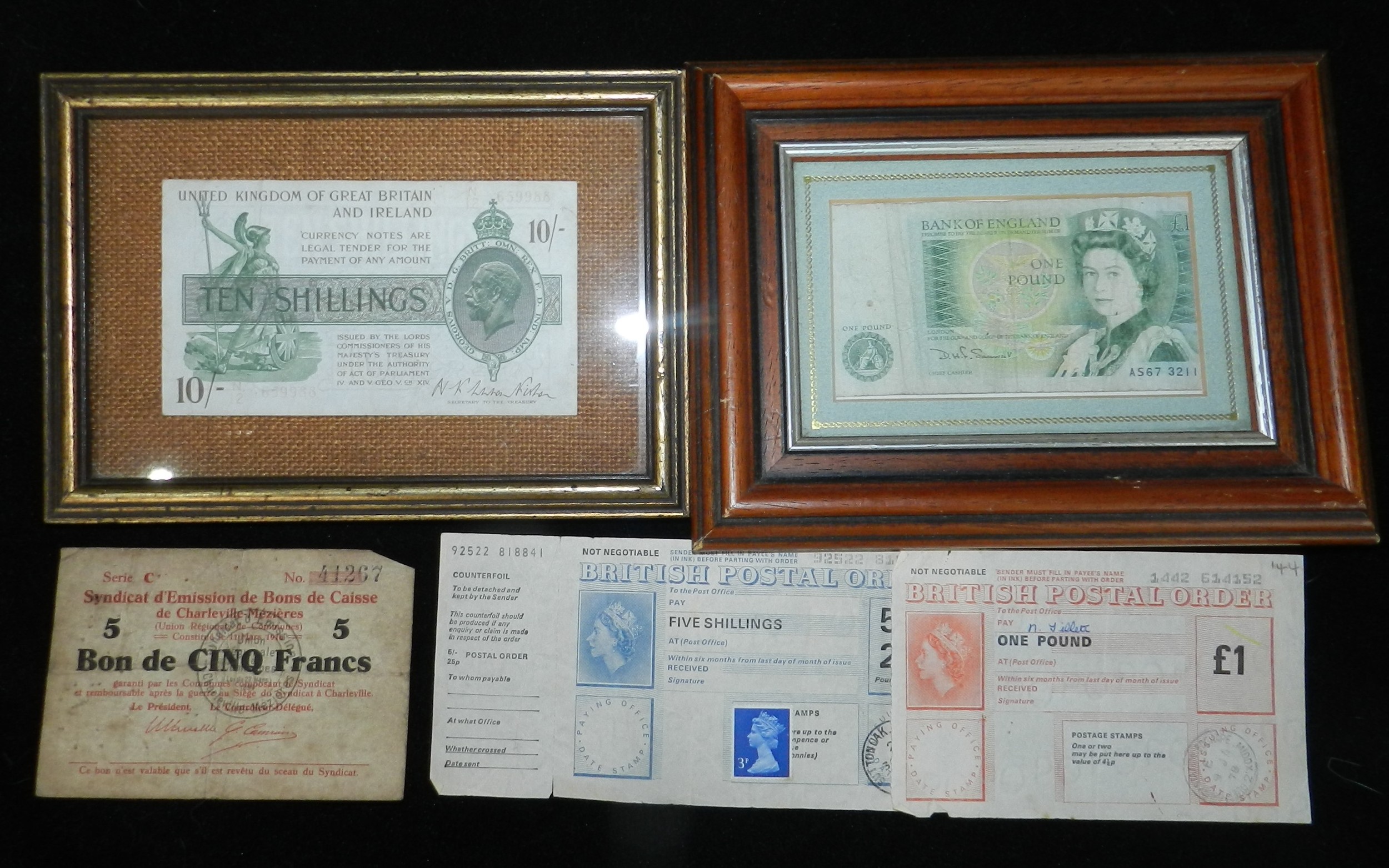Two framed banknotes, French Commune 5 franc note issued in Charleville-Mezieres, also 2 British postal orders circa 1970s