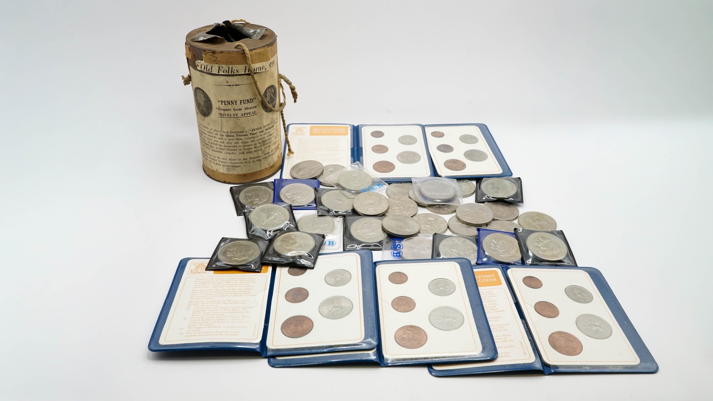 Collection of Assorted Coins Including "Penny Fund" Tin With Contents