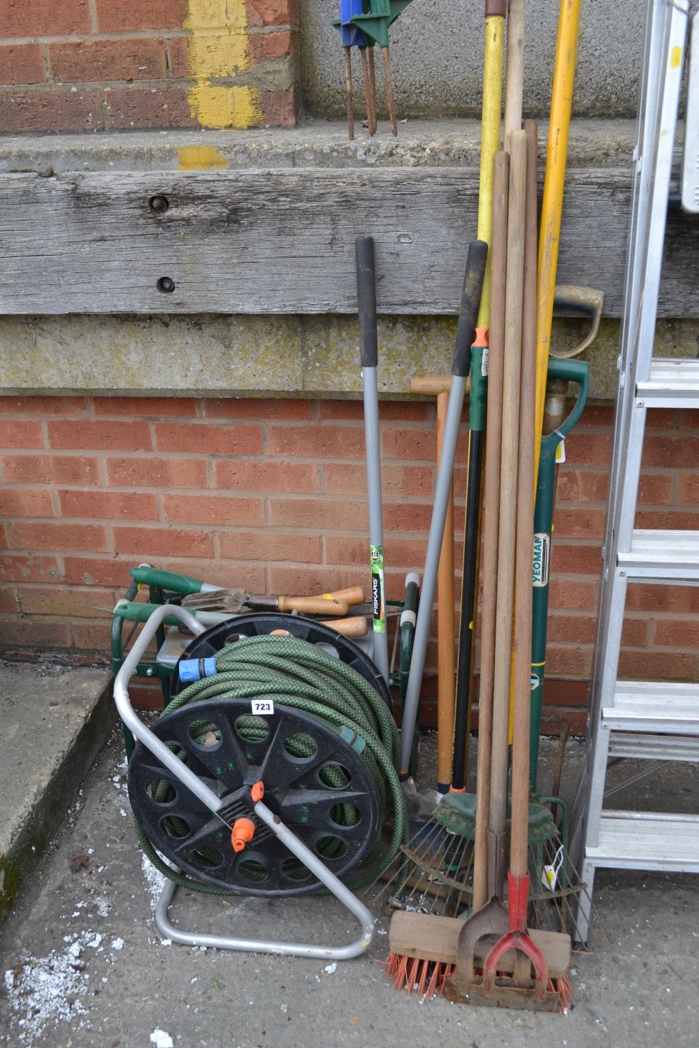 QUANTITY OF GARDEN TOOLS, HOSEPIPE, ETC.