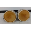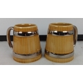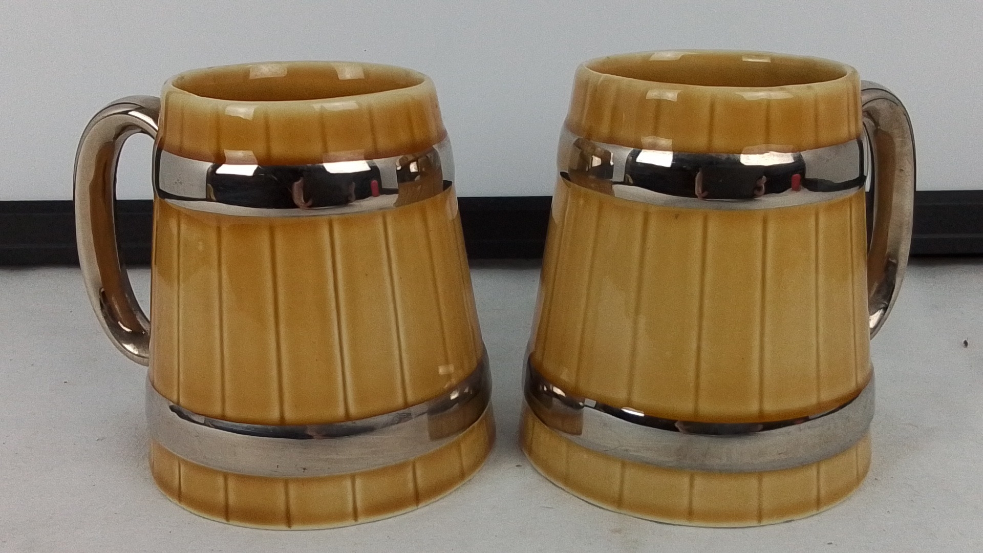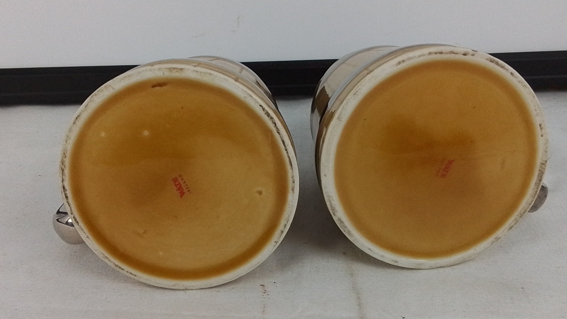 Pair of Wade ceramic tankards, of barrel form with yellow glaze and chromed bands and handles, each with printed factory mark to underside.