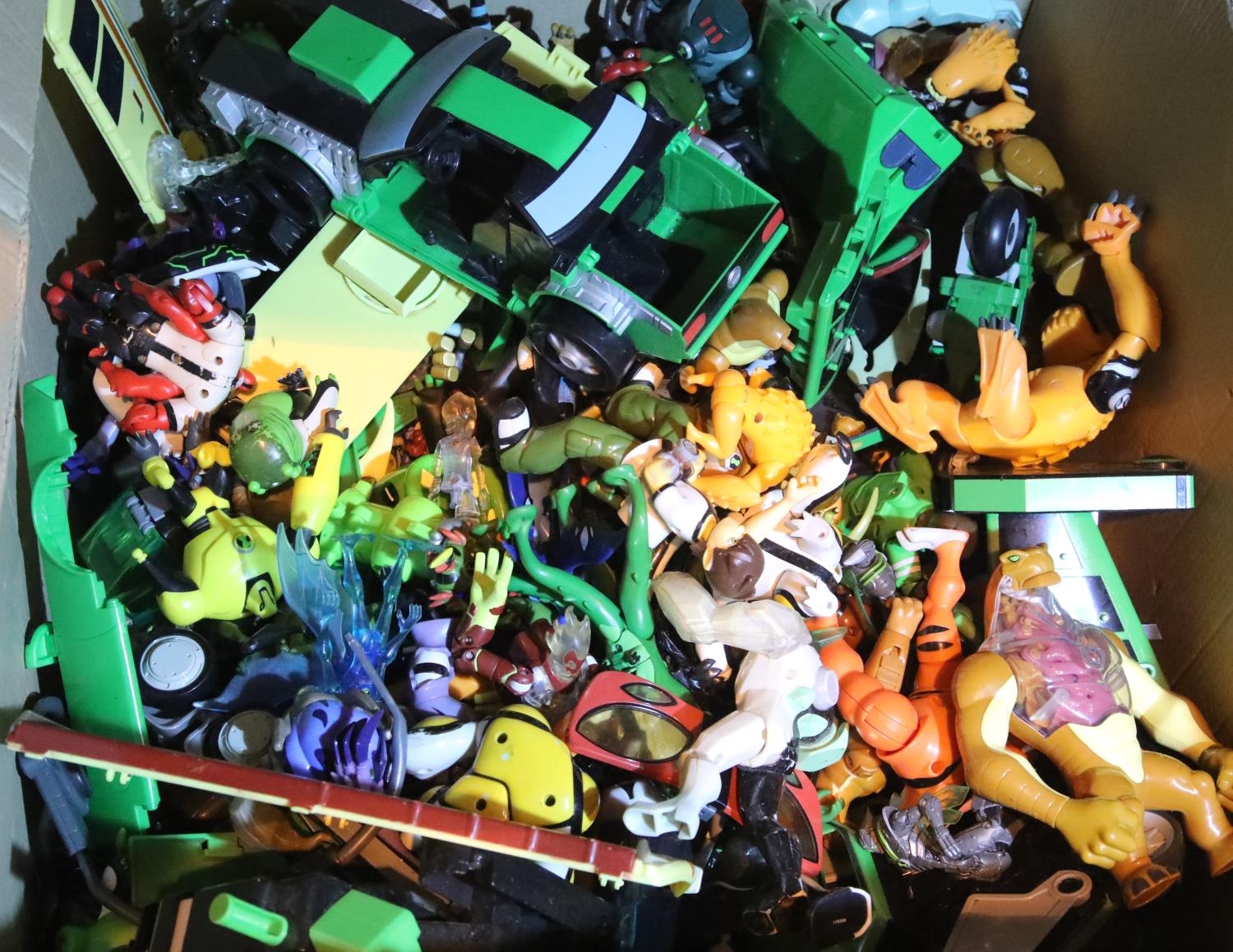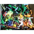 Box of mixed plastic toy figurines. Not available for in-house P&P