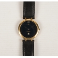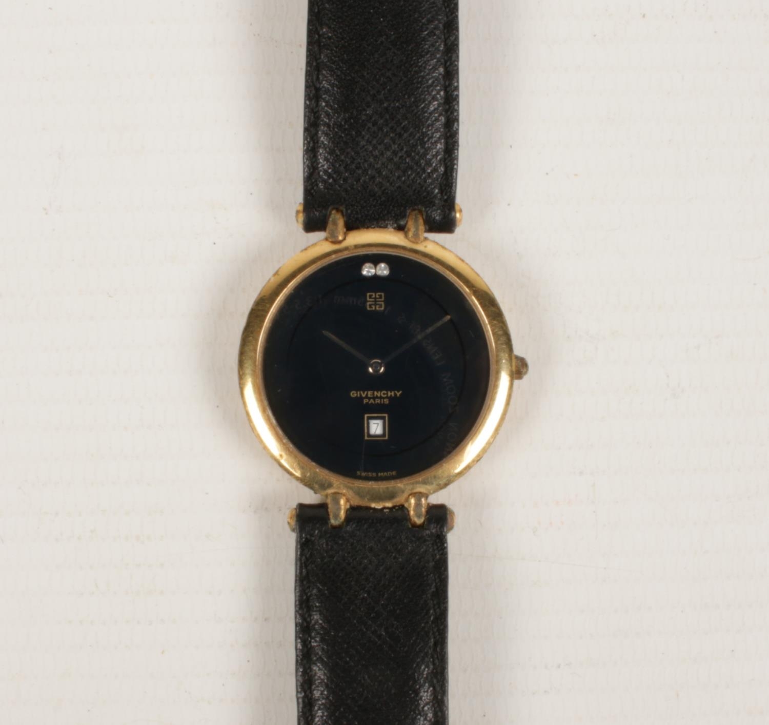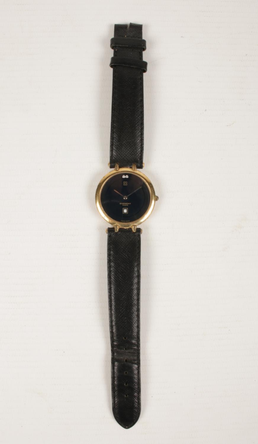 A Givenchy Quartz Men's wrist watch with leather strap. Has a black face with date aperture.