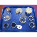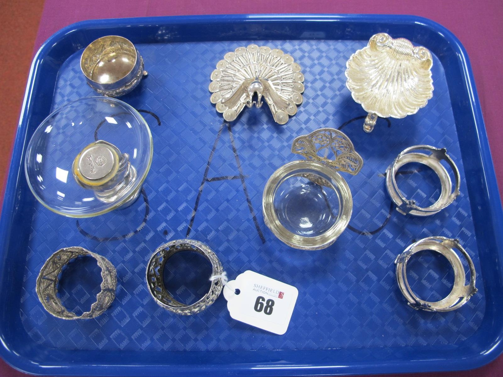 A Decorative Pierced Napkin Ring, together with an Indian salt, a decorative shell salt, a filigree peacock menu holder (indistinctly stamped); Argit SFOA salt frames (lacking liners); a filigree salt with clear glass liner; filigree napkin ring, etc. (9)
