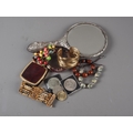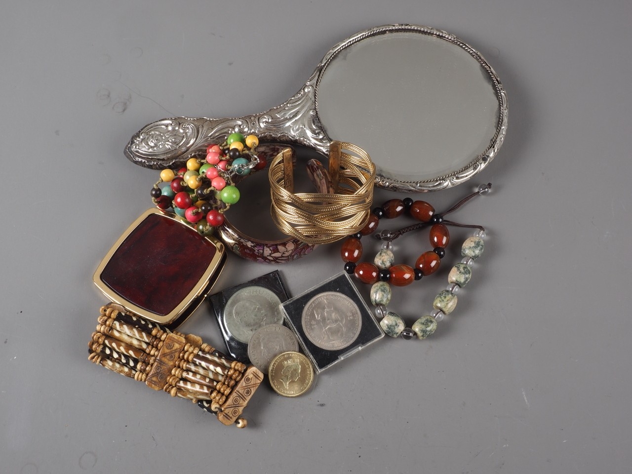 A silver backed dressing table mirror with scrolled and floral decoration, beaded bracelets and other items, various