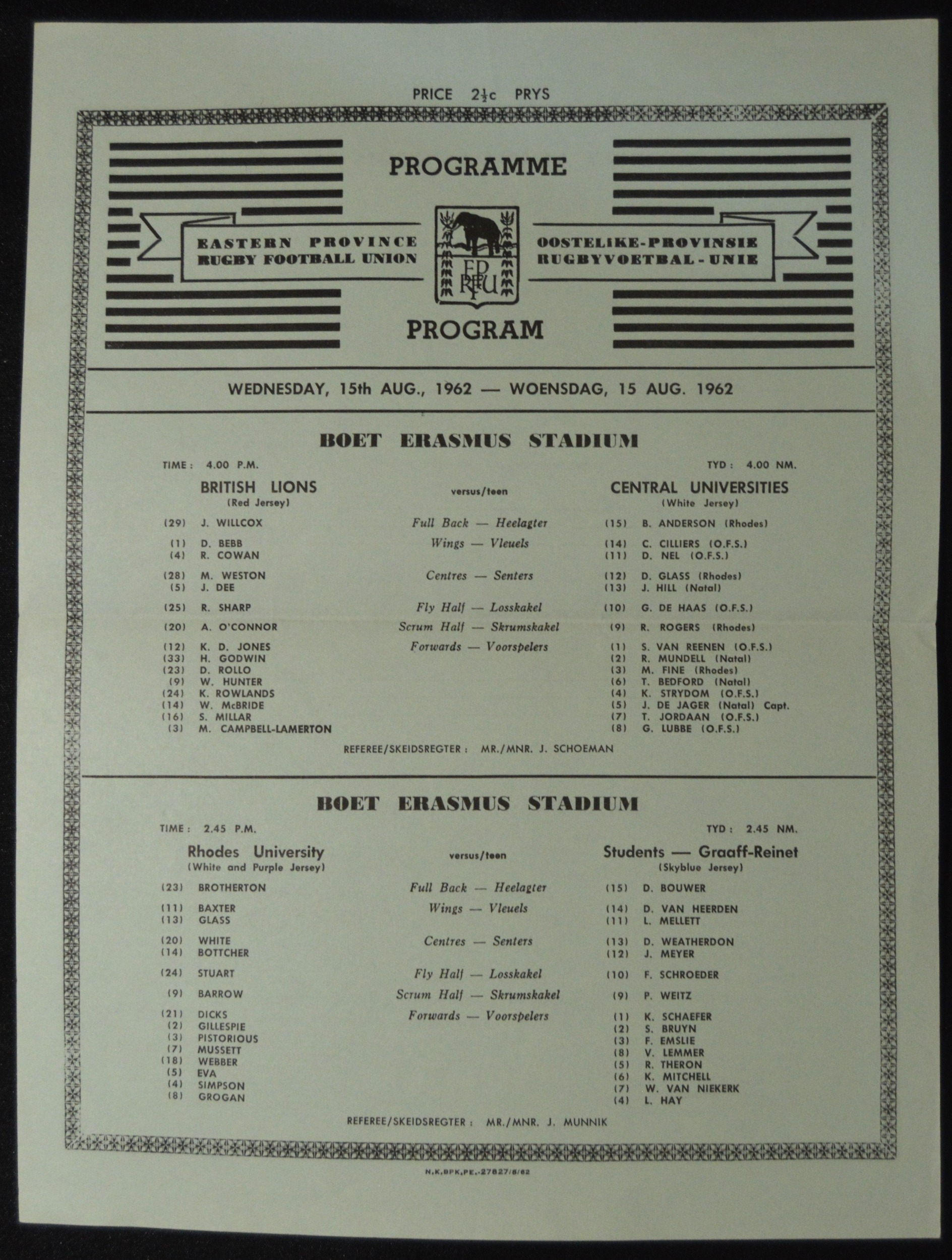 1962 British and I Lions in S Africa Rugby Programme: Foldover green sheet v Central Universities, usual Port Elizabeth paper-style issue, one fold, VG