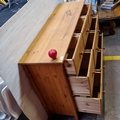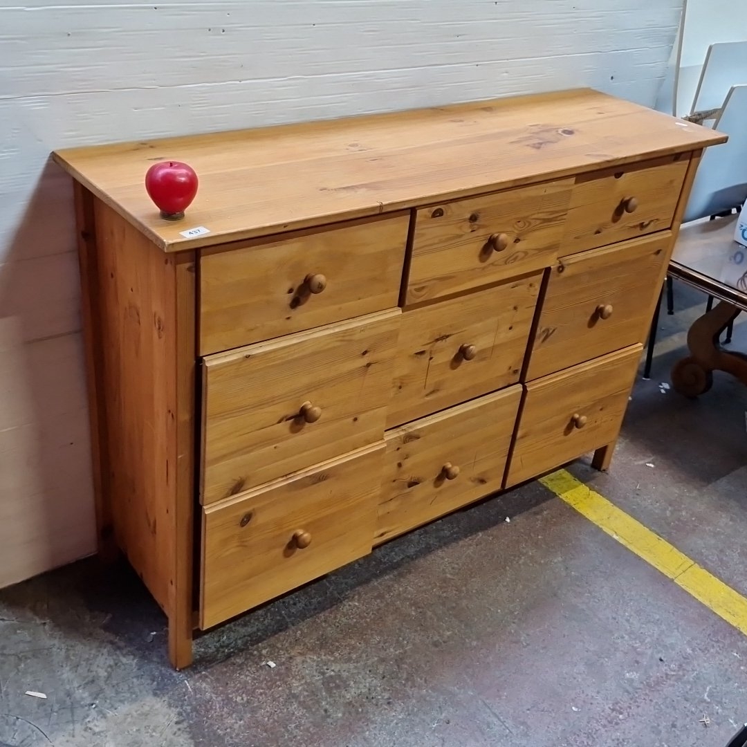 A pine chest of nine drawers, the facade arranged with graduated drawers fitted with turned wooden knop handles, on bracket feet. Please note, the image of the modelled item was created by a new imaging/ staging software called showiton.ai. Upload a simple image of a piece of jewellery and the software stages it on a model for you. Paste the URL (showiton.ai) into your browser and try it for free. It’s a very simple, user-friendly platform.