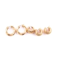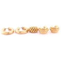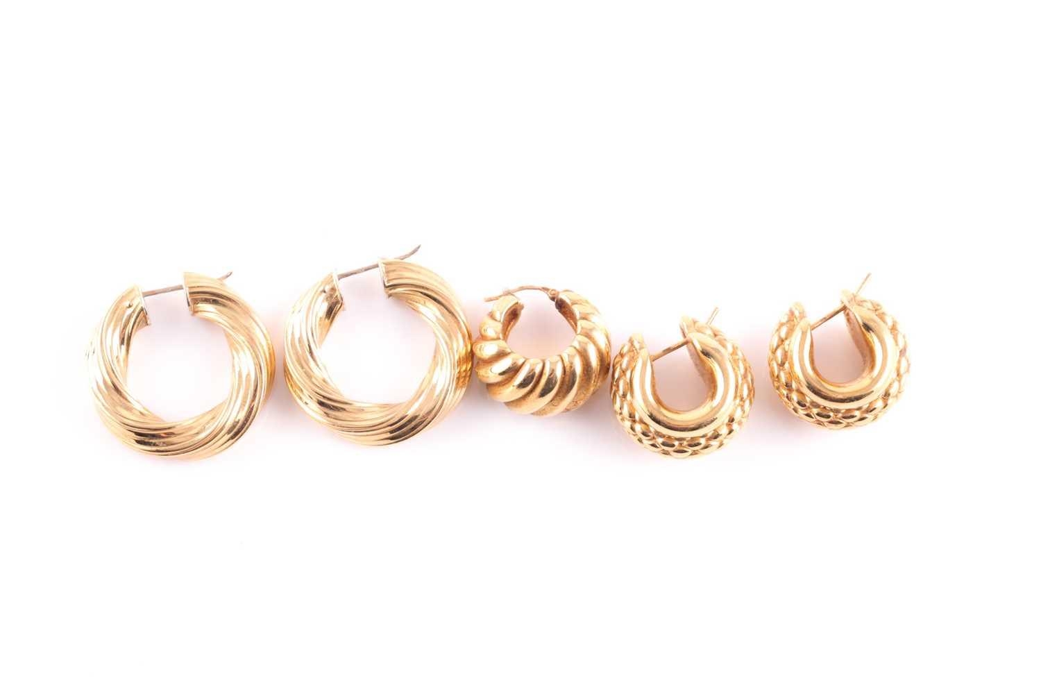 A pair of yellow metal rope-twist hollow earrings, marked 750, 3.2 cm long, together with a pair of 18ct yellow gold hollow earrings, with textured finish, marked 750, 2.1 cm long, and a single yellow metal lobed earring. (5)