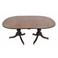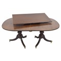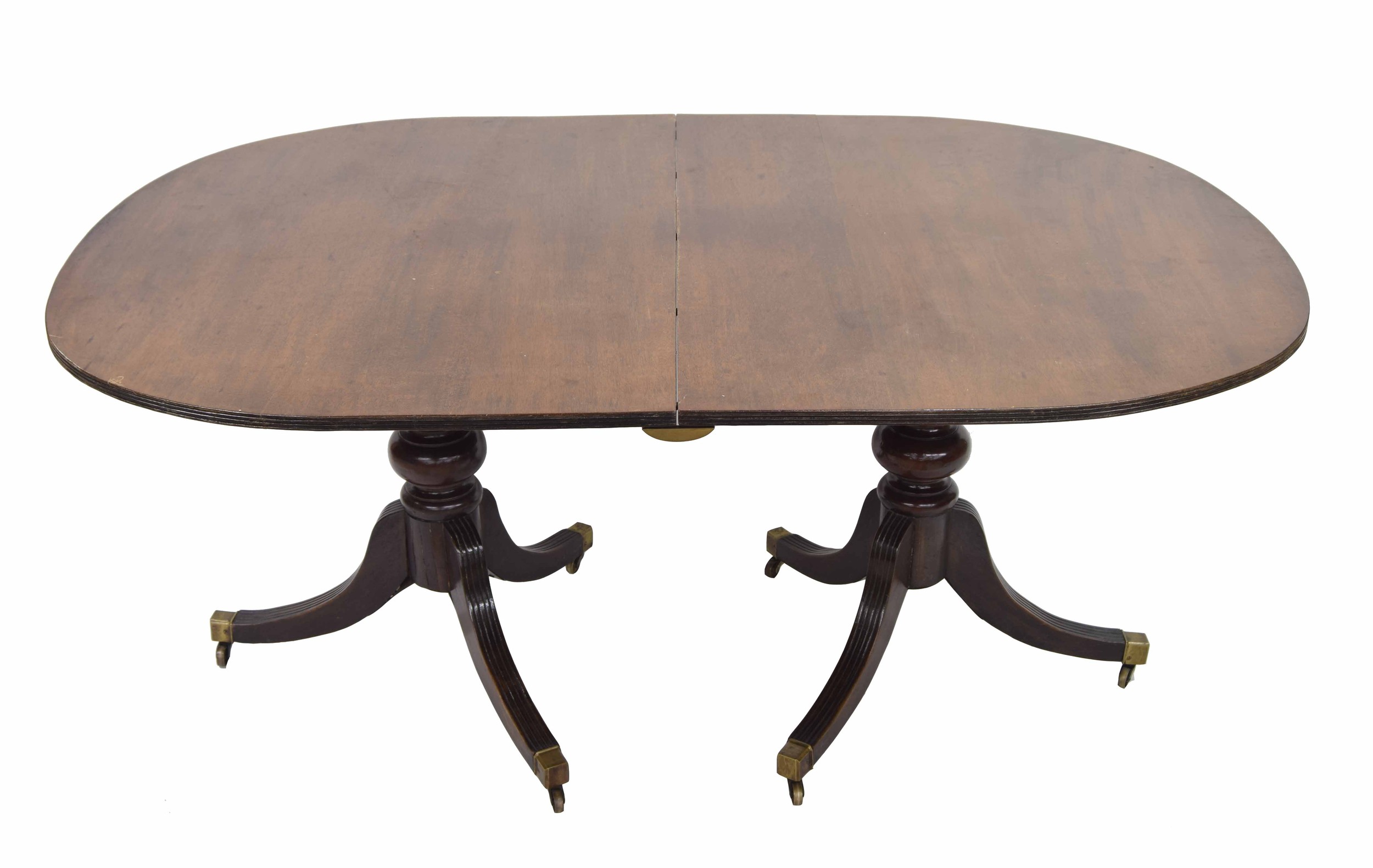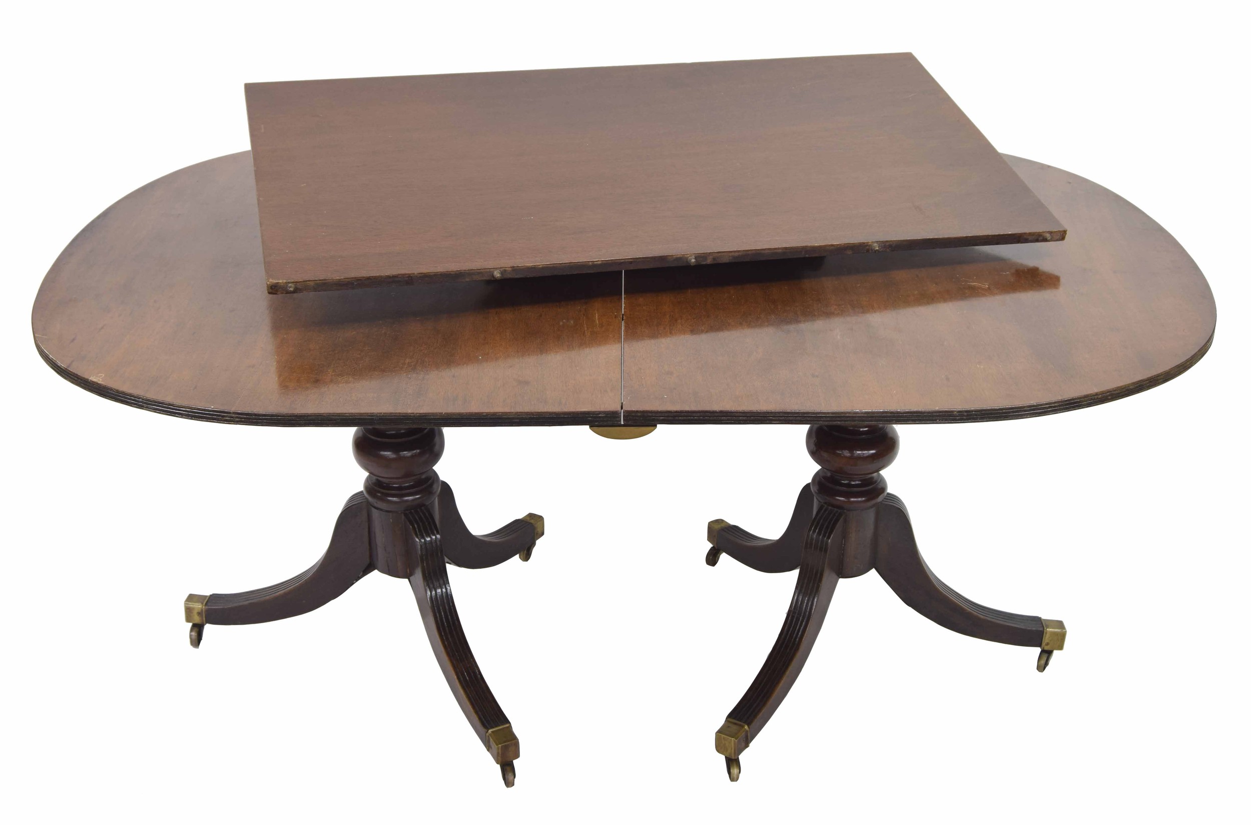 19th century mahogany twin pedestal D-end extending dining table, with bulbous turned columns and tripod fluted downswept supports terminating with brass capped castors, one leaf, 87" x 43" extended, 28" high