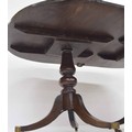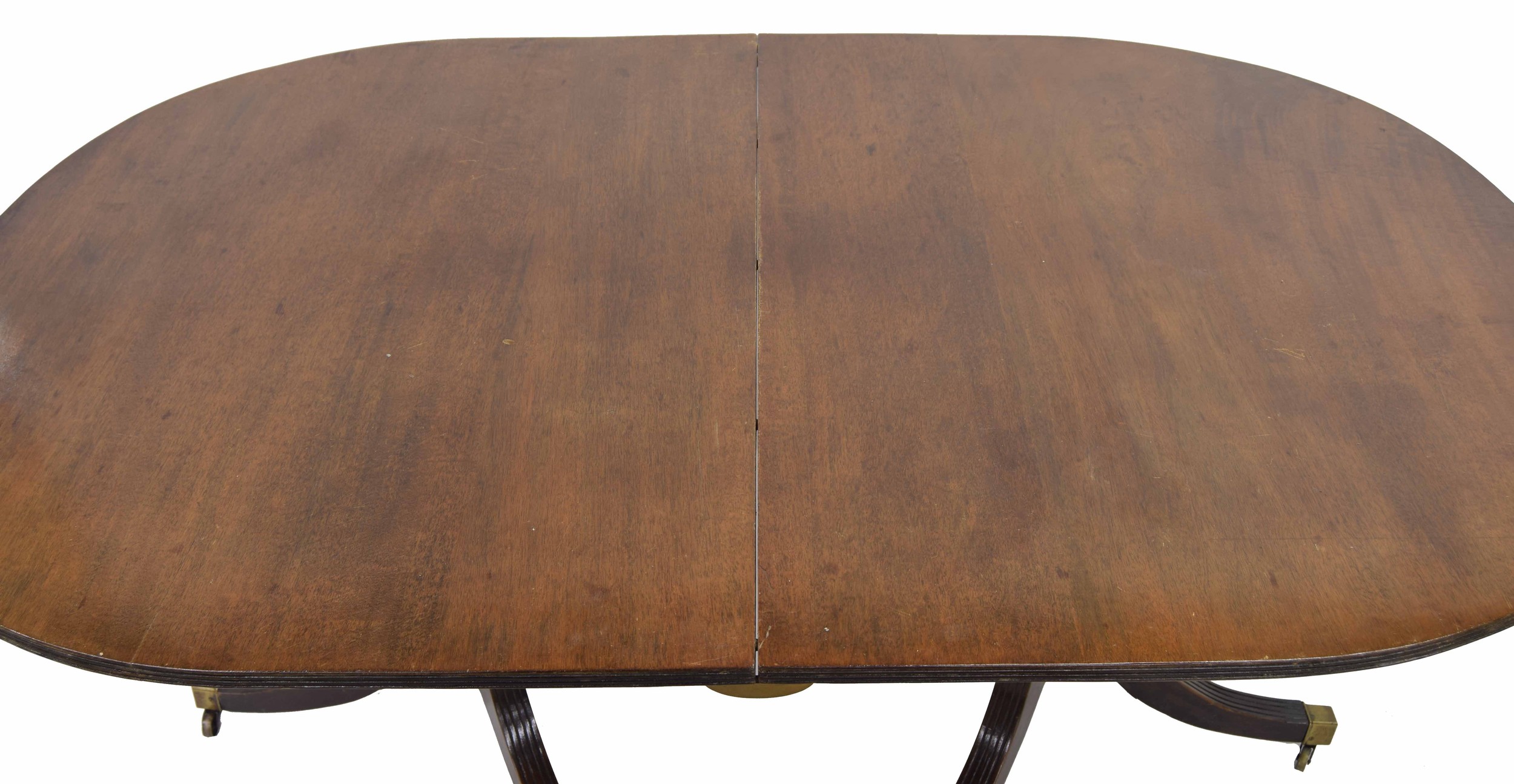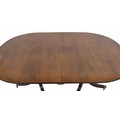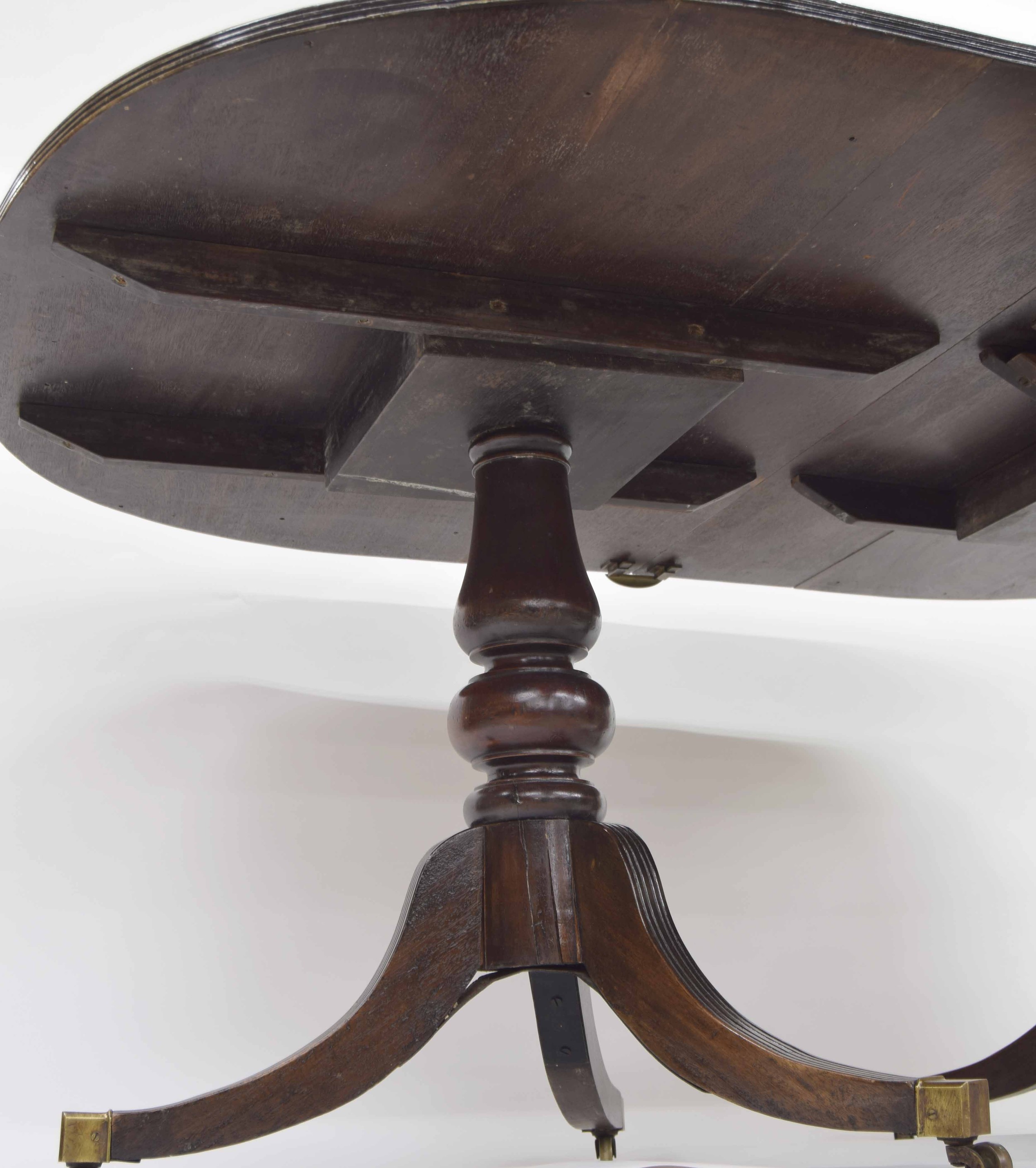 There is no reason to believe the extra leaf is not original, obviously a darker colour in comparison to the two ends likely been stored away for a while, we only have two metal clips so full extension has been very temporary here at the saleroom, one D end has movement and separation between the two timbers which will require strengthening and attentions, age consistent abrasions and wear across the table top though colour rather even across both D ends, historic added strengthening supports to the underside of one D end, and further faults to this turned pedestal and tripod support around the shaped legs, splits and separations to note, important please see detailed additional images attached as a guide.