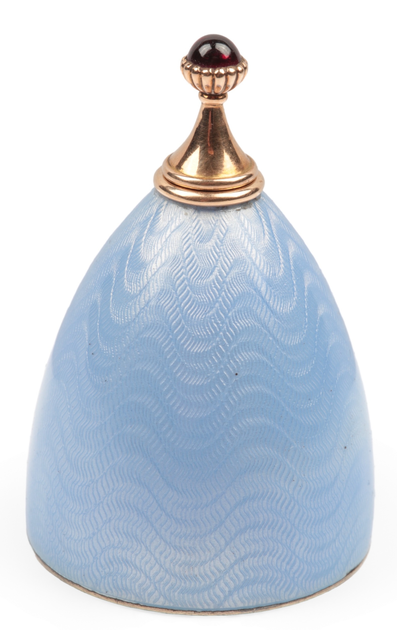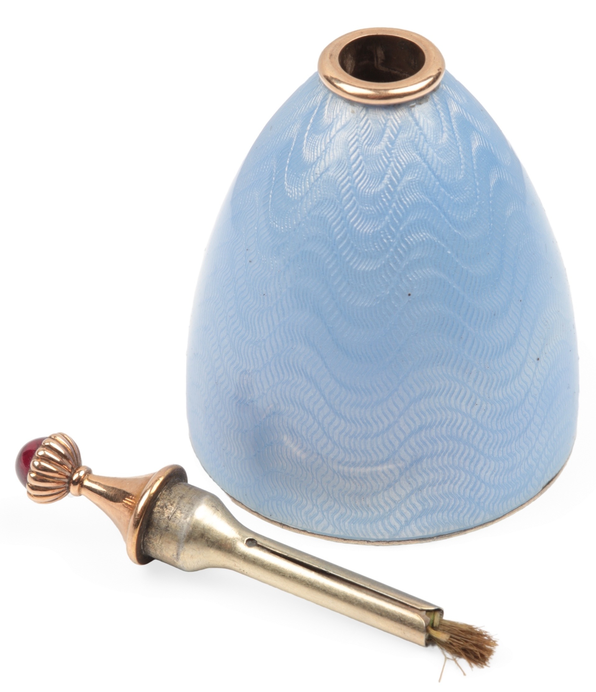 Ivan Britzin, a fine enamel and garnet gum pot, Russia, circa 1905, of high domed form, applied with light blue guilloché enamel, holding a brush, its handle capped with a cabochon garnet forming the lid, mounted in silver and gold, height approximately 5.5cm, base with Russian 88 zolotnik assay mark for silver, workmaster's mark for Ivan Britzin, gross weight approximately 50 grams