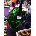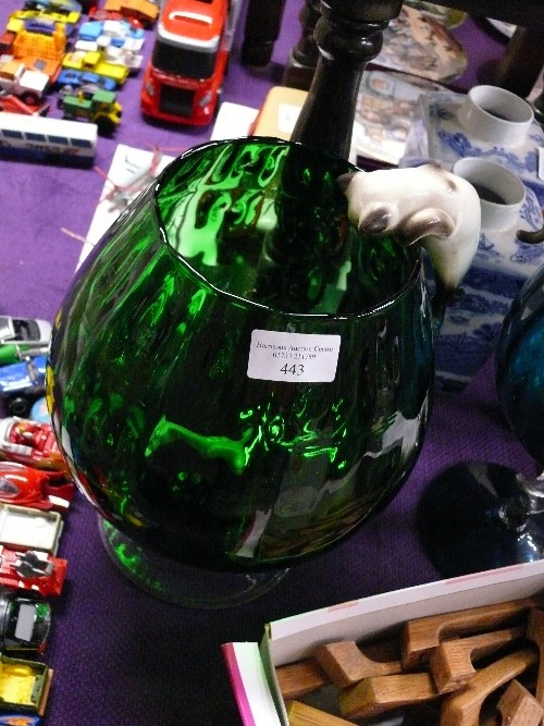 A VINTAGE EMERALD GLASS BALLOON BRANDY GLOBE WITH SIAMESE CAT AND MOUSE