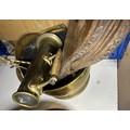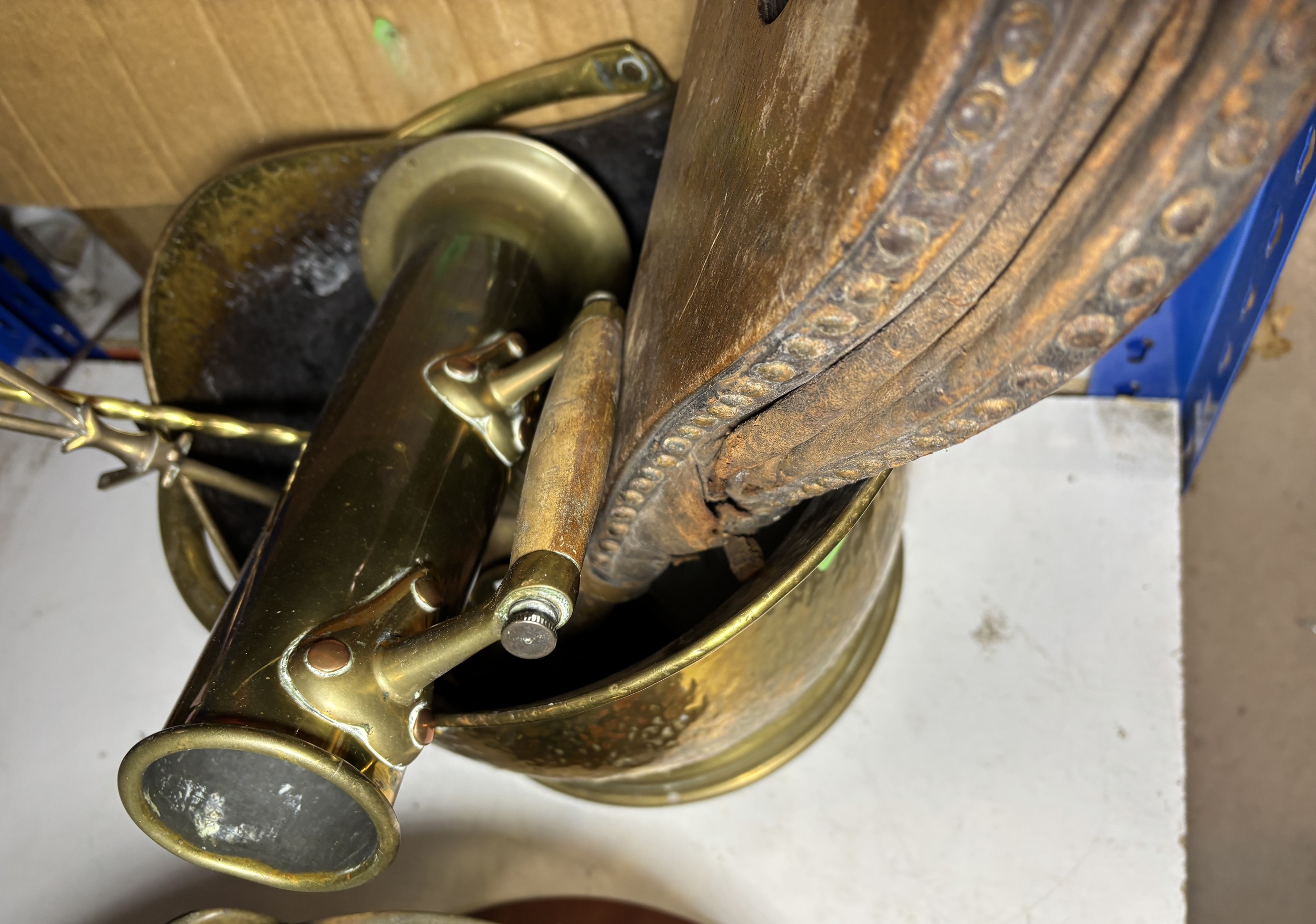 A brass coal bucket; a pair of bellows; a mantle clock etc.
