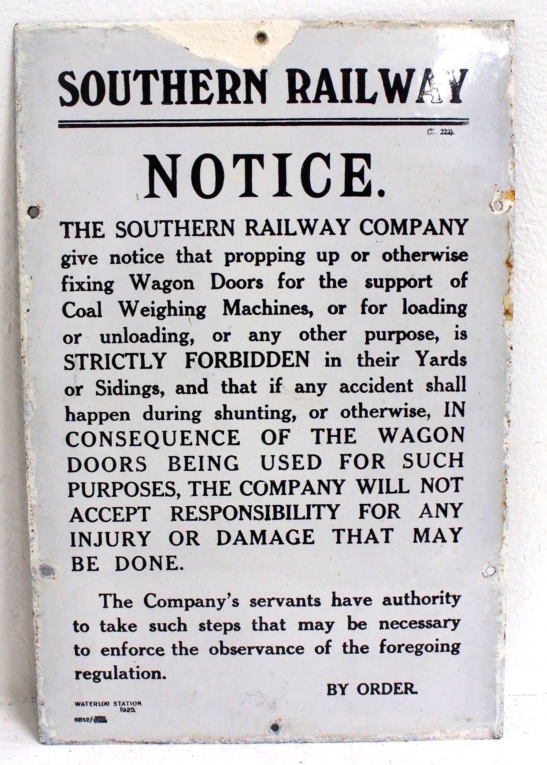 SR enamel notice "Propping up Wagon Doors" 11¾"x 17¾", dated 1925, good condition with enamel repair at top fixing hole as per image. (C2) (Dispatch by Mailboxes/Collect from Banbury Depot)