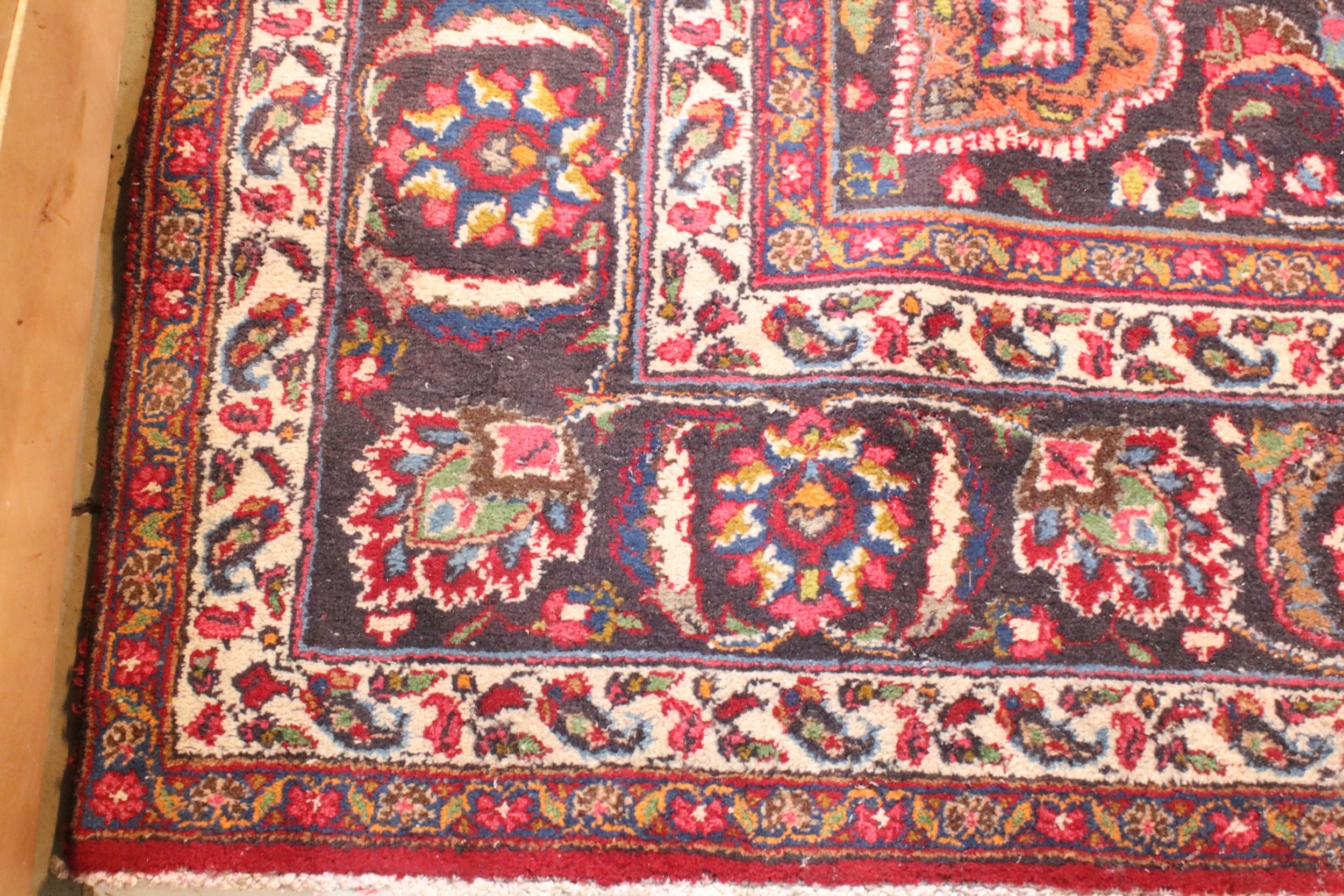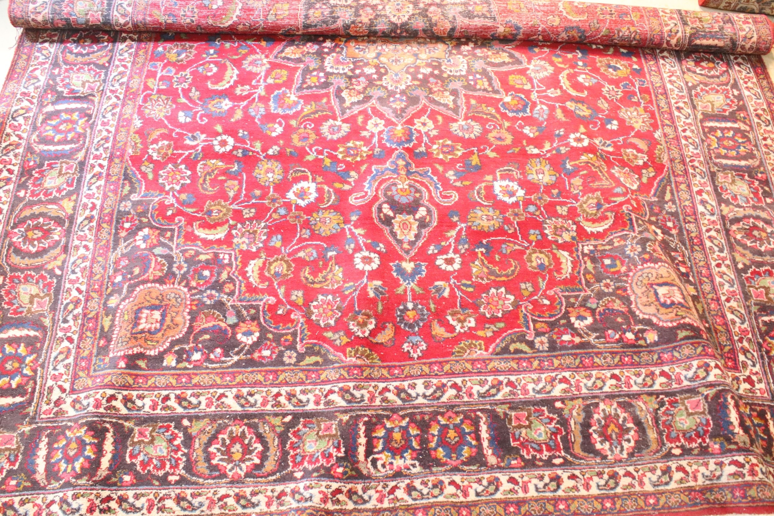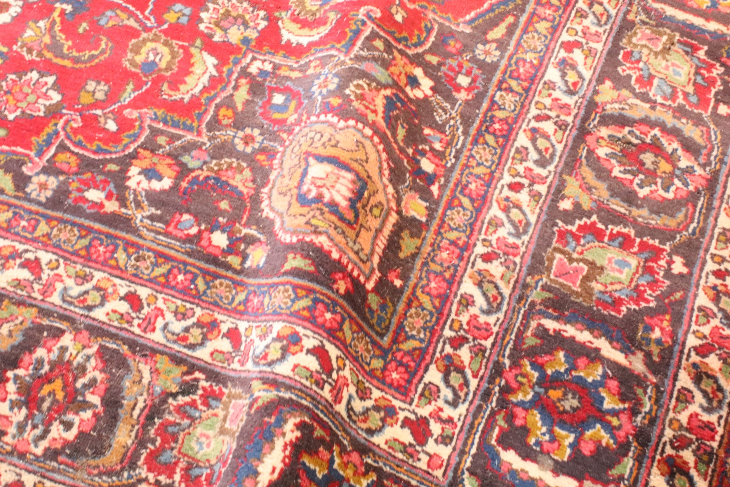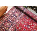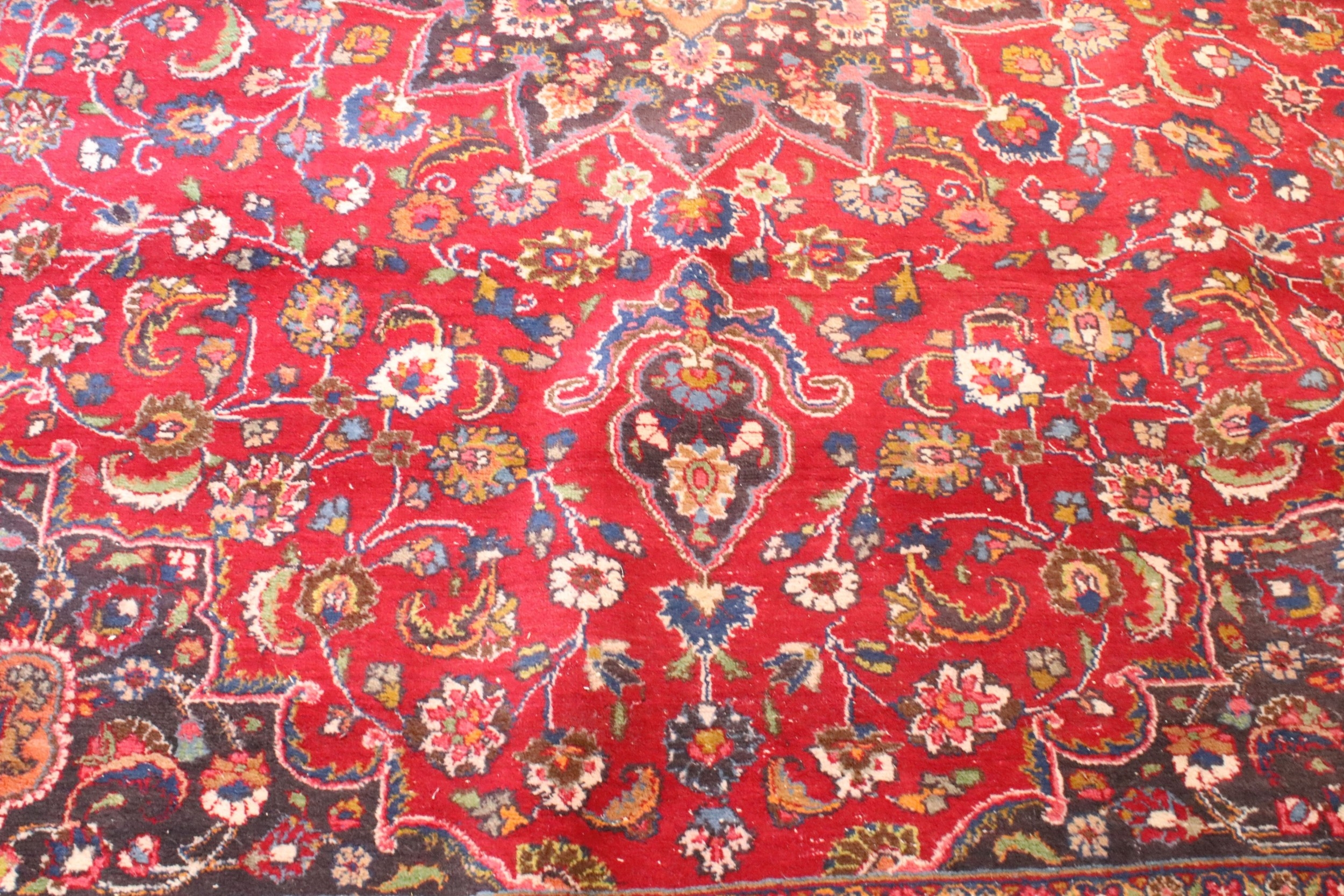 Persian hand-knotted rug, of large proportions, on red and deep blue ground, 301 x 376cm