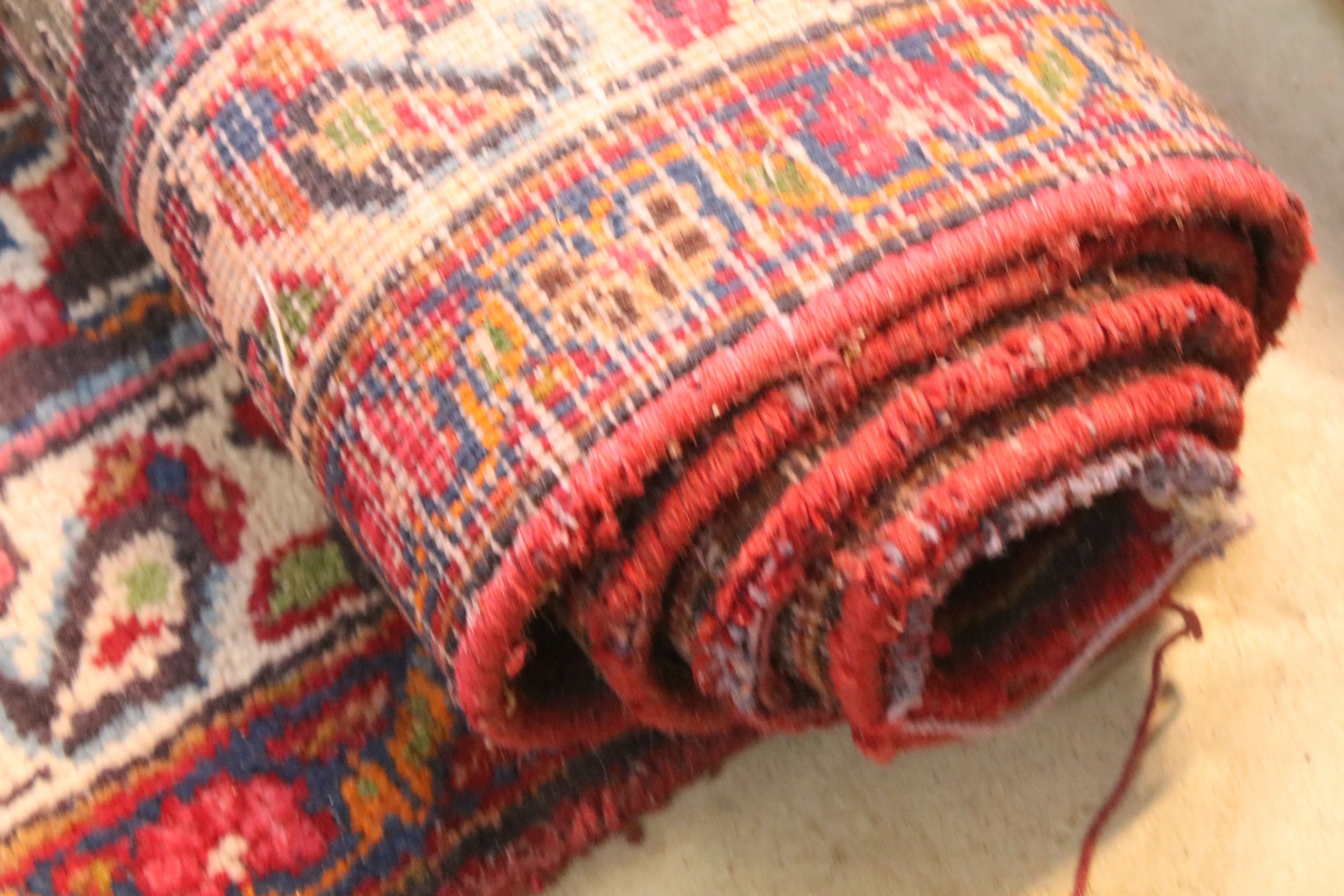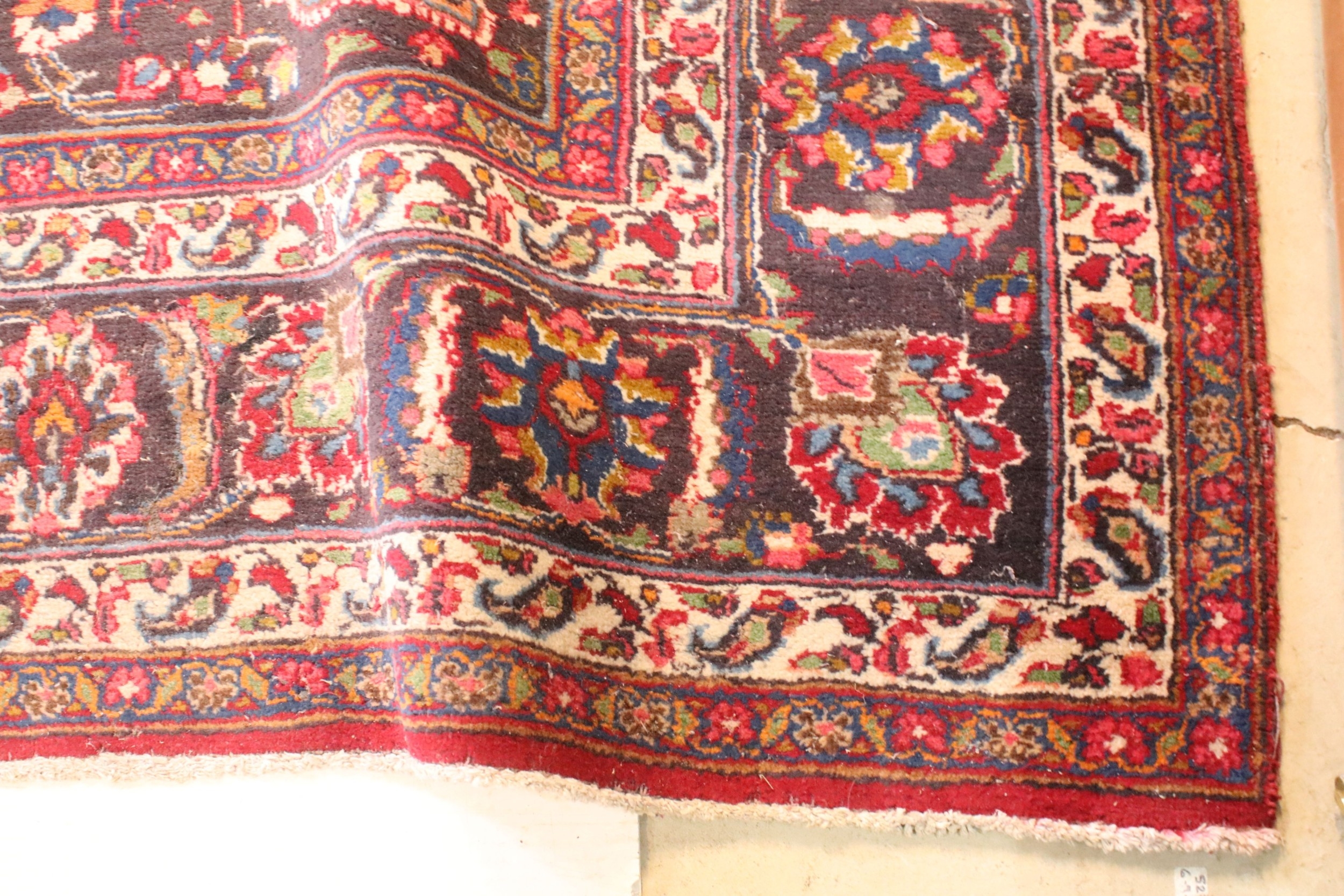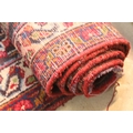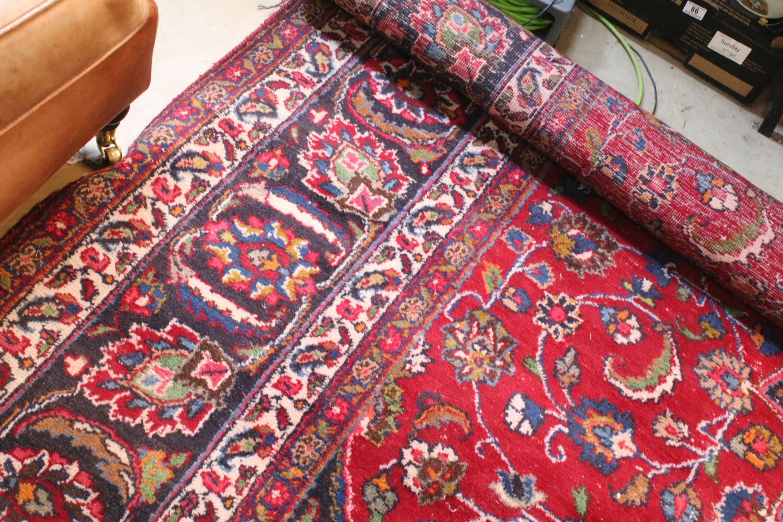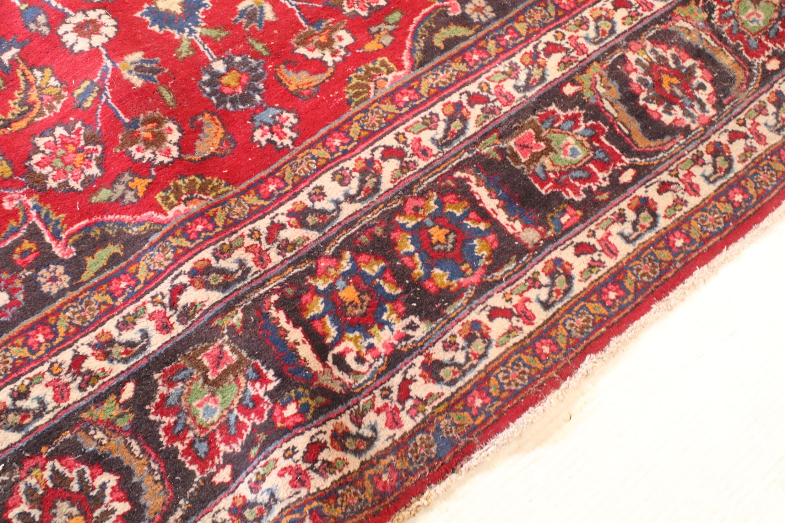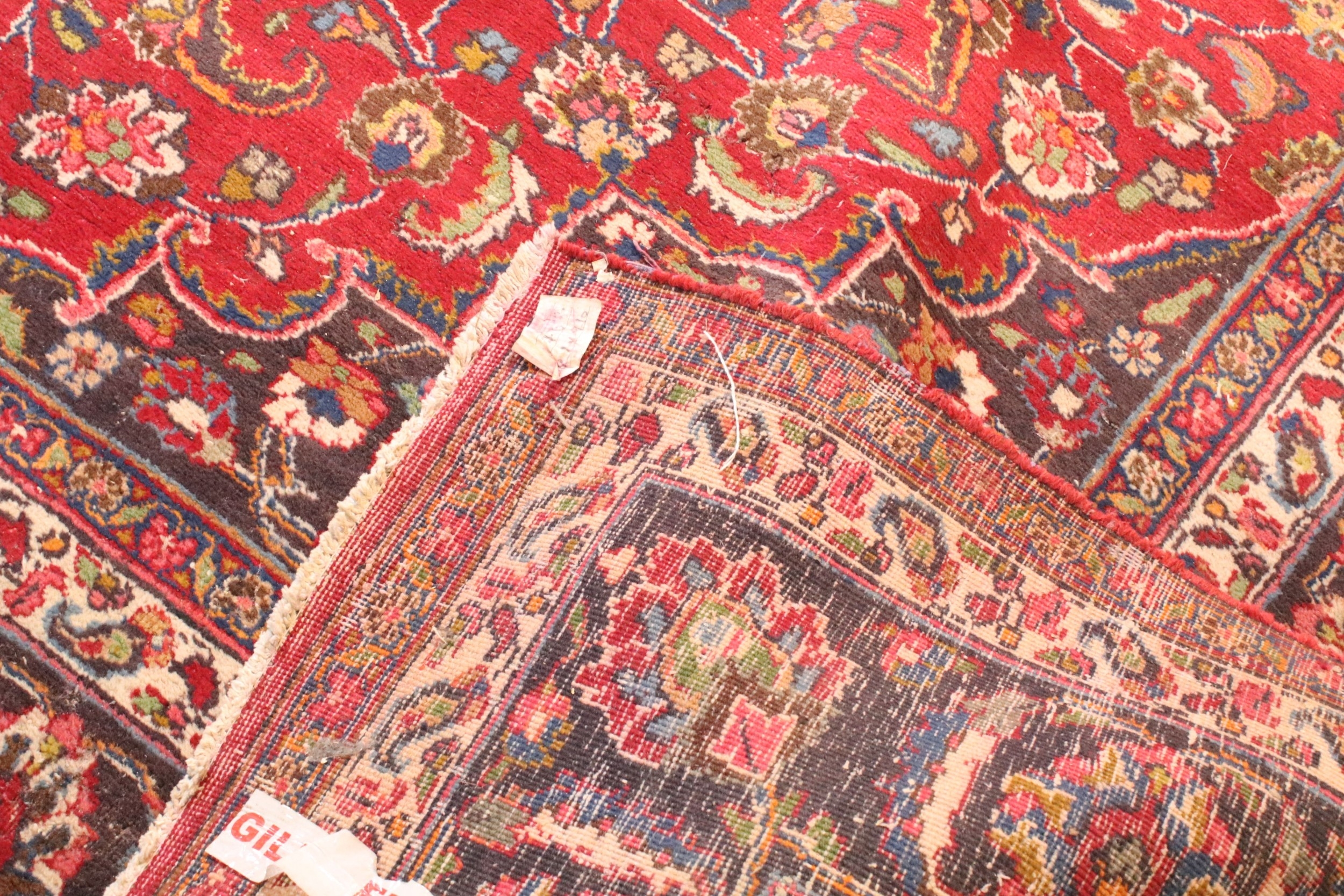 Persian hand-knotted rug, of large proportions, on red and deep blue ground, 301 x 376cm