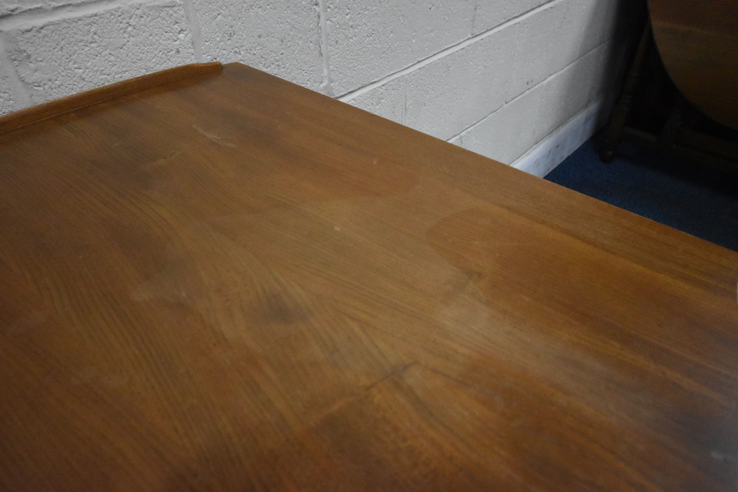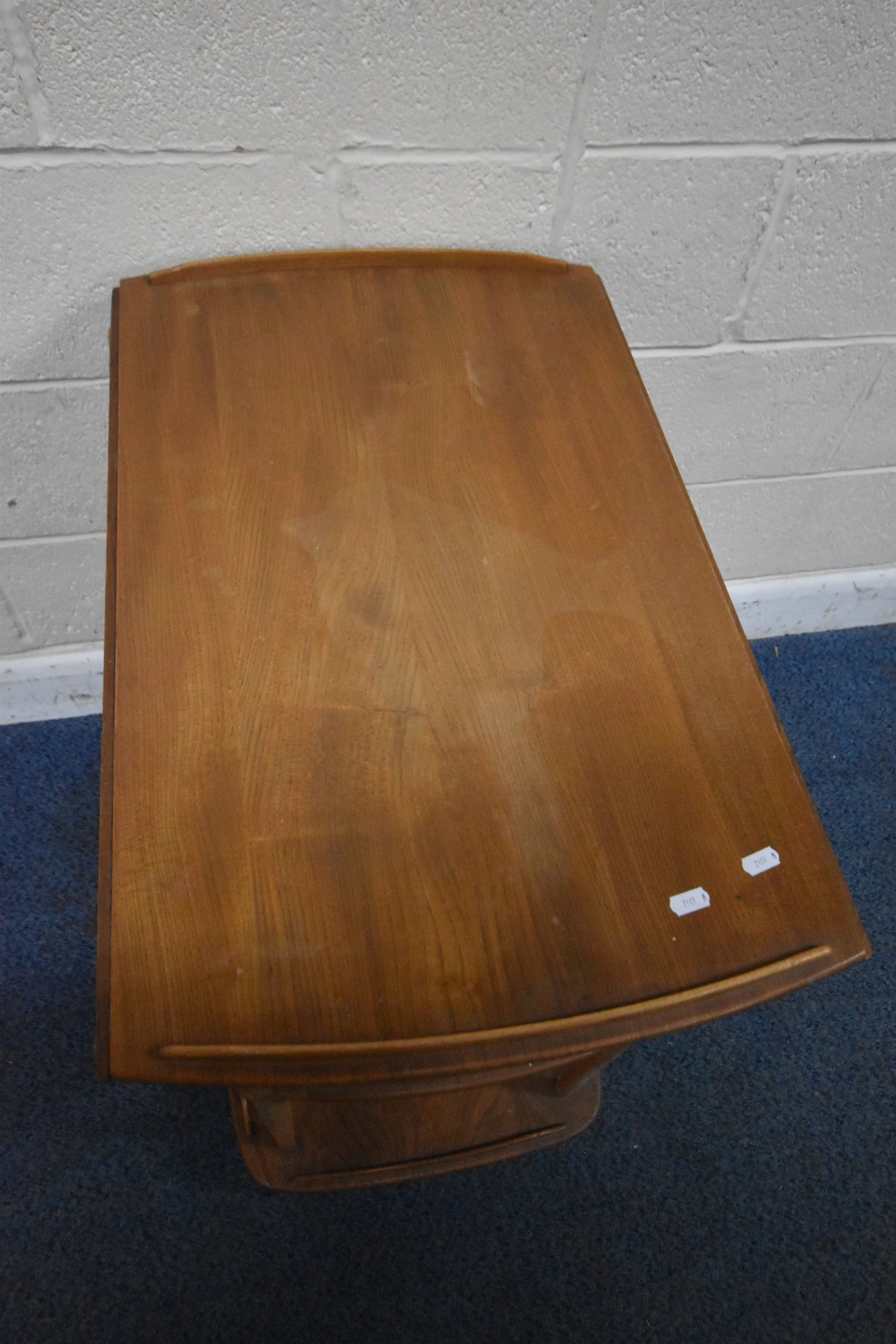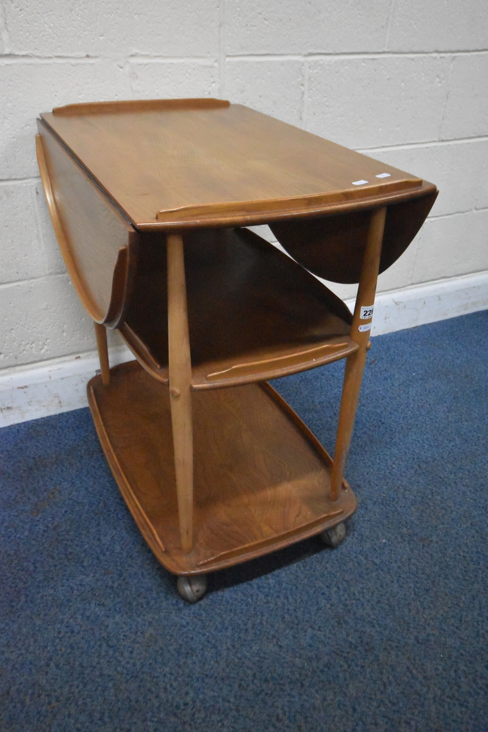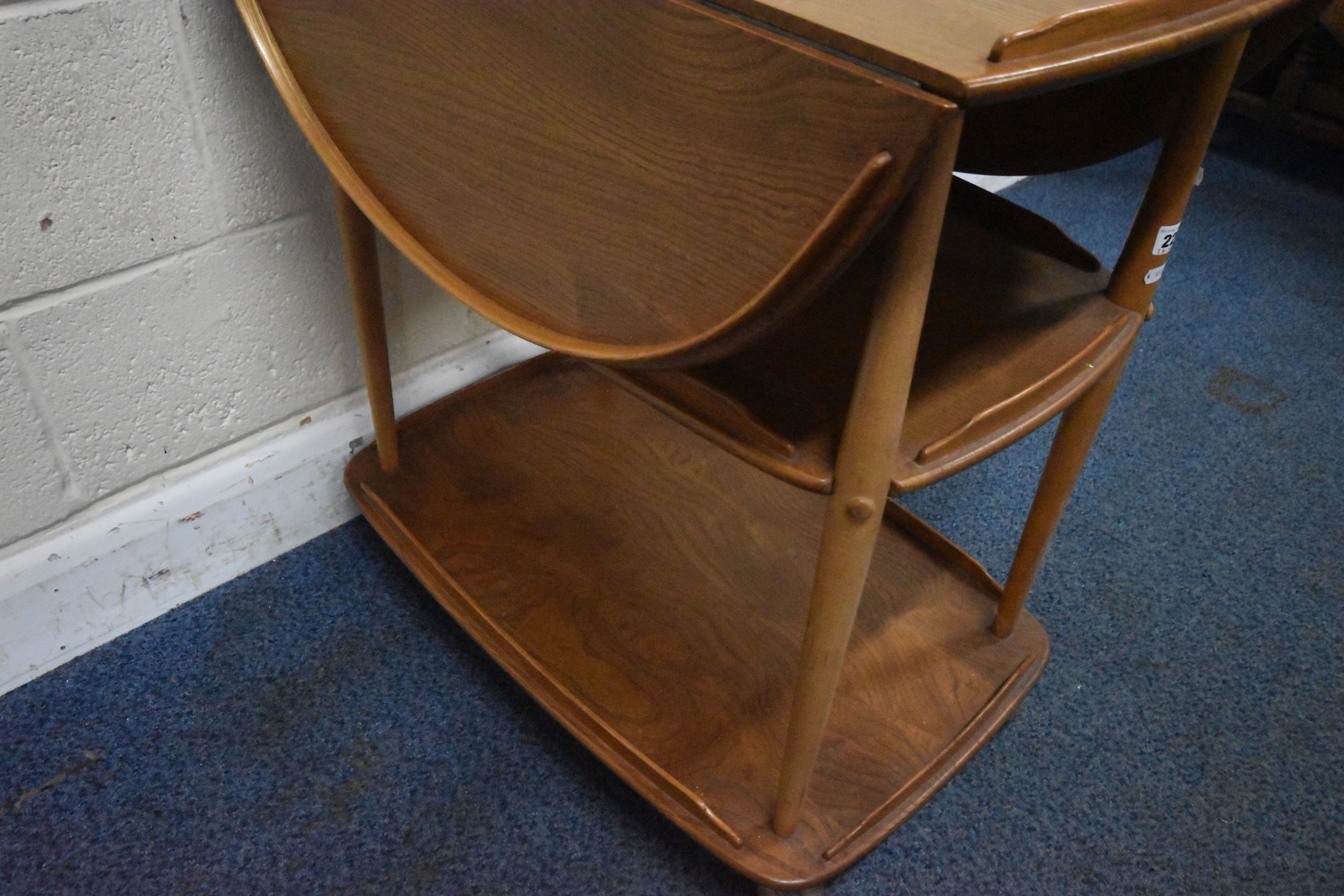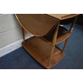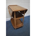 LUCIAN ERCOLANI, A MID-CENTURY ELM AND BEECH THREE TIER DROP LEAF TROLLEY, raised on cylindrical tapered legs, with orbit castors, model number 505, width 49cm x depth 74cm x height 77cm, condition report: marks, discolouration, other wear and usage