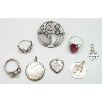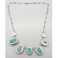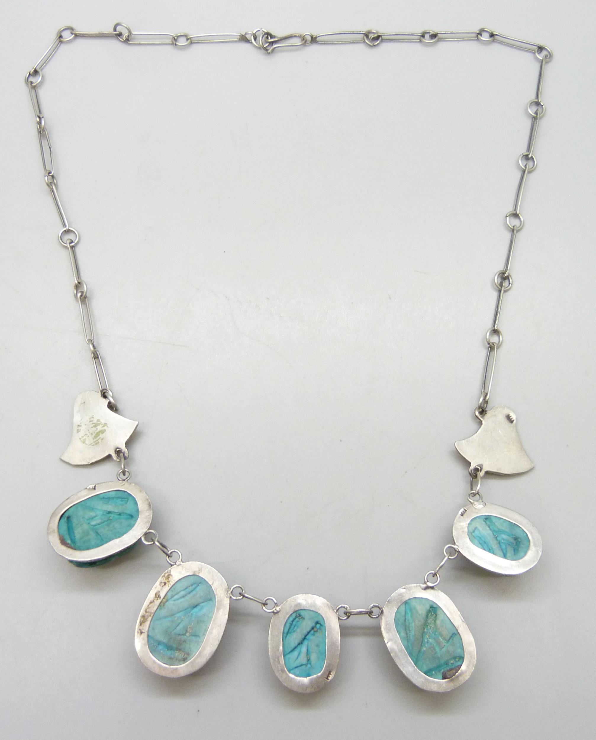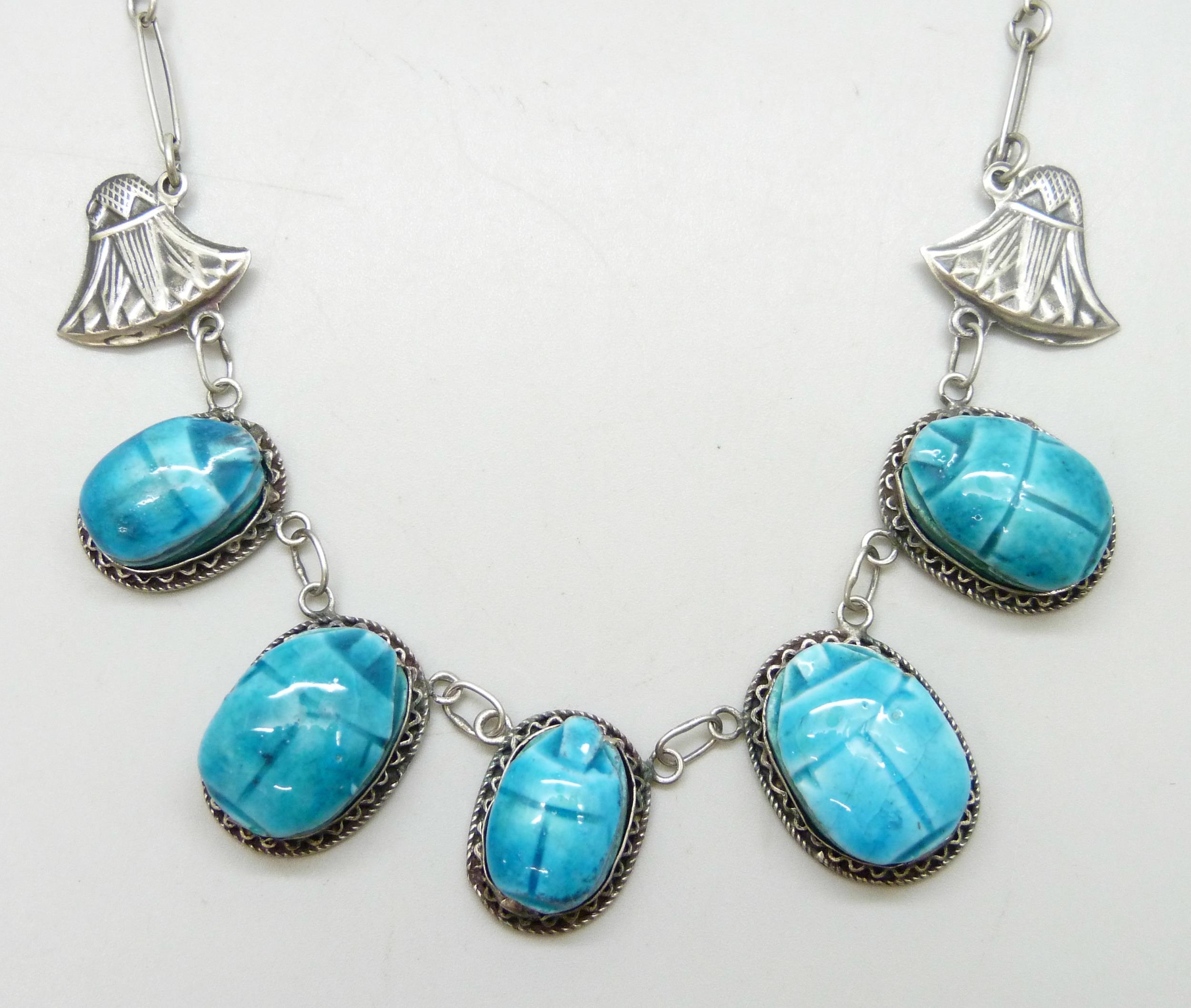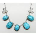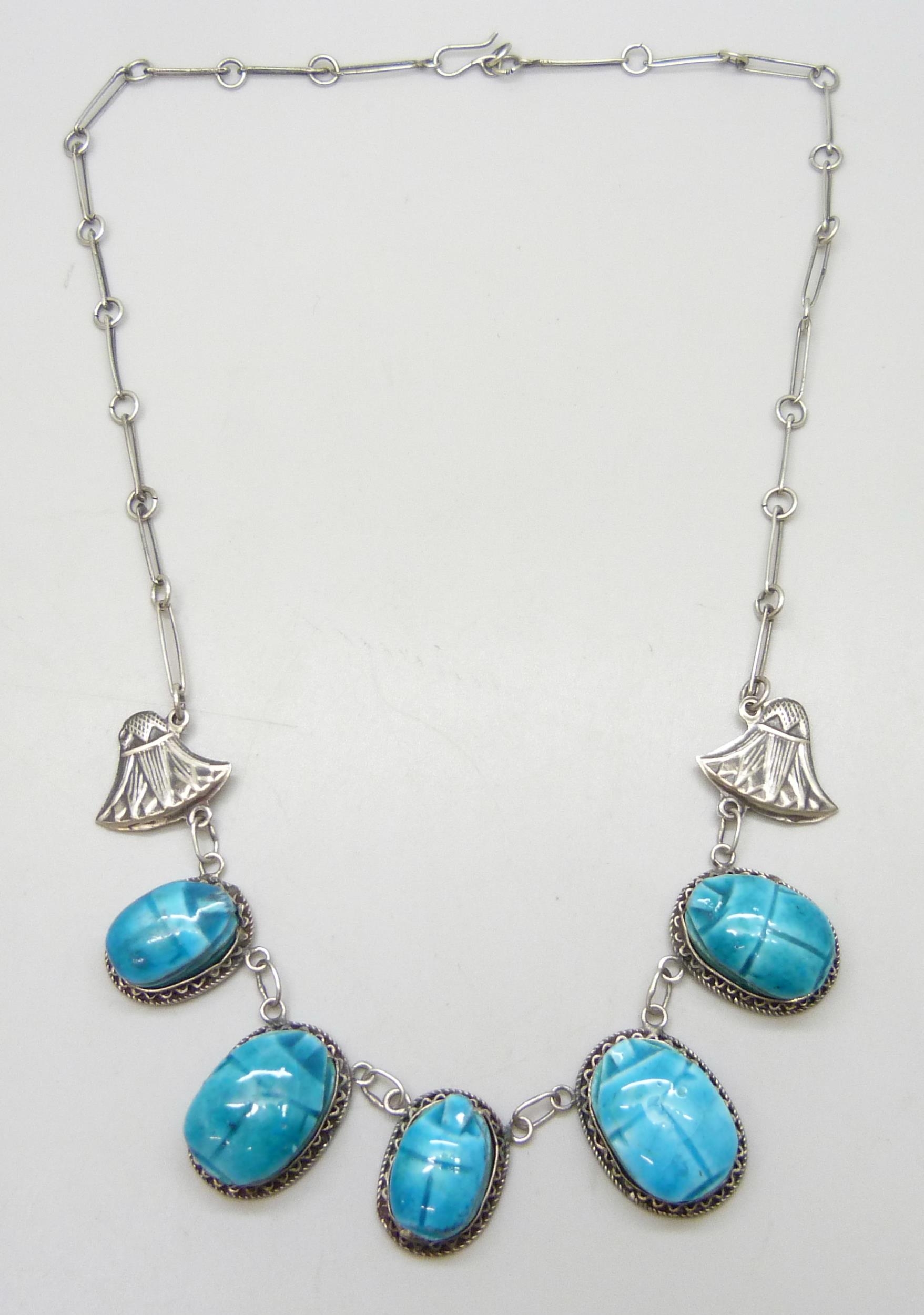 A white metal Egyptian necklace set with scarab beetles, control marks verso, 37g, 50cm