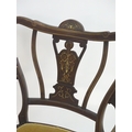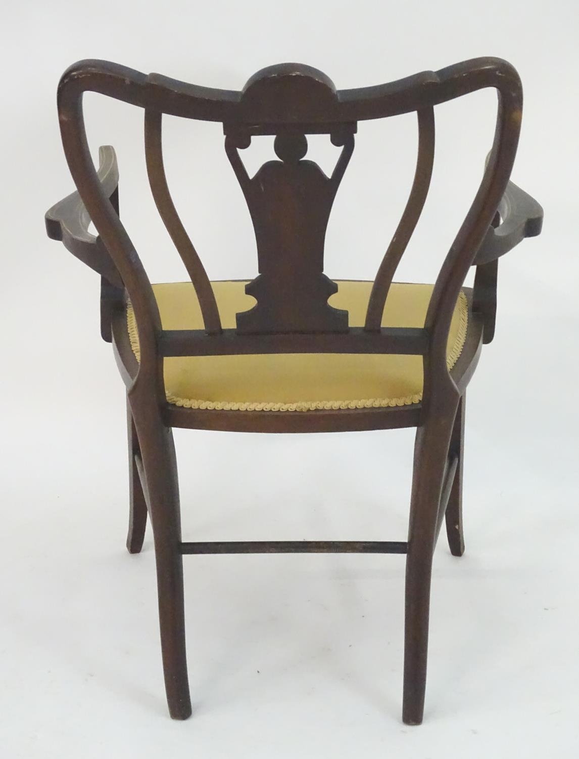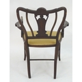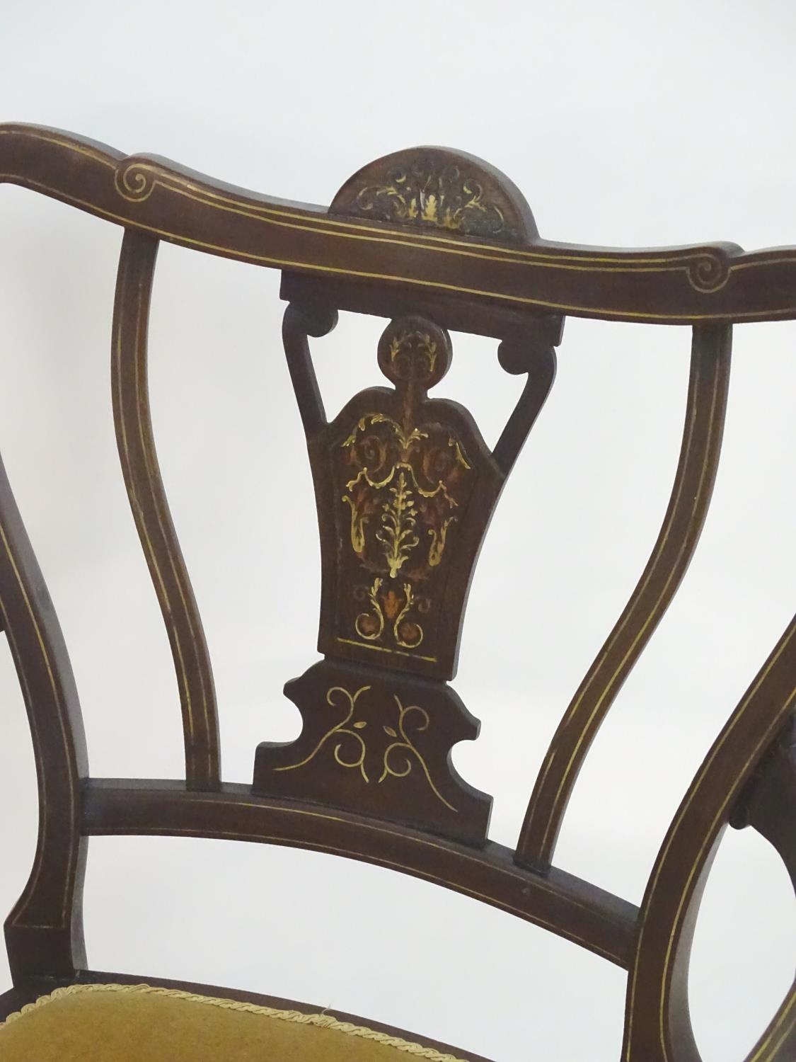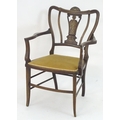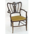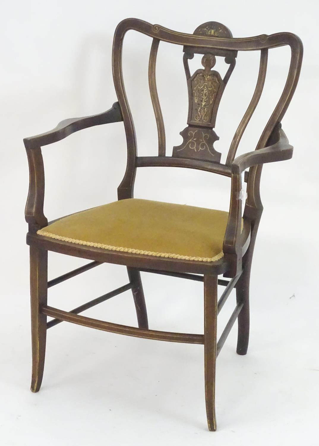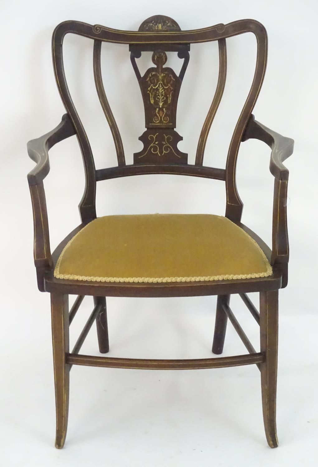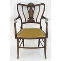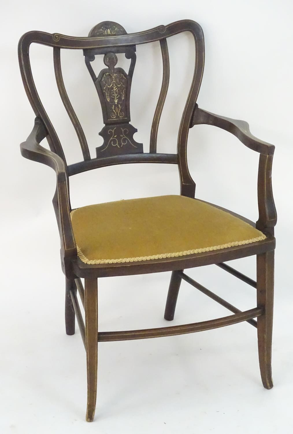 An Edwardian marquetry inlaid chair, with a shaped backrest, swept arms and standing on tapering legs united by a box stretcher. 25" wide x 22" deep x 35" high.