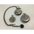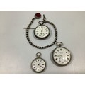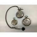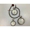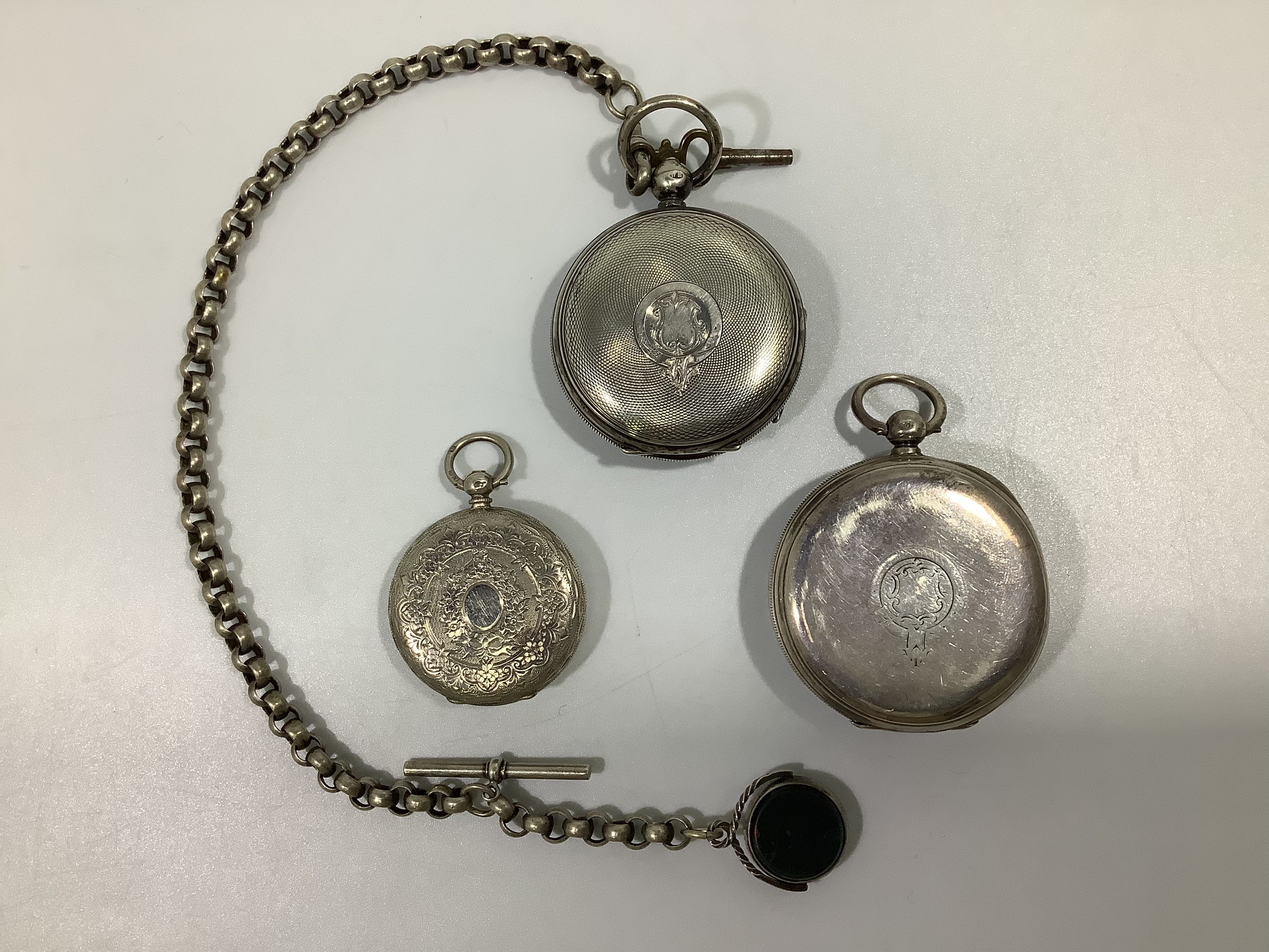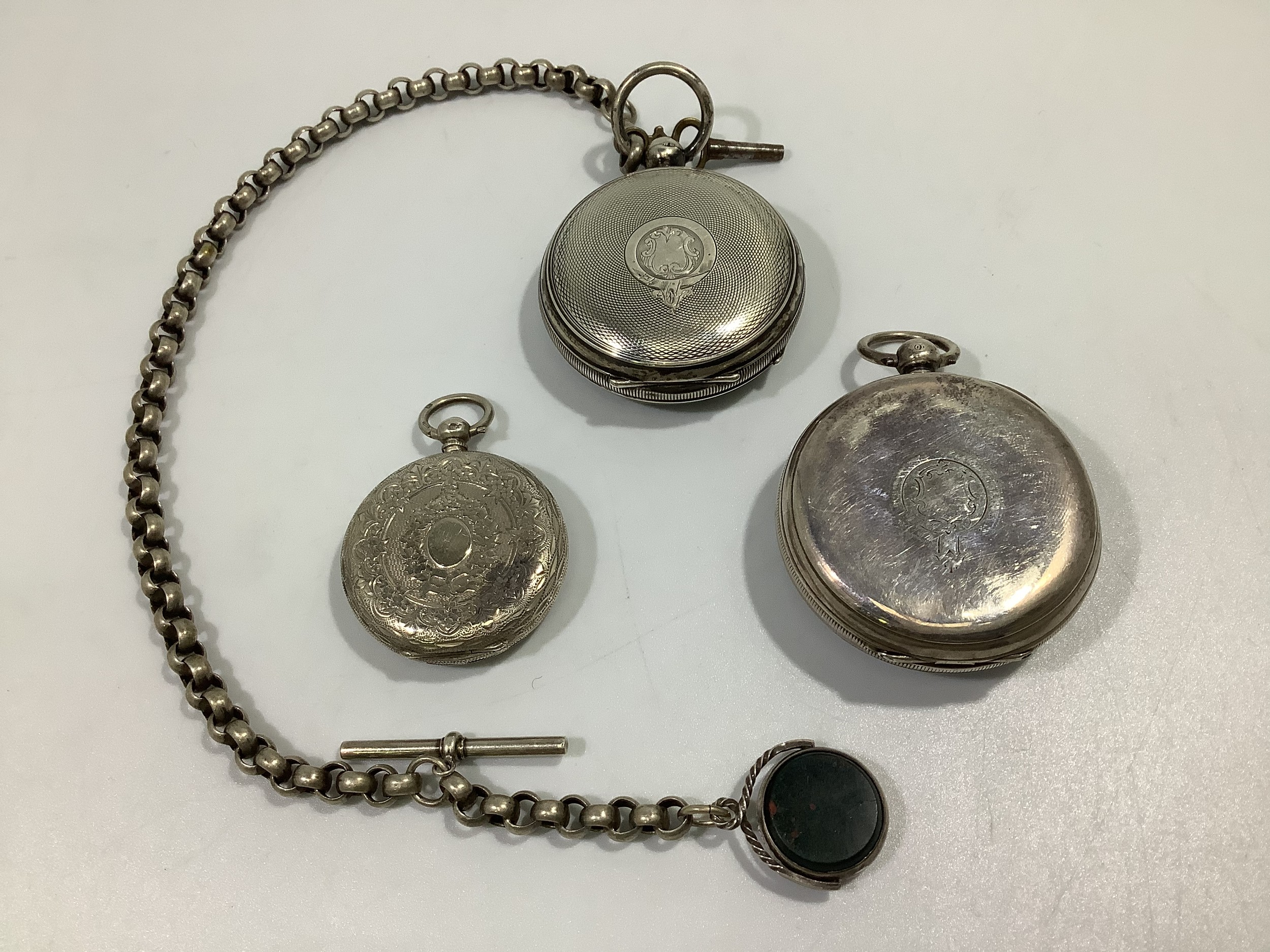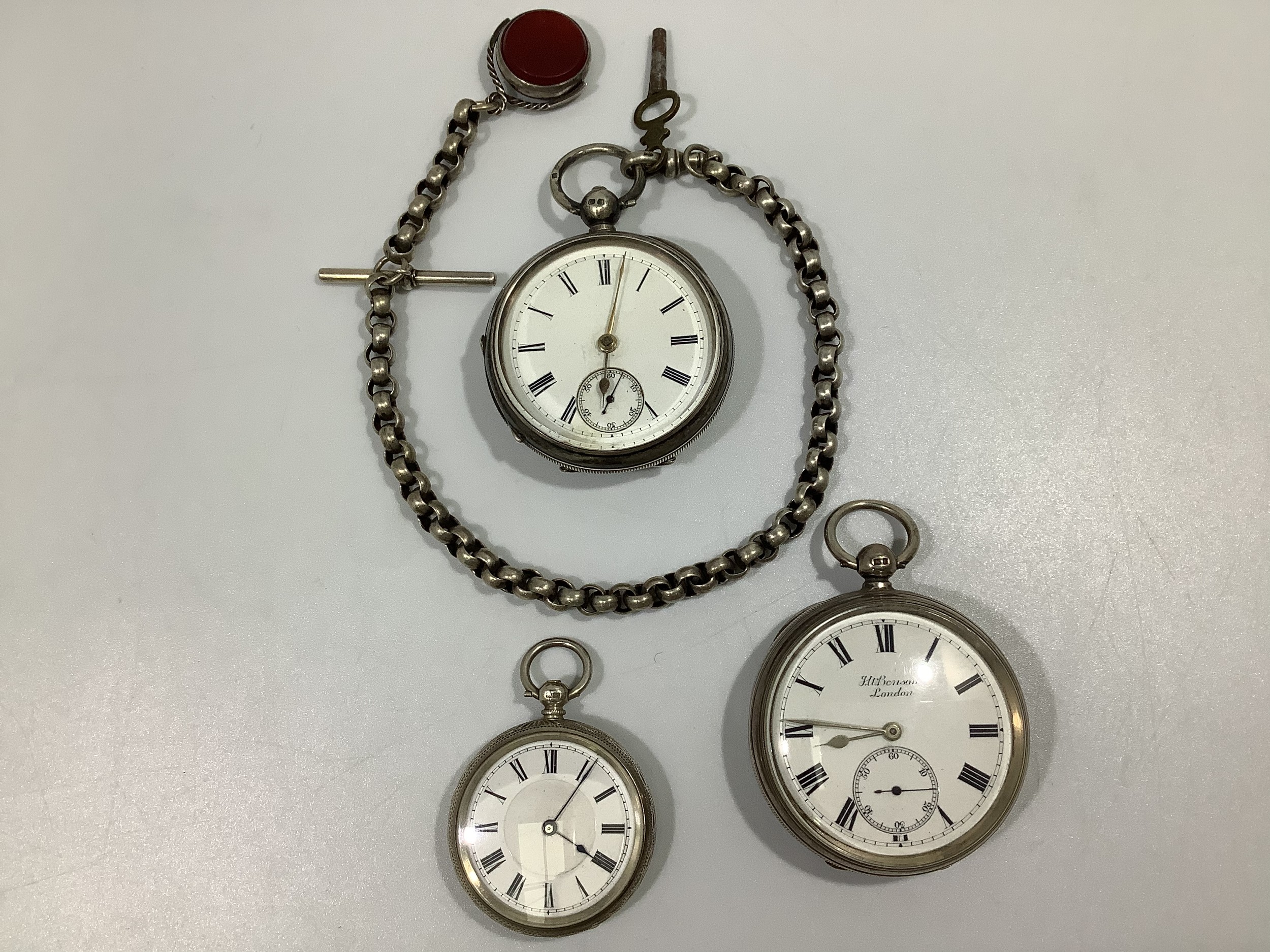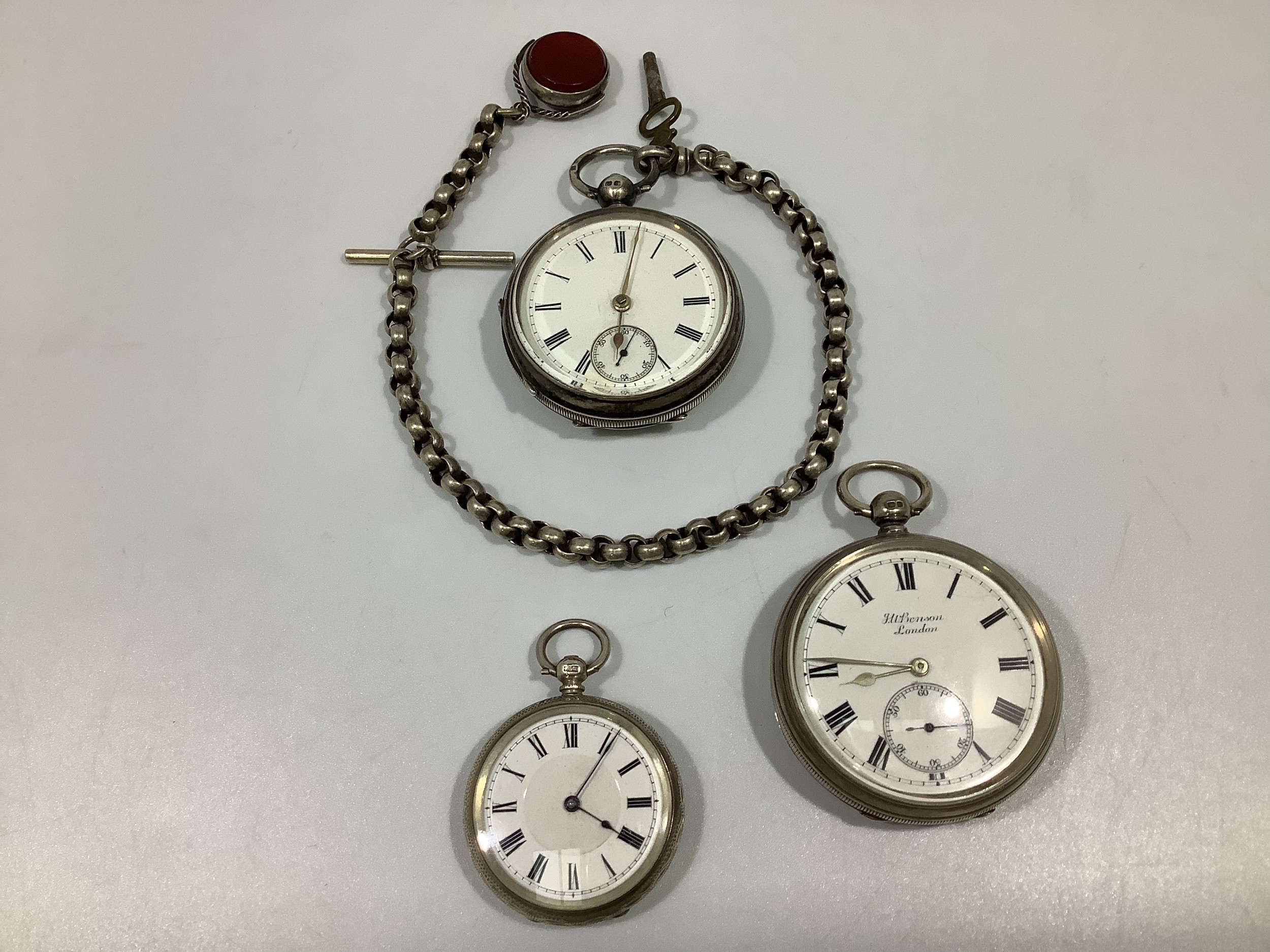 Three various silver cased open-face pocket watches, including a J W Benson example with Roman numerals denoting hours and subsidiary seconds dial, one with silver Albert chain, t-bar and swivelling fob