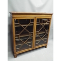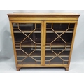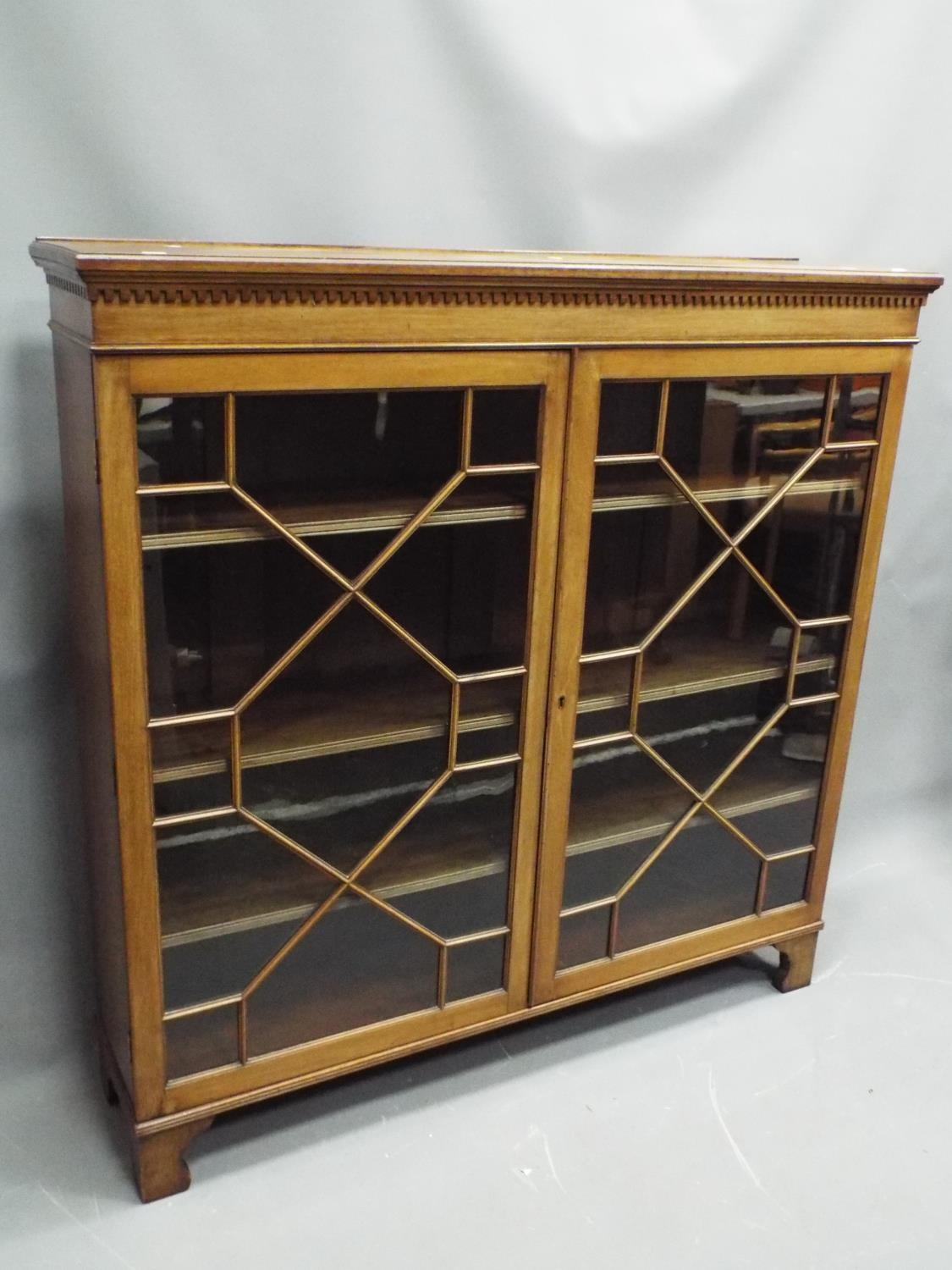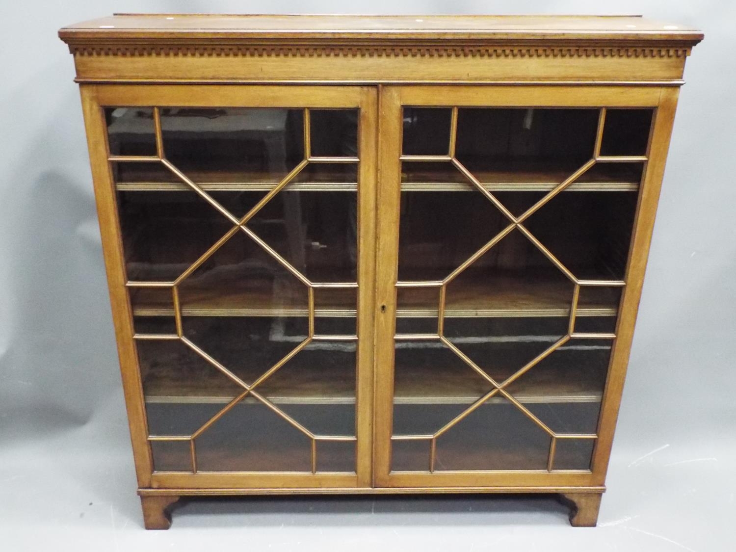 Hansome 1940's glass fronted bookshelf or display cabinet, Dentil moulding to top raised on bracket feet. H:49 x W:48 x D:12 inches. Adjustable wooden shelves.