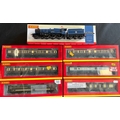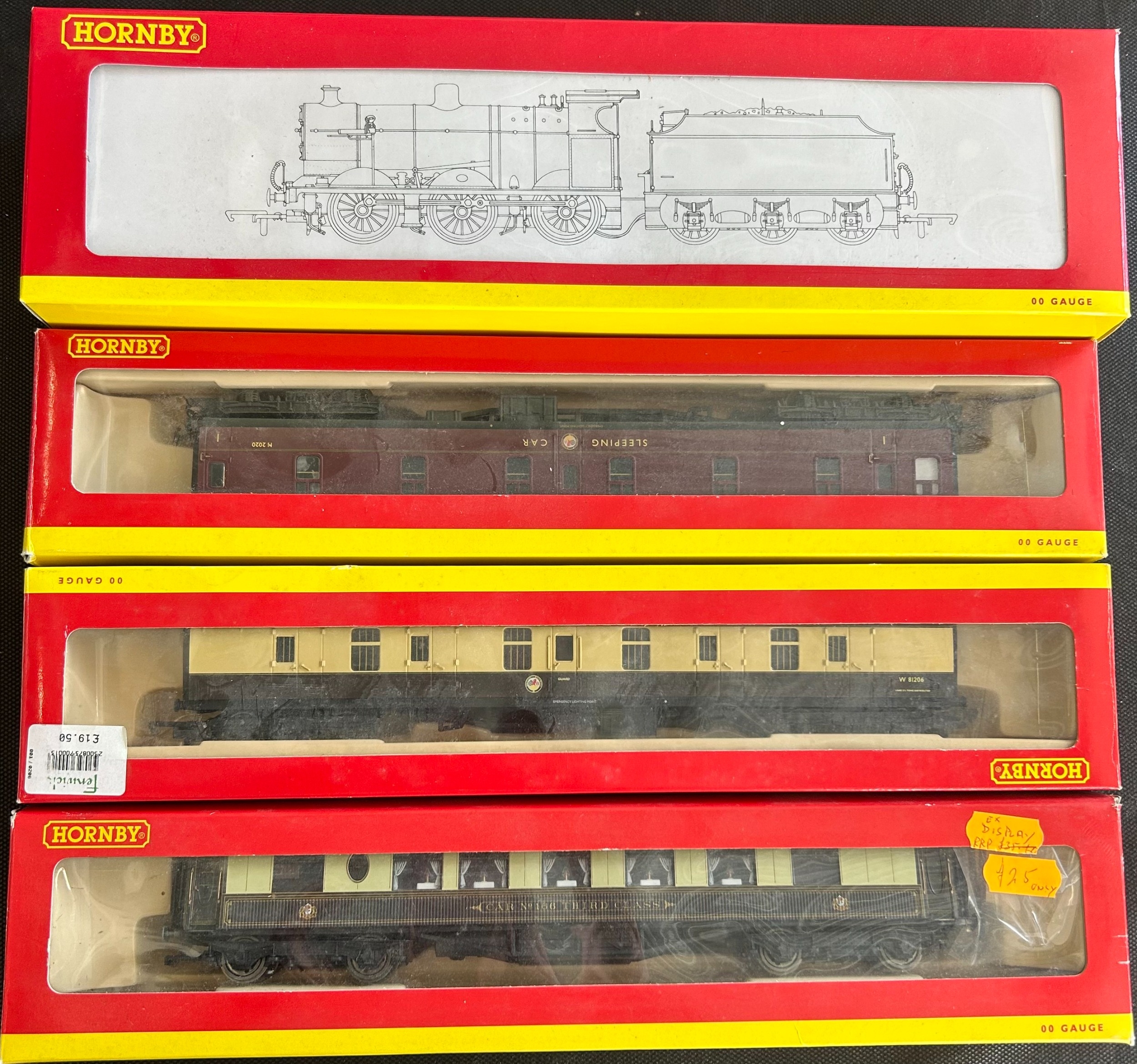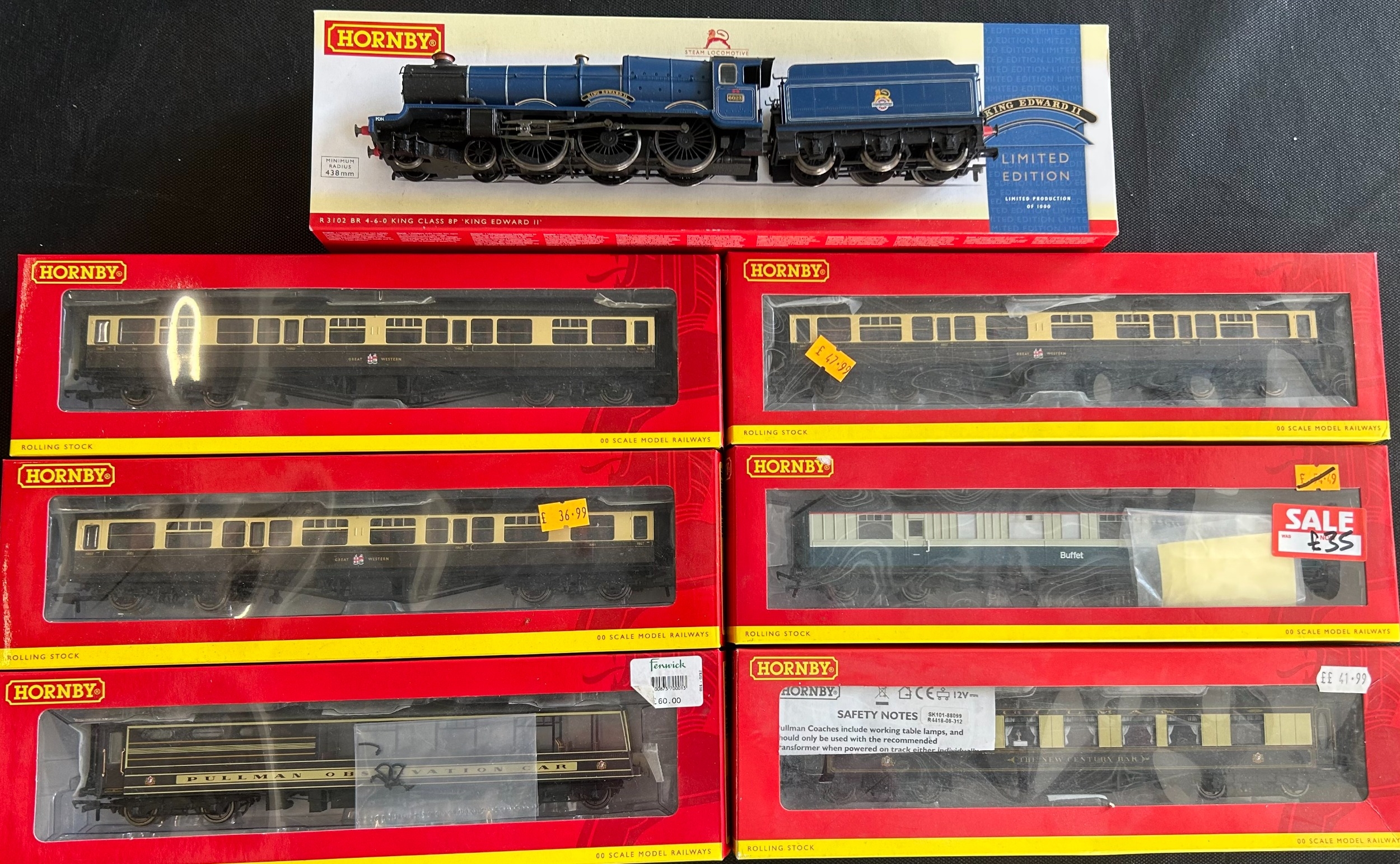 A quantity of Hornby OO Railway. A BR King Class 4-6-0 tender locomotive 'King Edward II' 6023 (R.3102). An LMS Fowler Class 4F 0-6-0 tender locomotive 4312 (R.3030). Together with 9 passenger coaches including a BR MkI Sleeping Car, a PULLMAN Observation Car, 2x PULLMAN Cars, 'New Century Bar' and 'Car No.166 3rd Class'. A BR (ER) Buffet Coach. A BR (WR) MKI Parcels Coach, etc. All boxed, minor wear, light cleaning required. Contents VGC (11).
