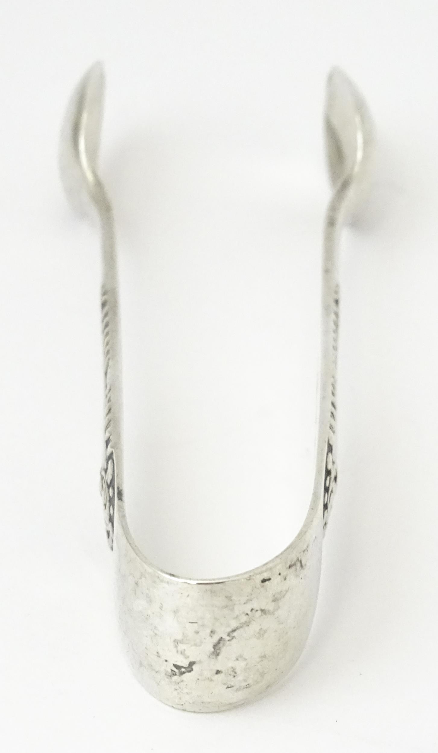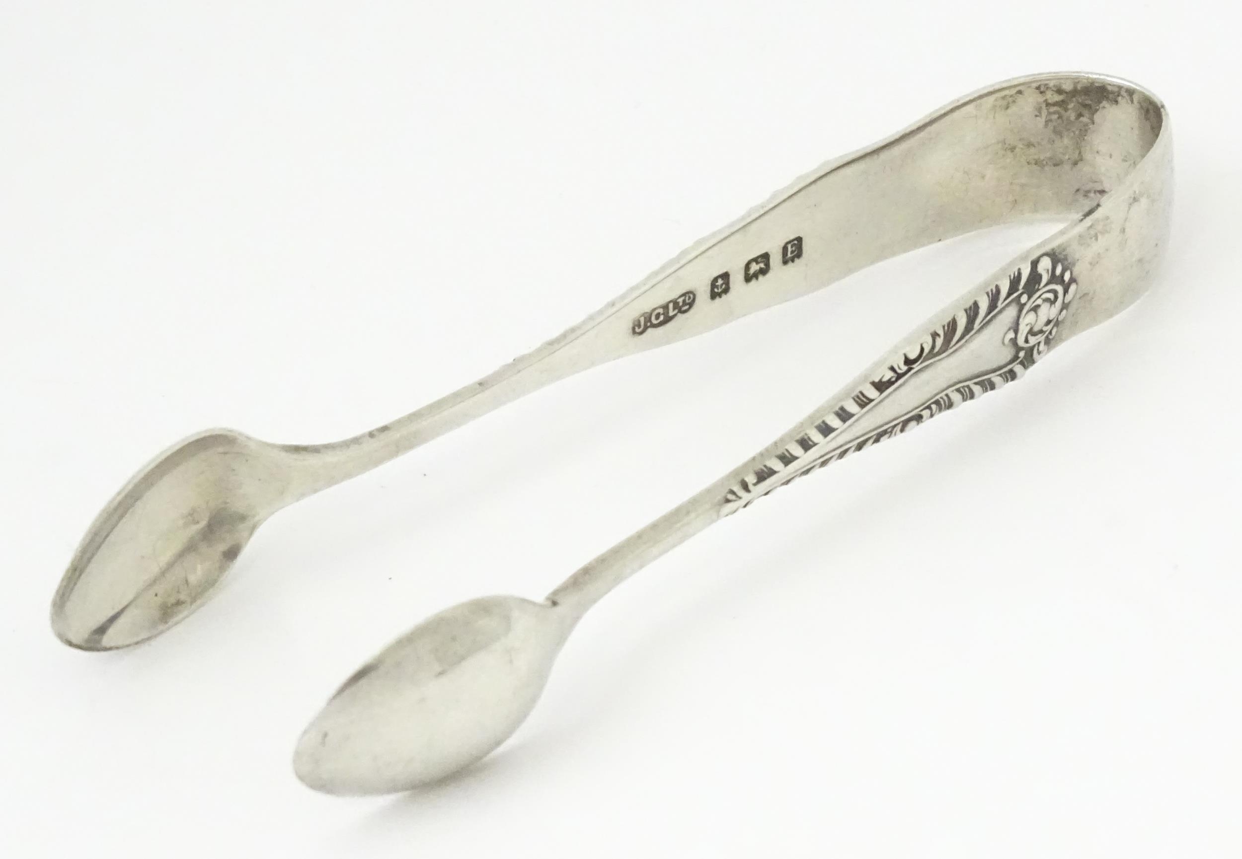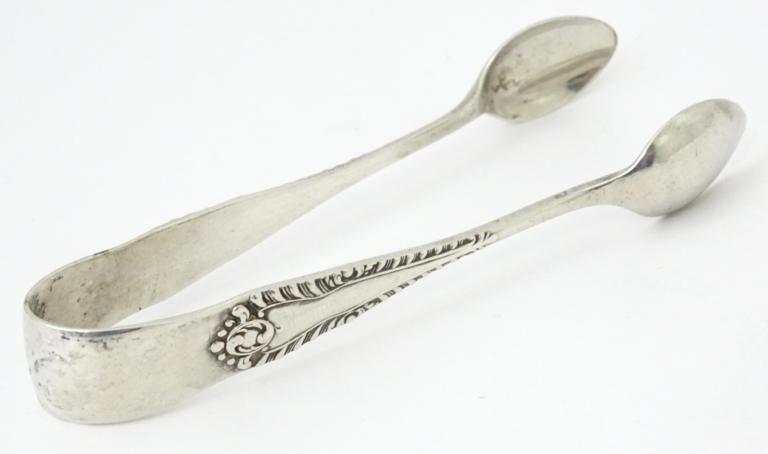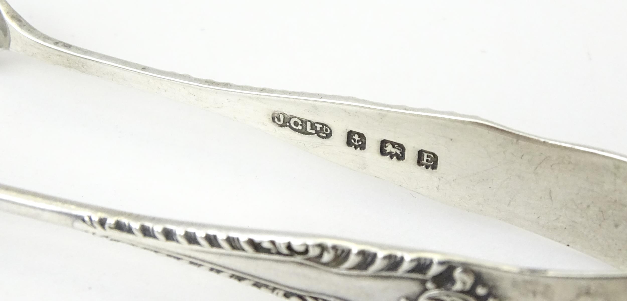 Silver sugar tongs with engraved decoration, hallmarked Birmingham 1929, maker Joseph Gloster Ltd. Approx. 3 3/4" long